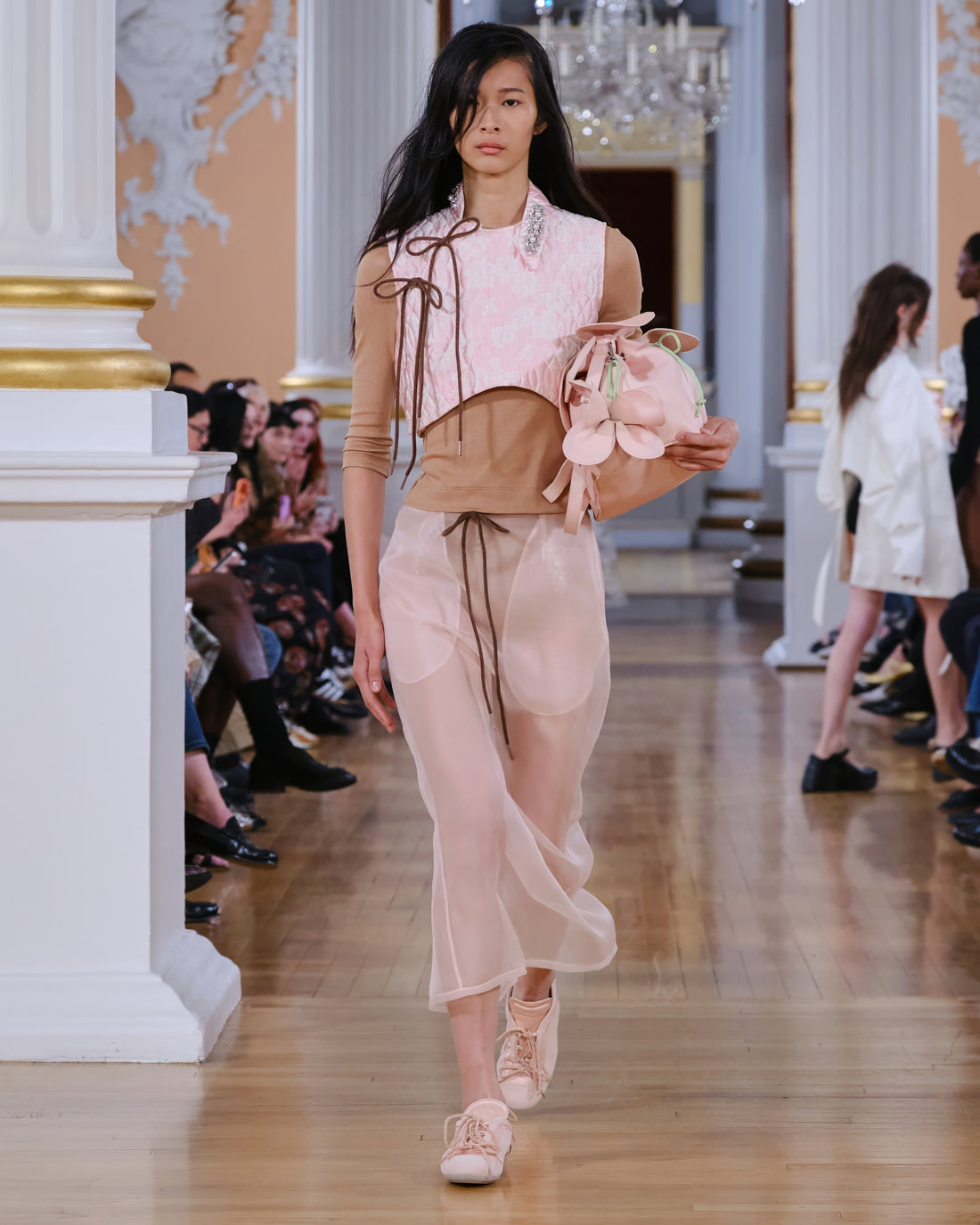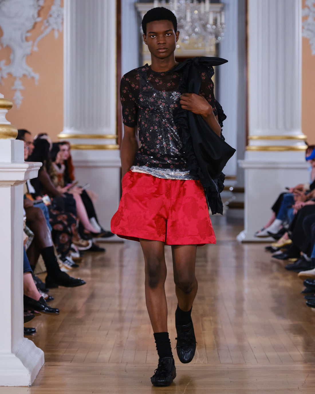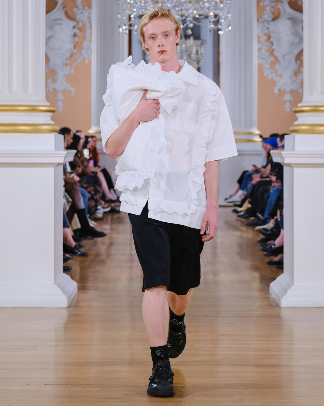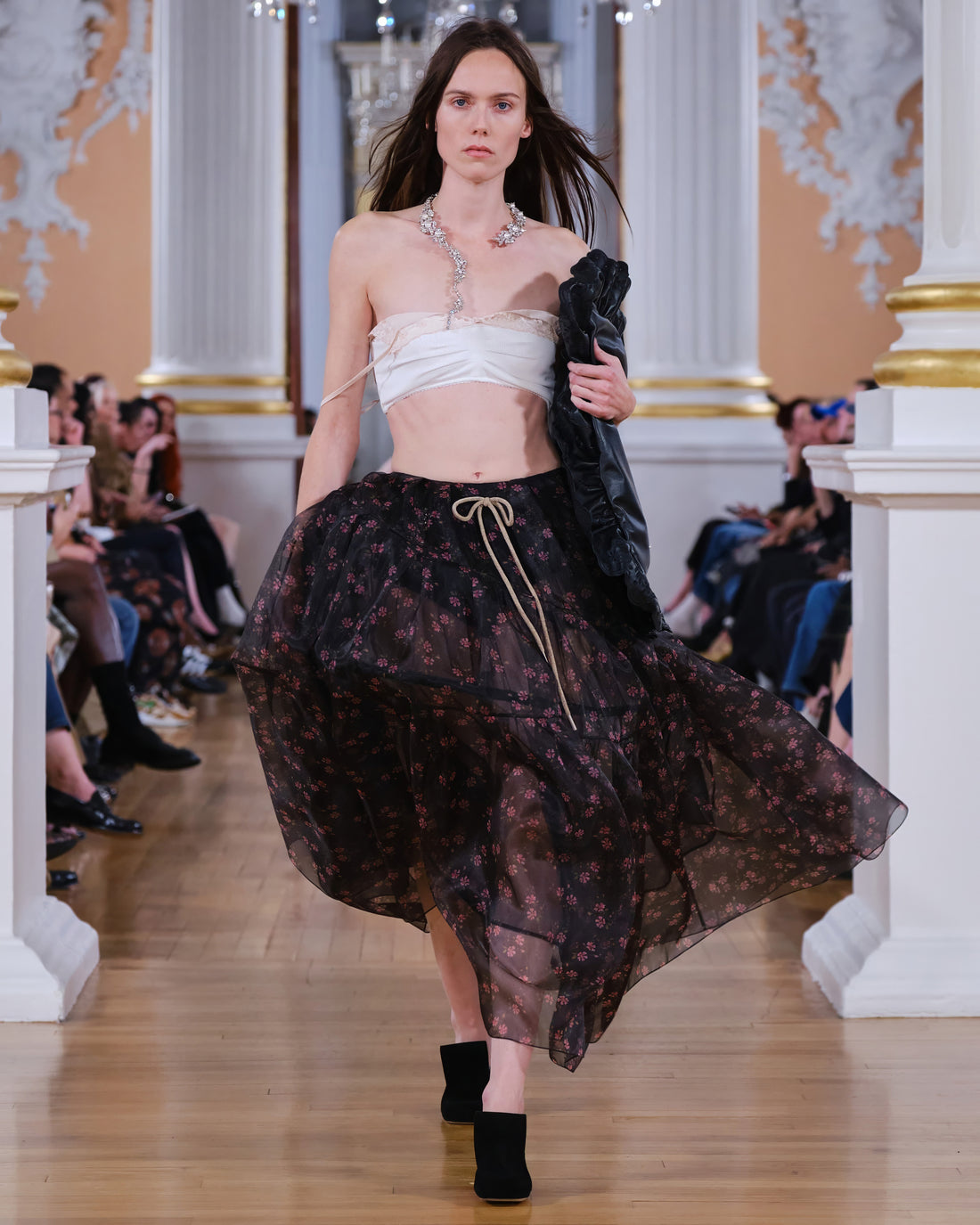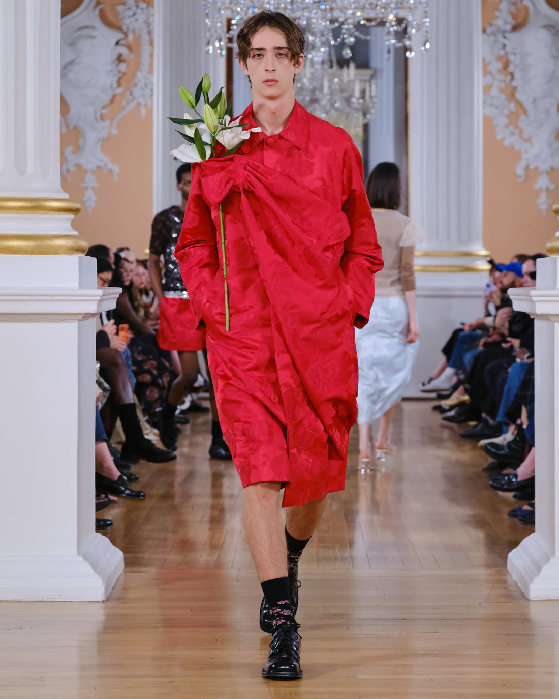 16 exaggerated red cagoule over ivory organza hoop skirt