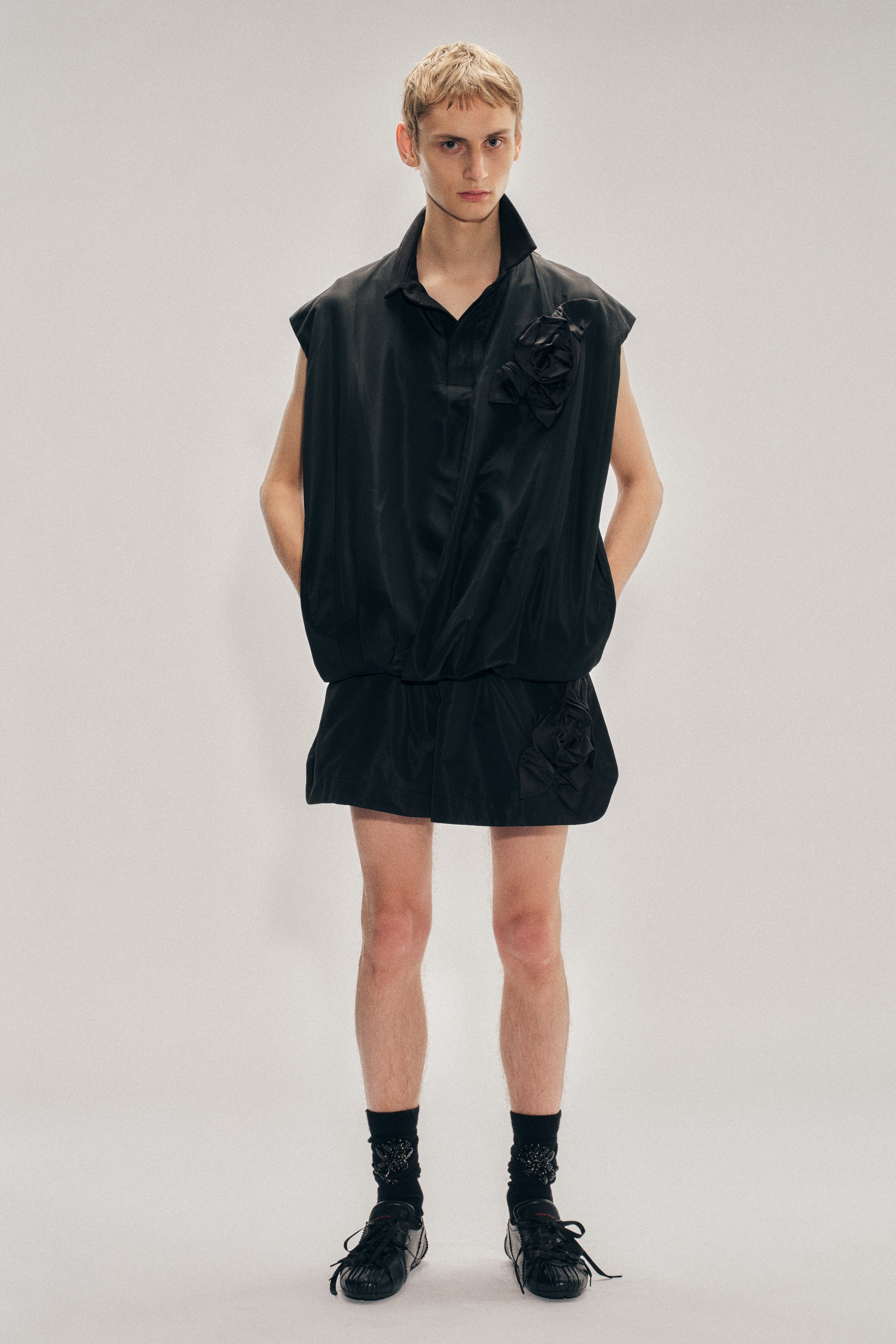 A draped taffeta sleeveless top featuring a seasonal pressed rosette at the front. It features a ribbed collar for a sporty feel.