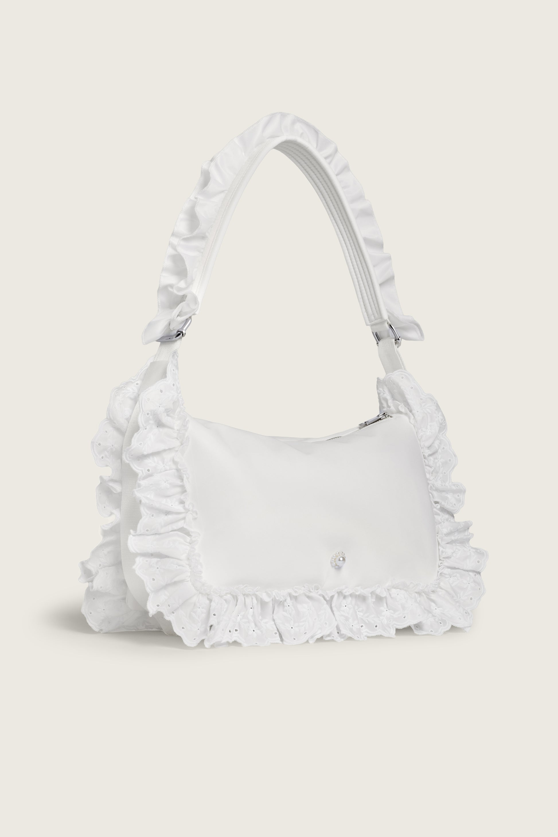 In line with the season's theme, this shoulder bag is crafted in durable nylon for utility. A ruffled strap and embroidered trims evoke a pillowcase, adding an inspired touch.