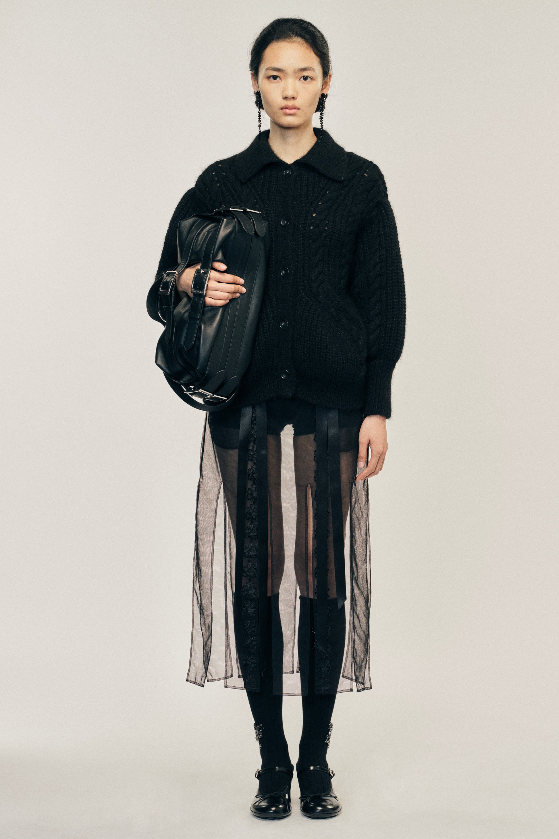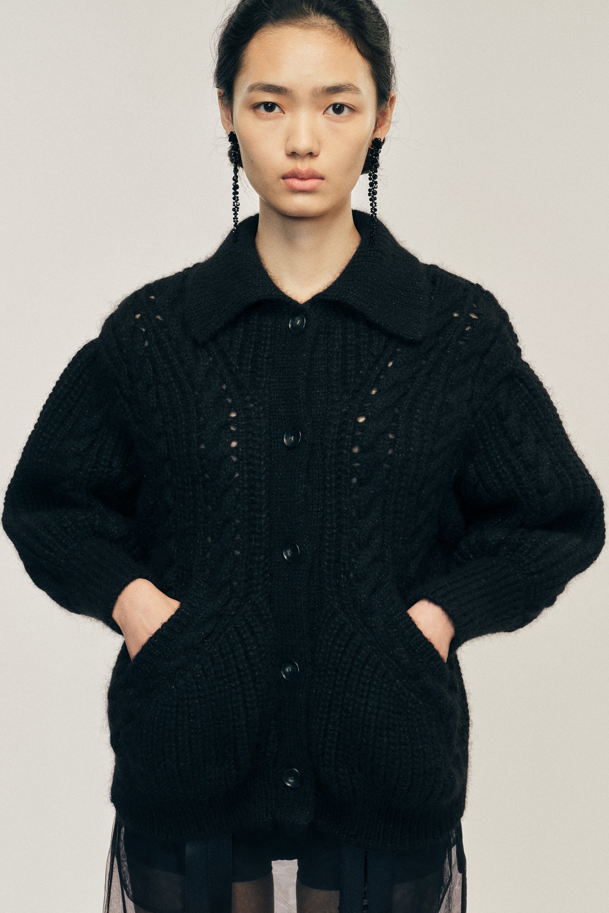 A collared cardigan knit from a chunky alpaca blend yarn, it features a sculpted shape with front pockets. This versatile piece can also be worn as a light jacket. The model is wearing this style with the Ribbon Daisy Chain Multi Slit Skirt.
