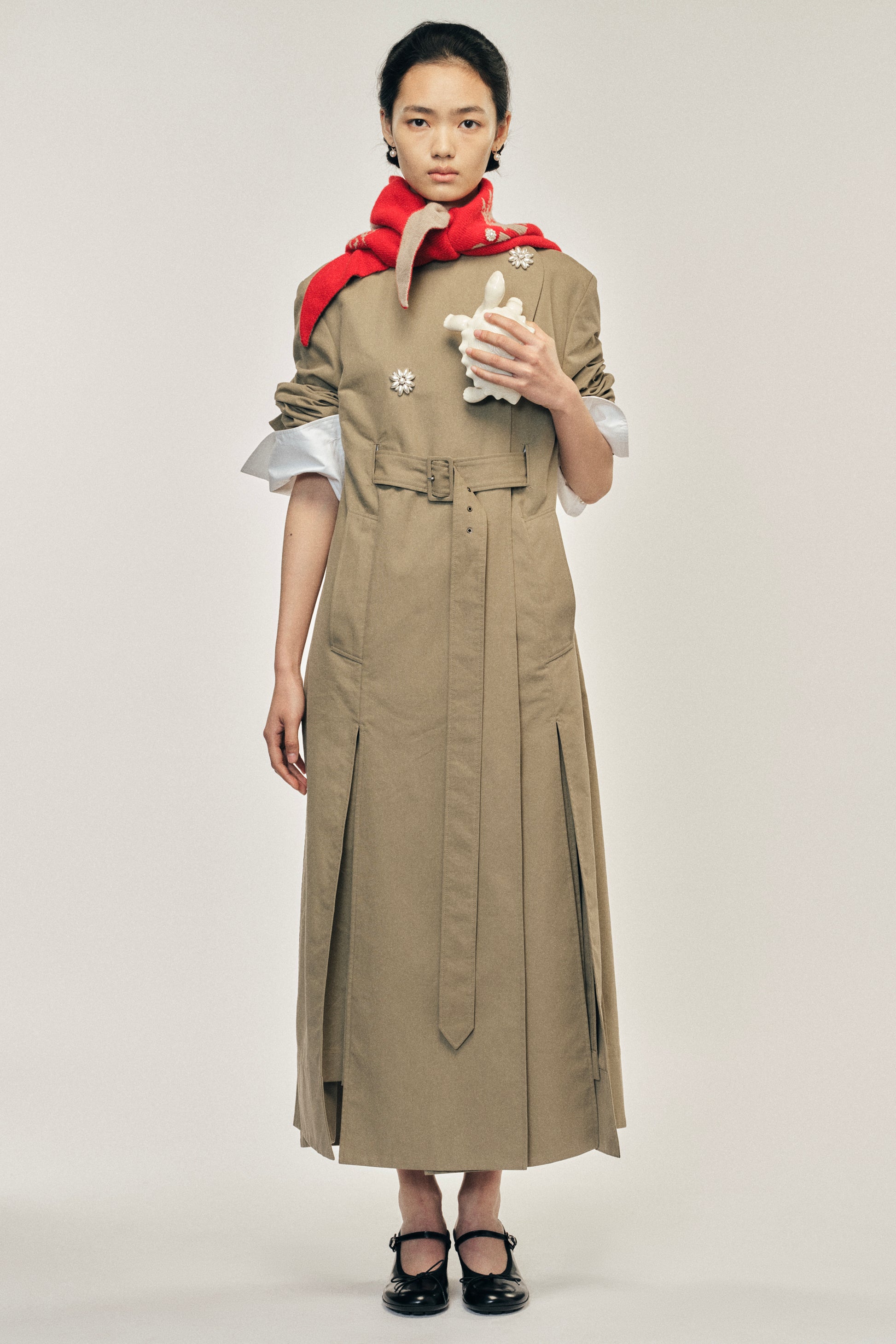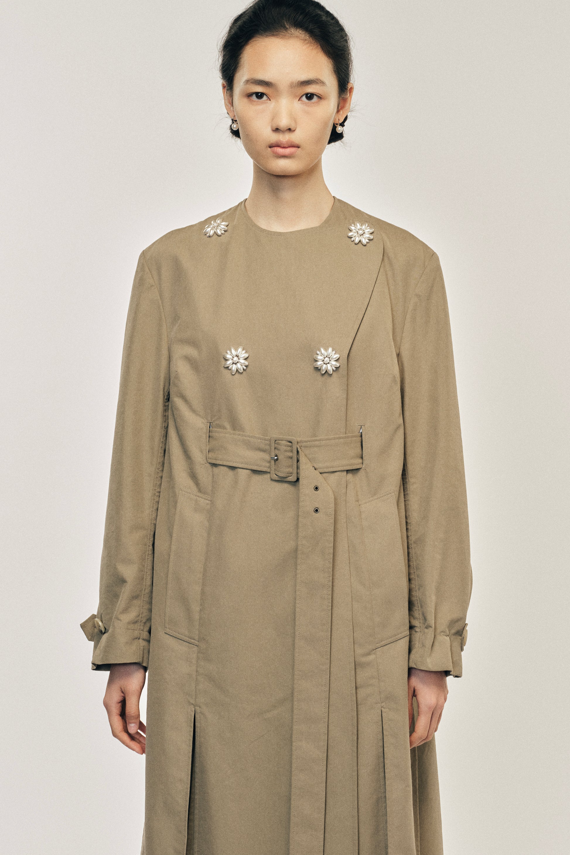 A collarless trench coat featuring slits that have been heavily featured in the collection. The snap flower pearl buttons add a signature touch to the classic trench twill fabrication.