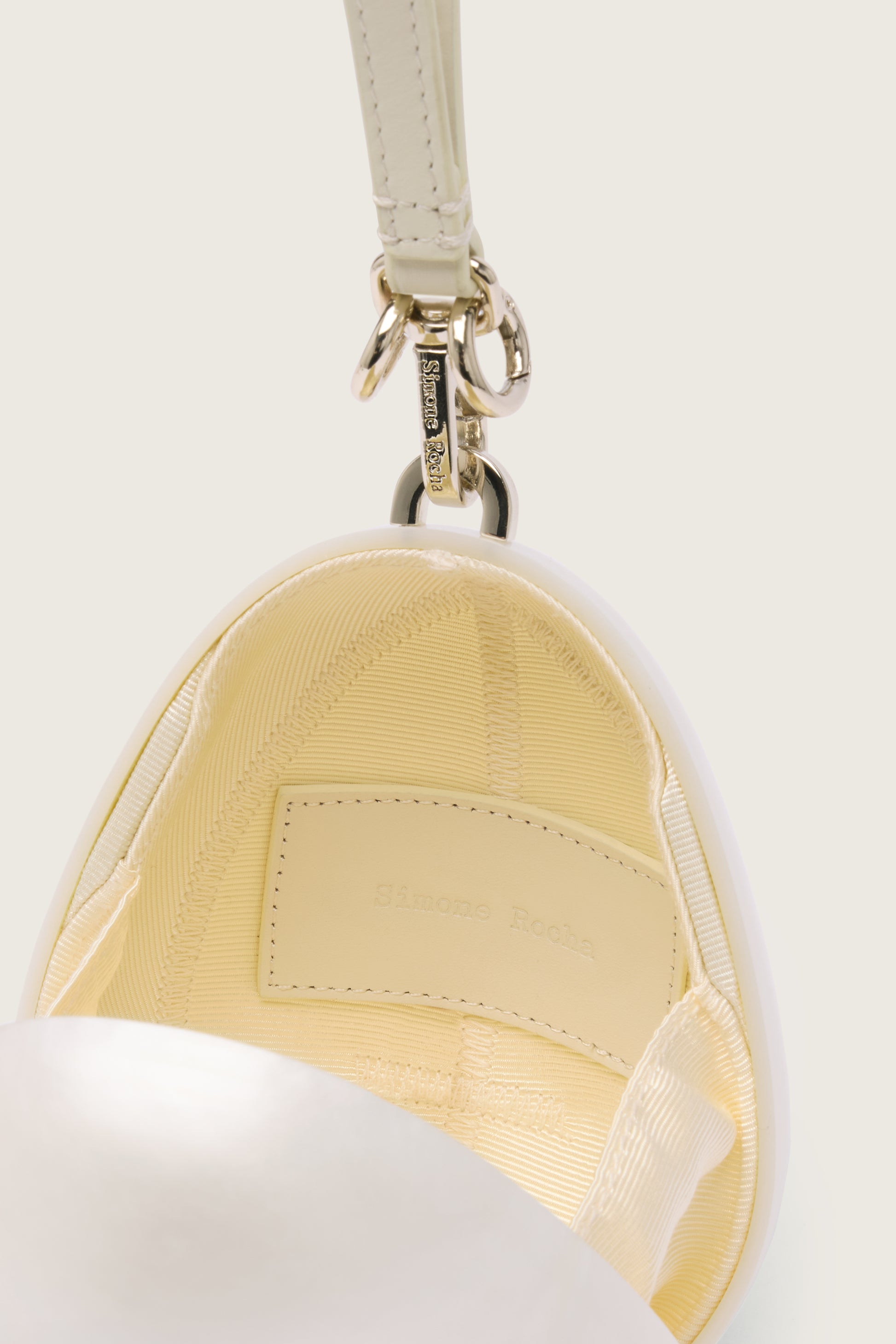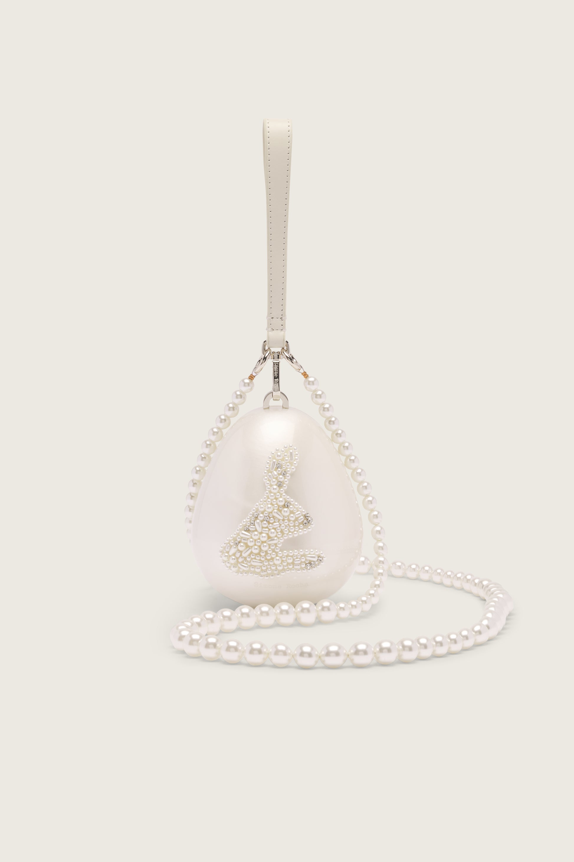 Adorning the front of the brand cult pearl egg bag is an intricate hare motif made of pearl and crystals. Attached at the top of the bag is a long strand of pearls that function as a crossbody strap.