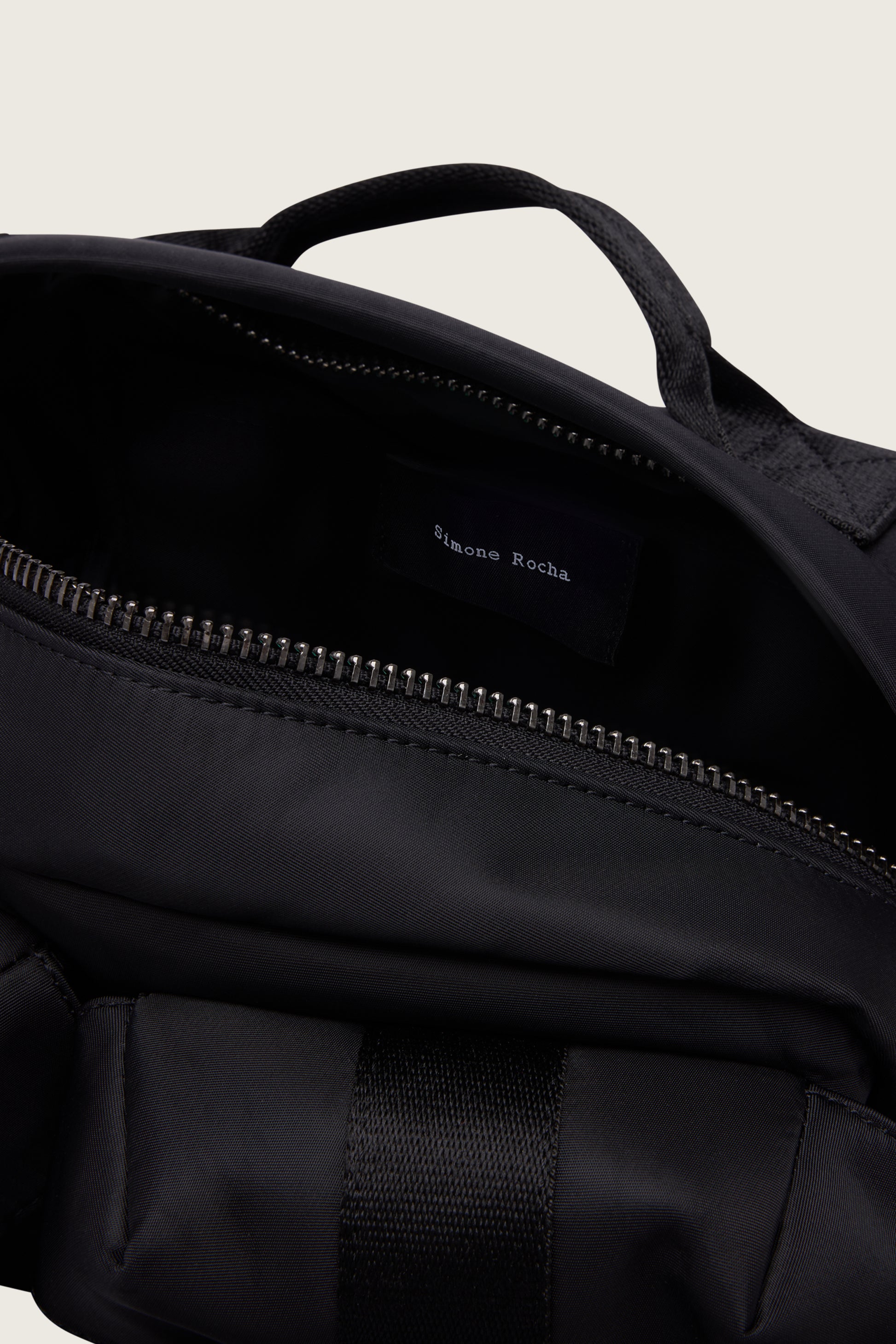 The signature Simone Rocha nylon crossbody bag, it features an embellished adjustable strap adorned with signature jet black beading. It has two exterior pockets as well as a main compartment, the perfect everyday bag.