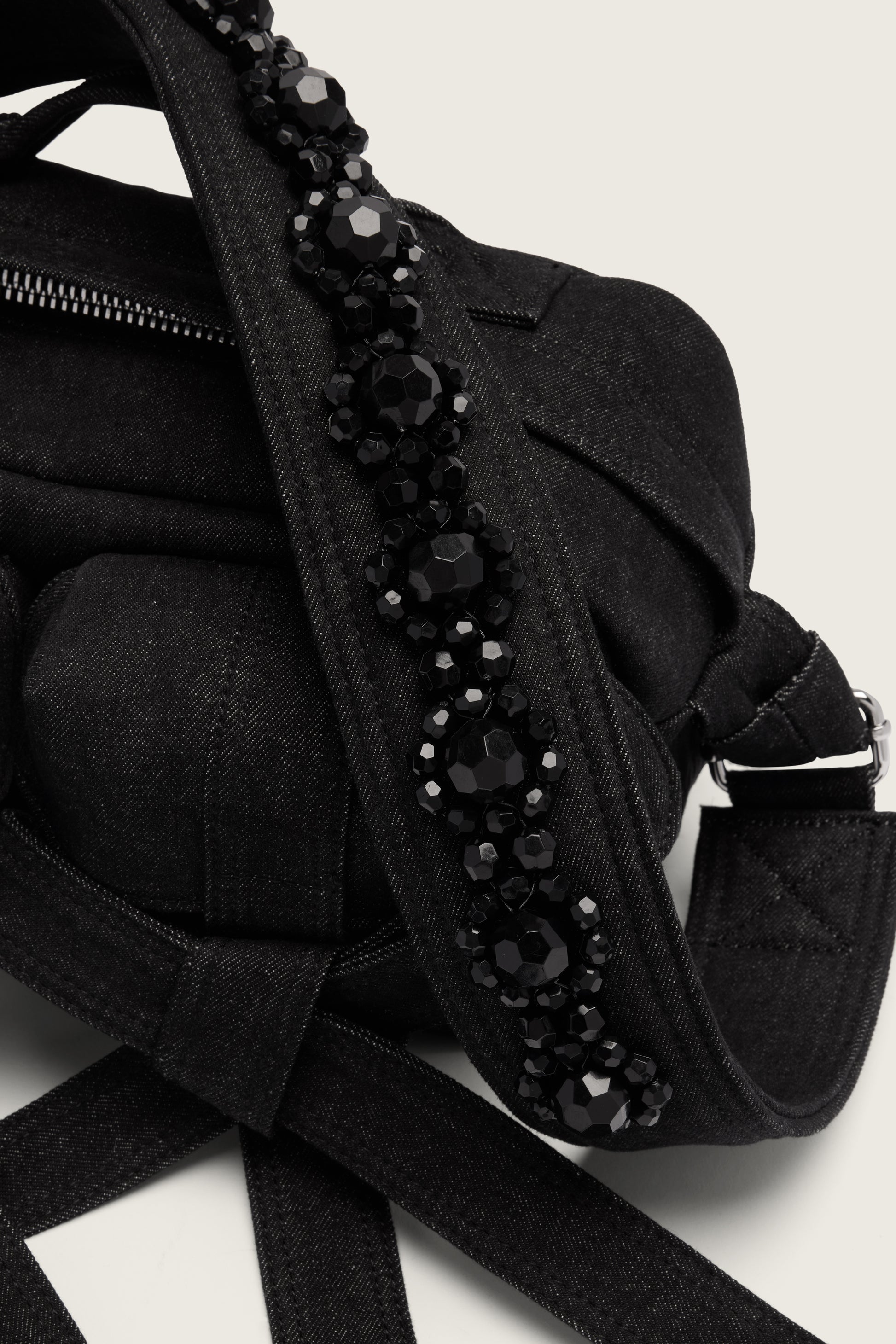 The cult classic camera bag inspired shape has been conceived in a seasonal denim. It features a new pearl and crystal embellishment on the adjustable strap. The main compartment and front pockets with zip closures make this the perfect everyday bag.