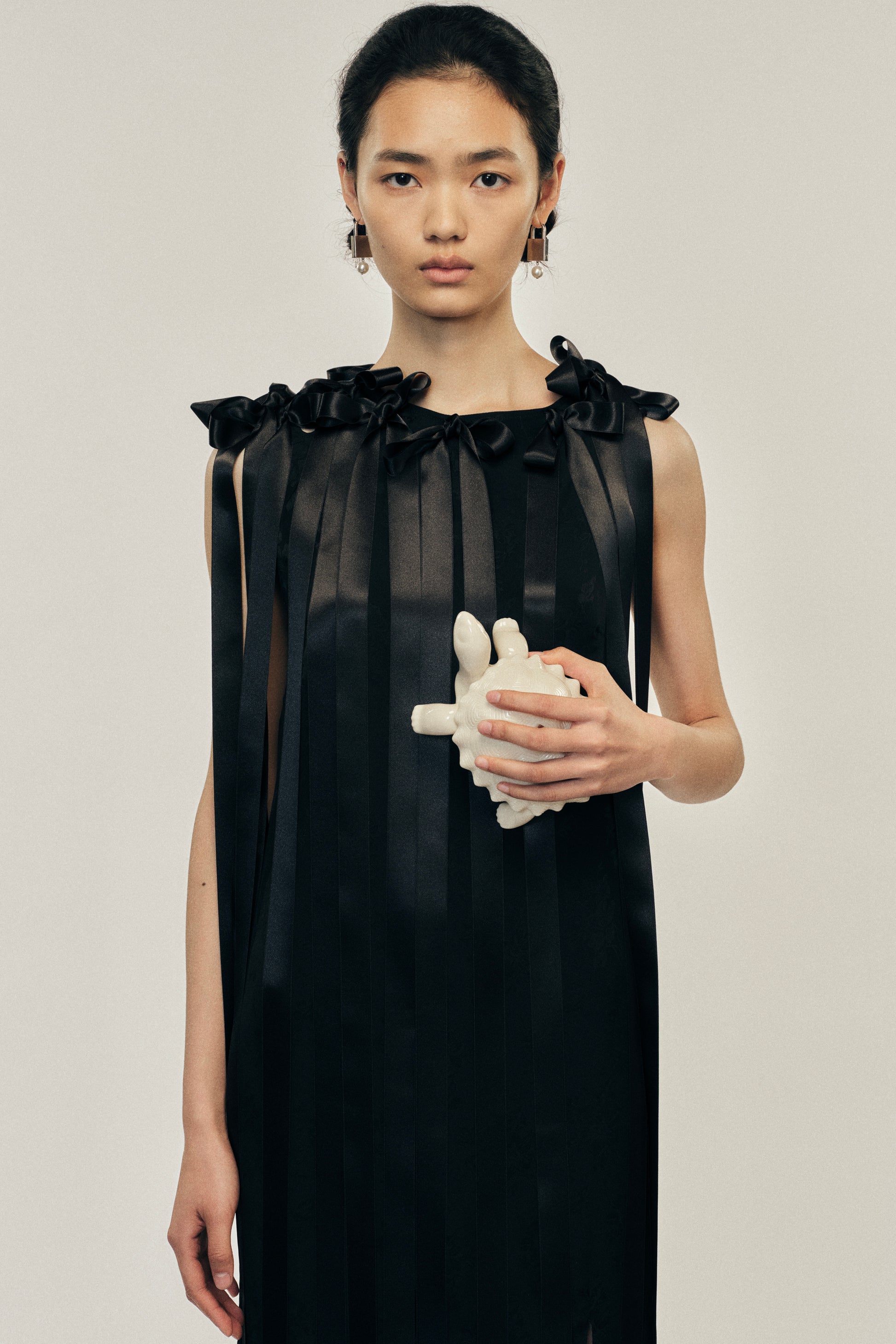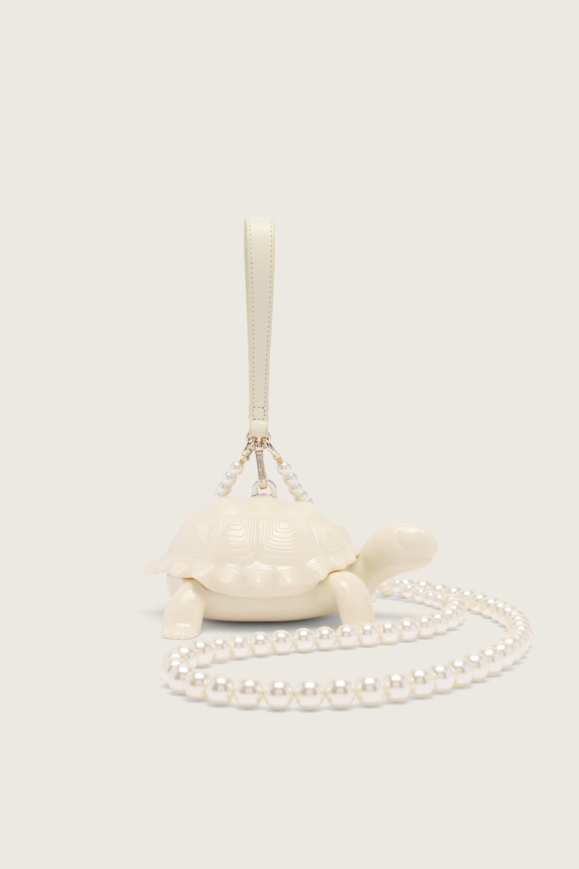 The signature perspex bag is reimagined in a playful tortoise shape. It features a detachable pearl strap that can be worn as a crossbody or wristlet. The magnetic shell functions as the bag's closure.