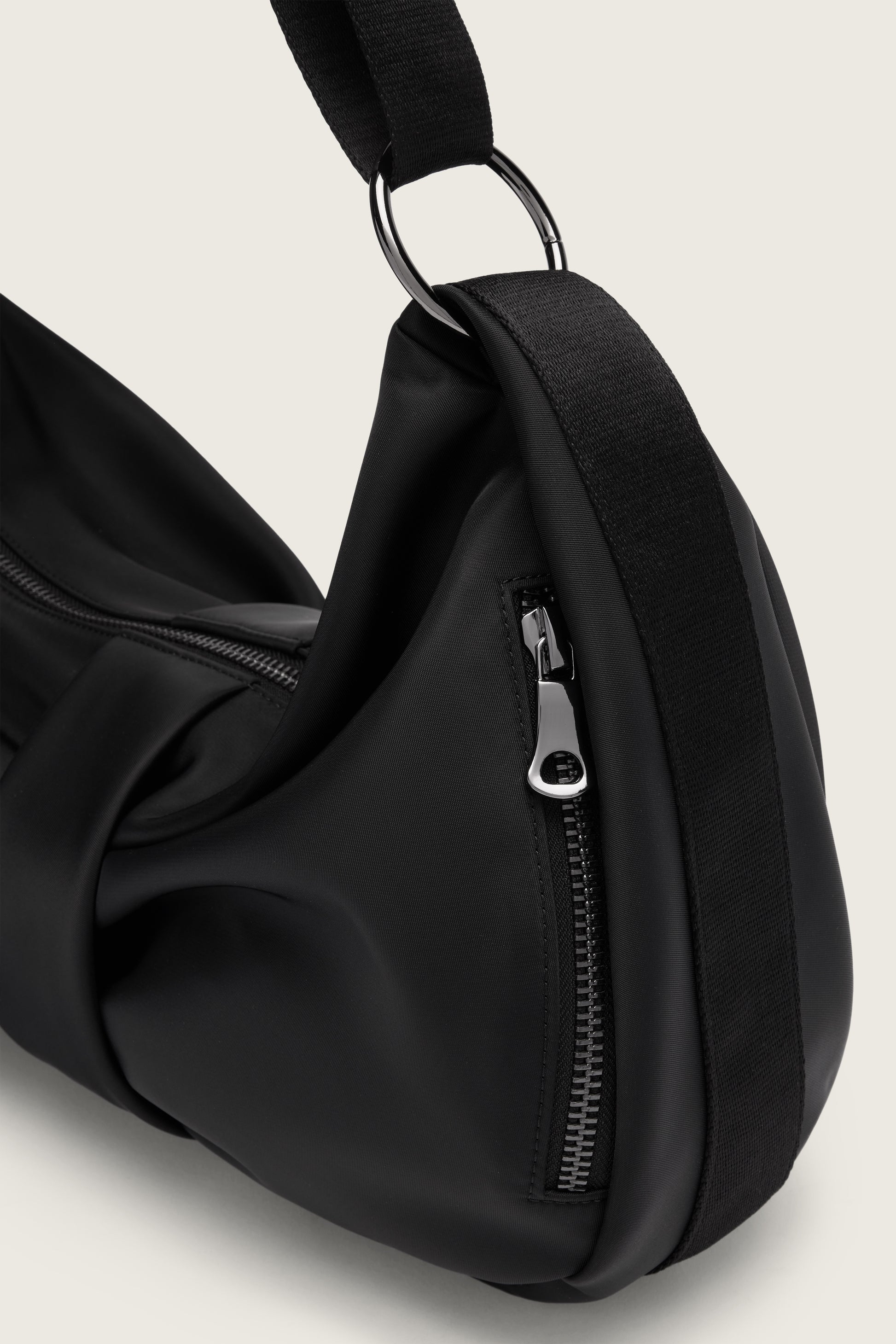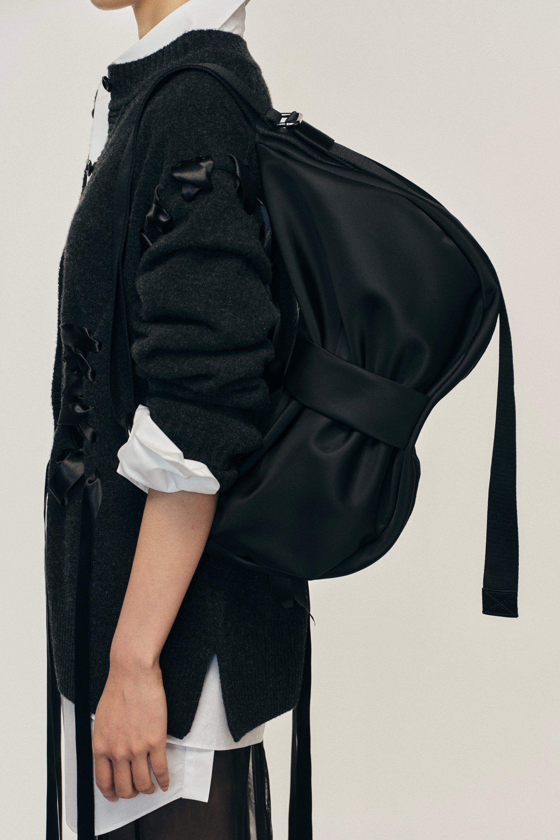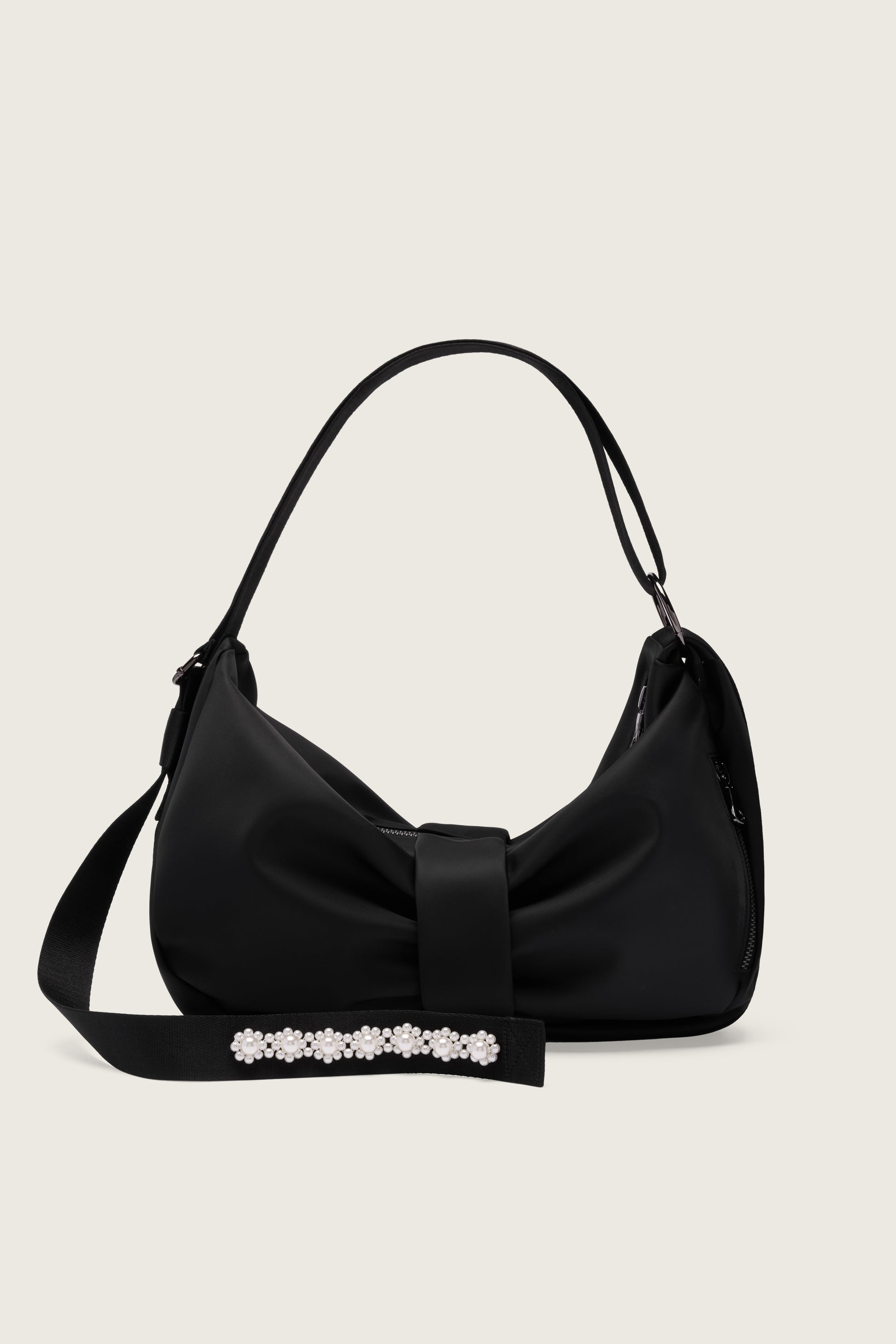 Newest addition to Simone Rocha's Utility bag range, a more playful alliteration for the nylon bag for its bow detail at the front and back. The adjustable shoulder strap features signature faux pearl beading.