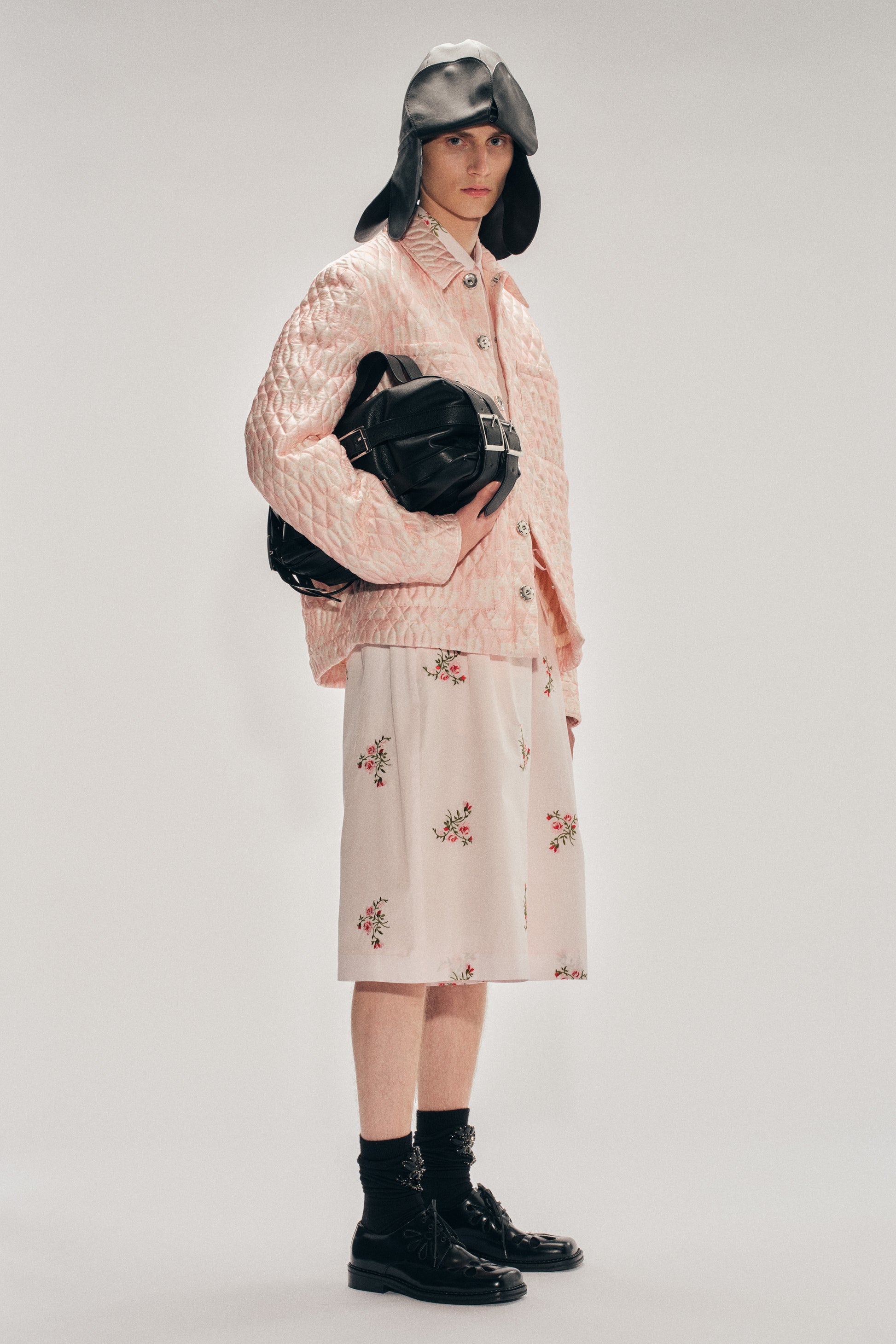 This new duffle bag shape is gathered by two horizontal belt straps at the front that wrap around to give it a relaxed appearance. It features a top handle as well as a longer strap to wear over the shoulder.