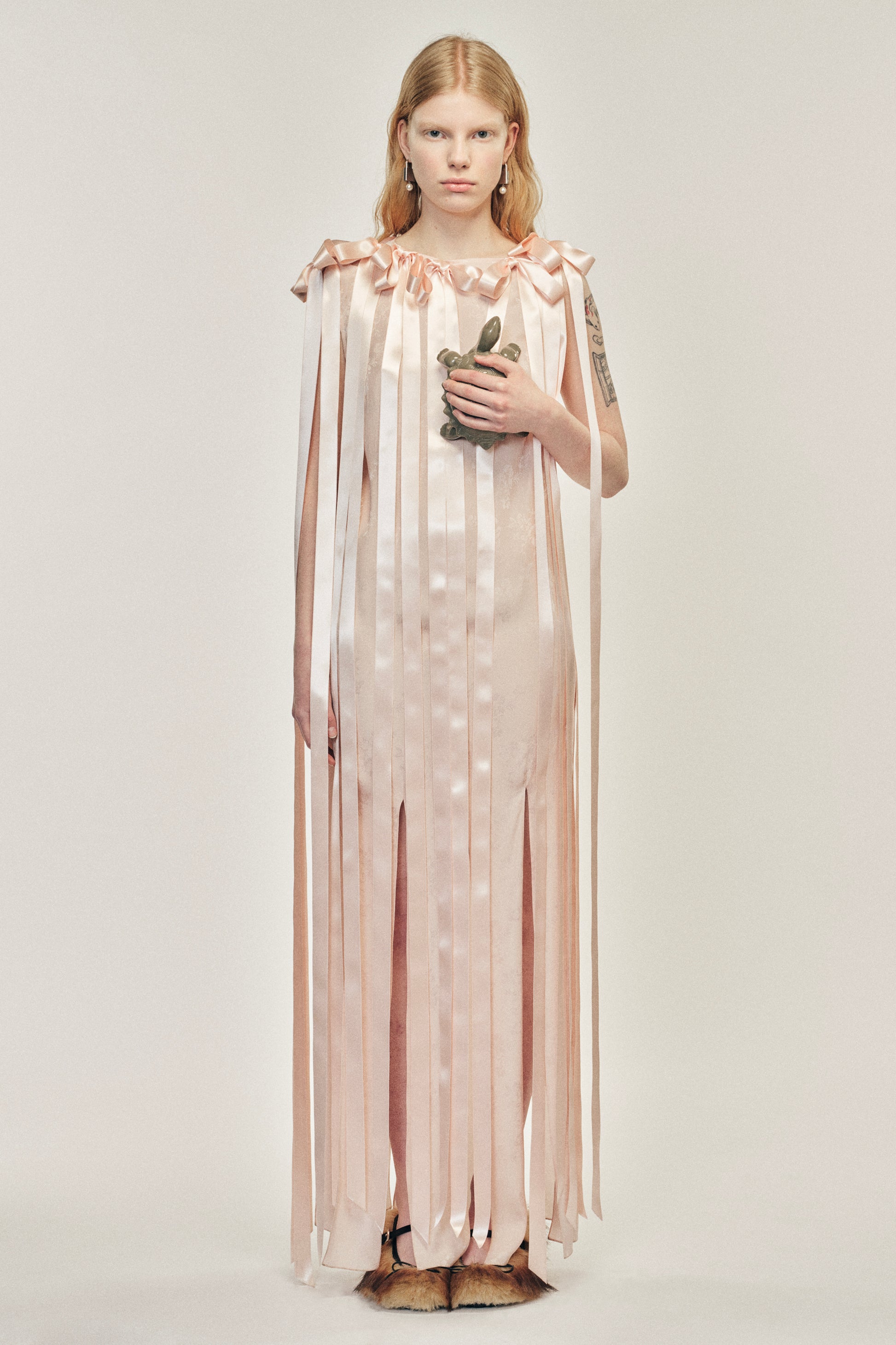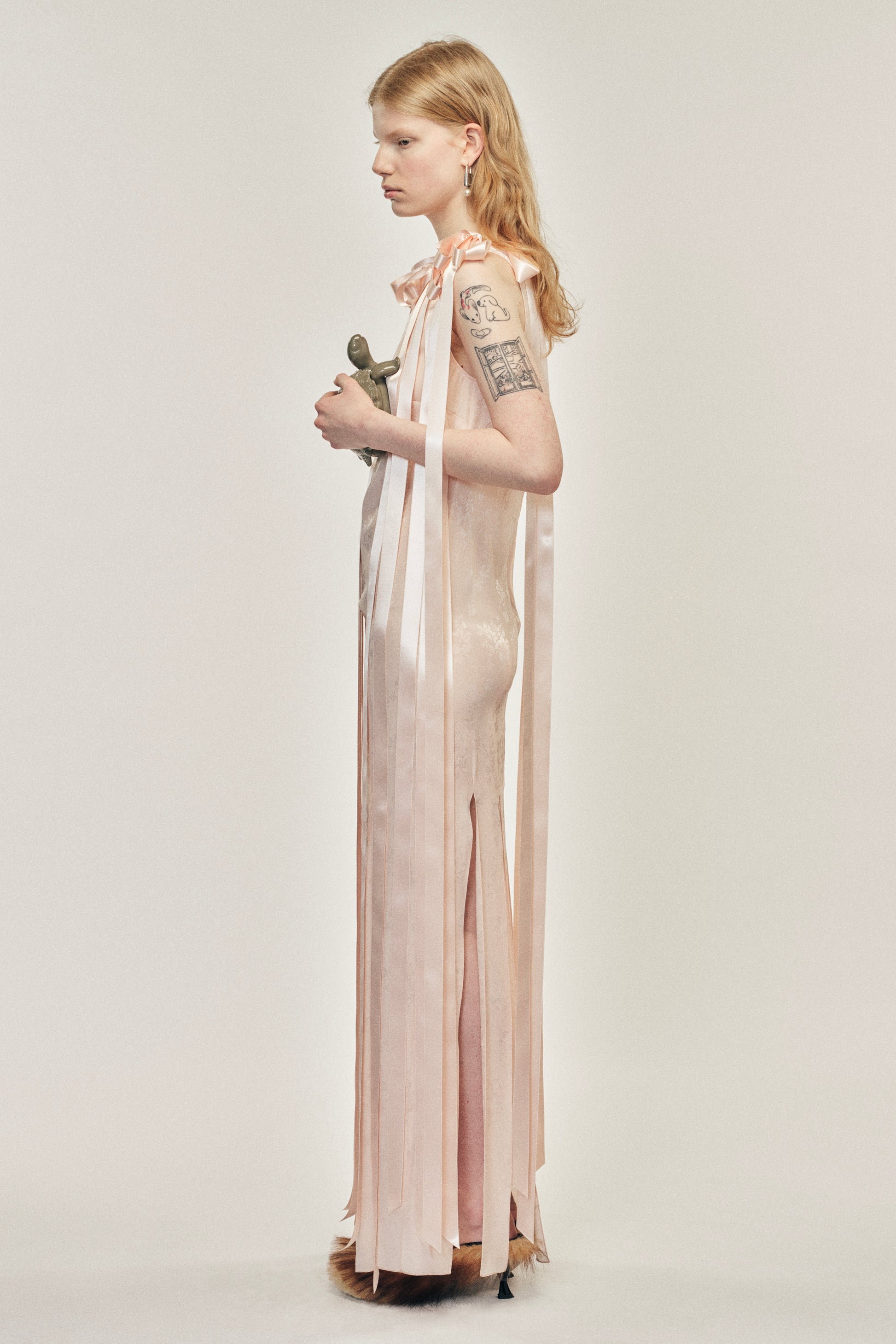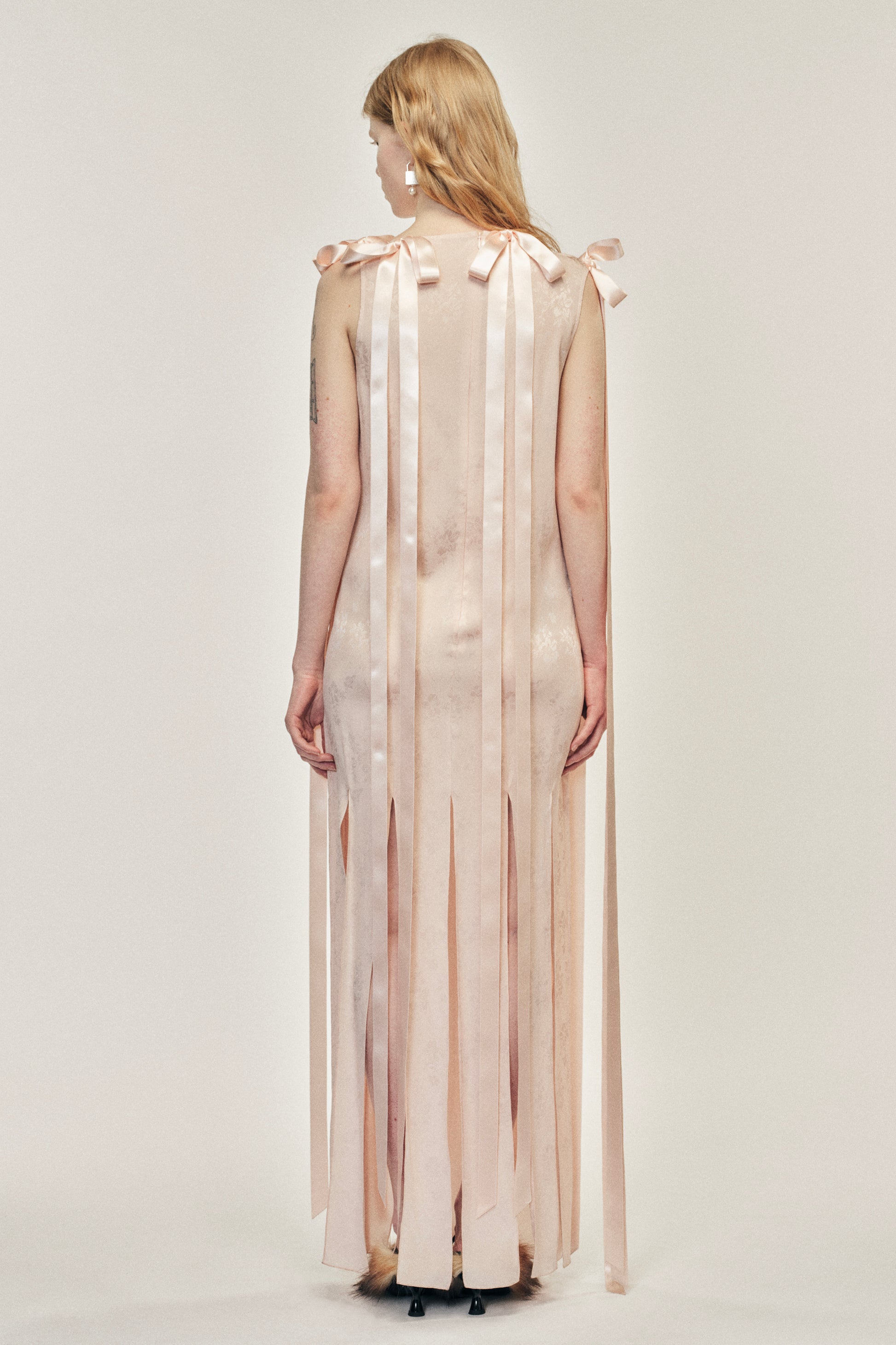 The base of this tonal dress is made from a floral jacquard, the slits along the hem as well as the ribbons from the top create an ethereal quality, allowing it for movement. Ribbons are gathered with small bows at the neckline to form a subtle ruffle detail.
