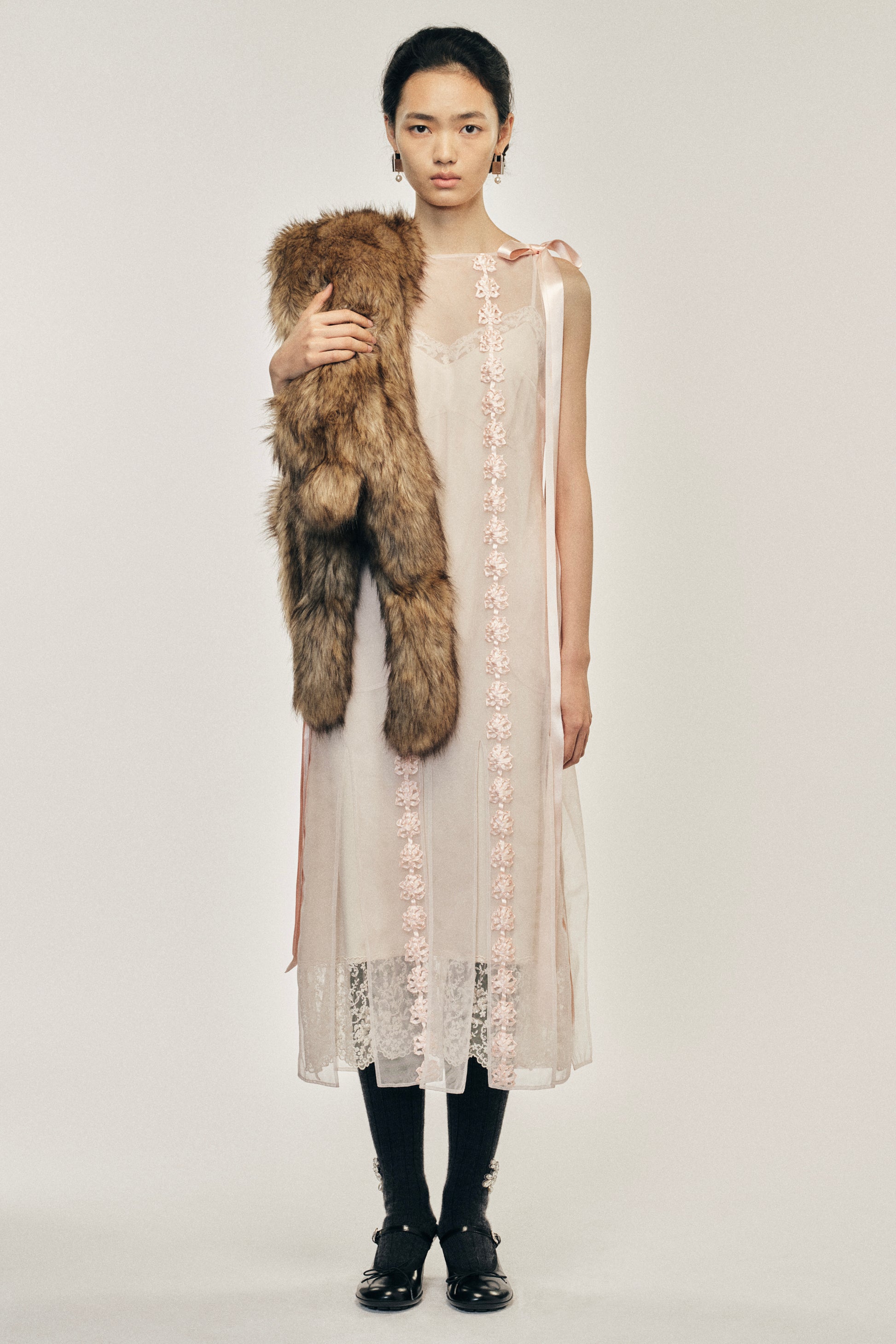 Lustrous satin ribbons are fashioned into bows or used as appliqué at the front of the dress for a delicate floral motif. It's straight silhouette puts focus onto the decorative details of the dress. The model is wearing this style with the Deep Lace Slip Dress.