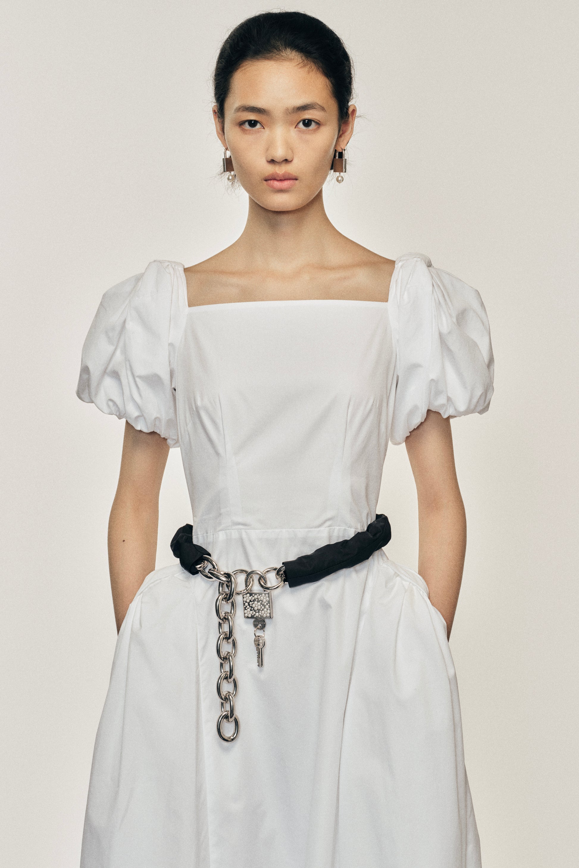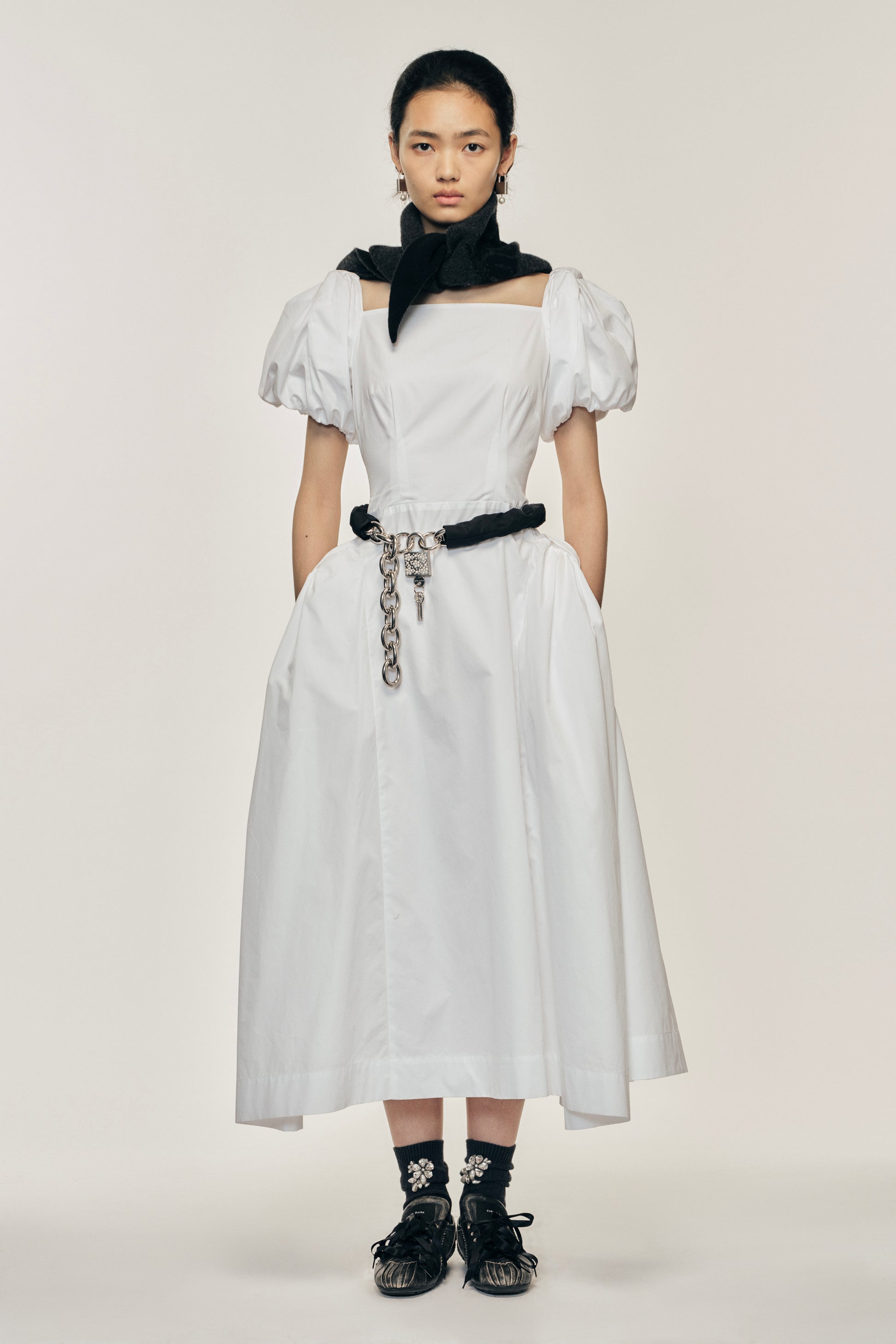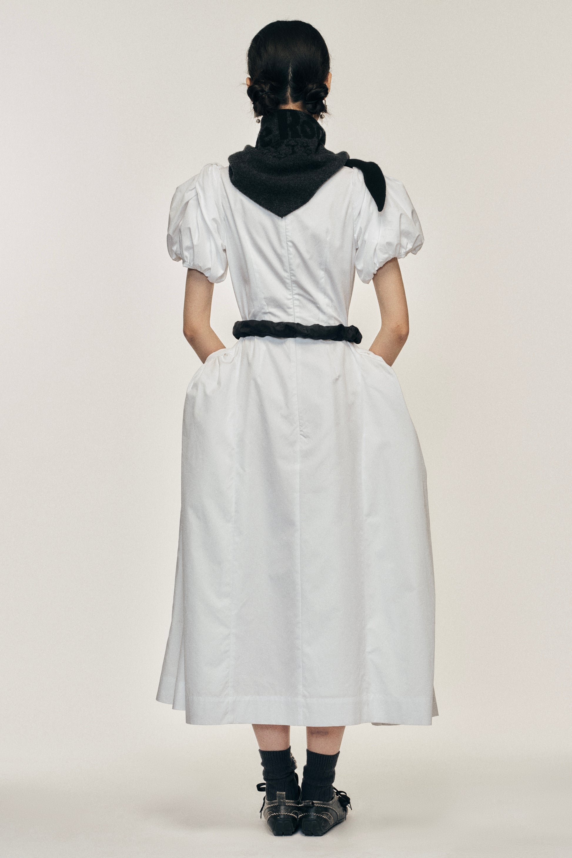 The dress features puffed short sleeves with a gathered bow shape, the crisp cotton composition makes this a great transitional piece. The model is wearing this style with the Graphic Logo Knit Neckerchief & Sleeve Chain Padlock Belt.