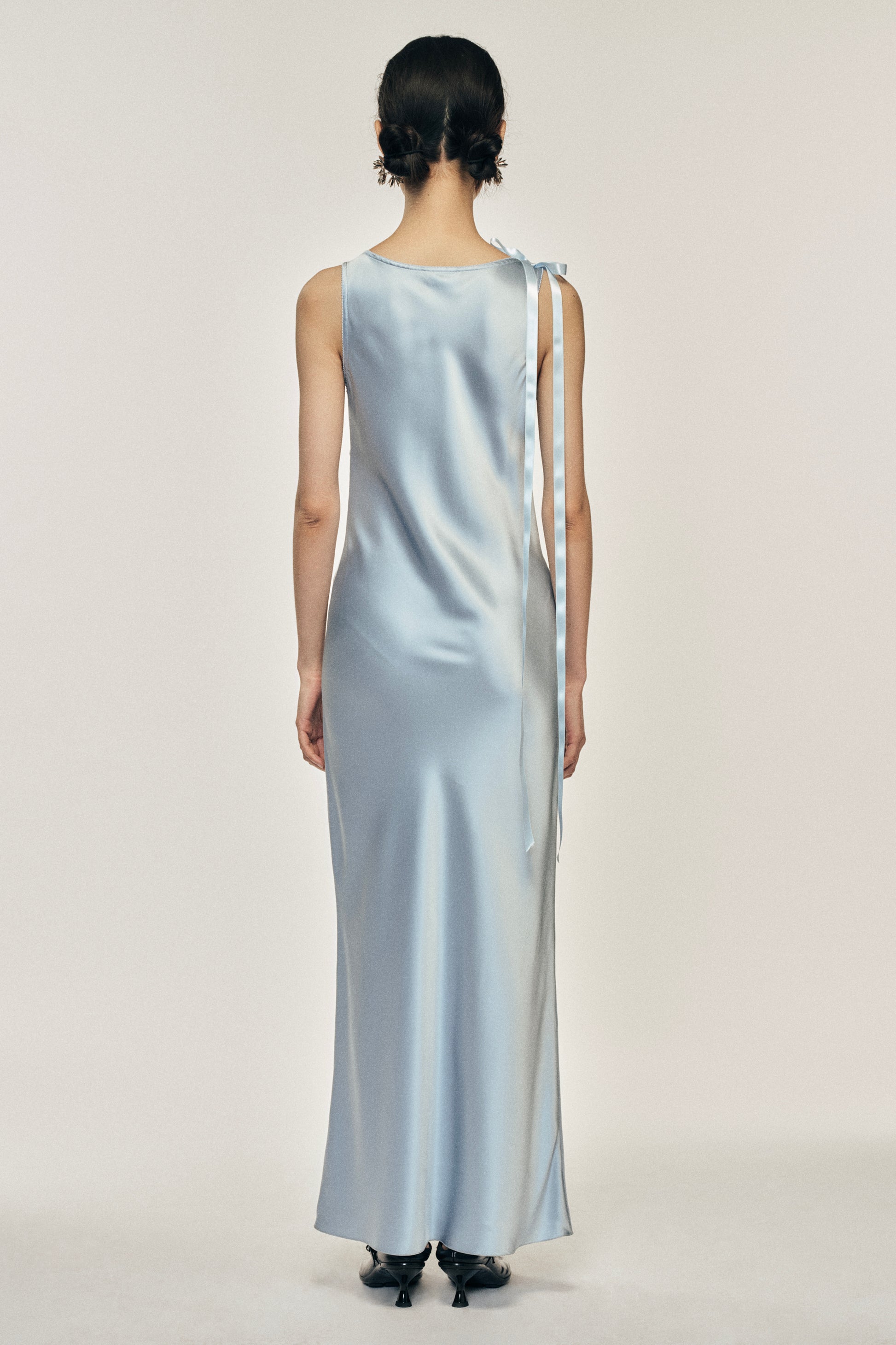 A simple scoop neck maxi length dress featuring a bow ribbon detail at the shoulder. Like the runway, it can be paired with the Long Faux Fur Hare Scarf.