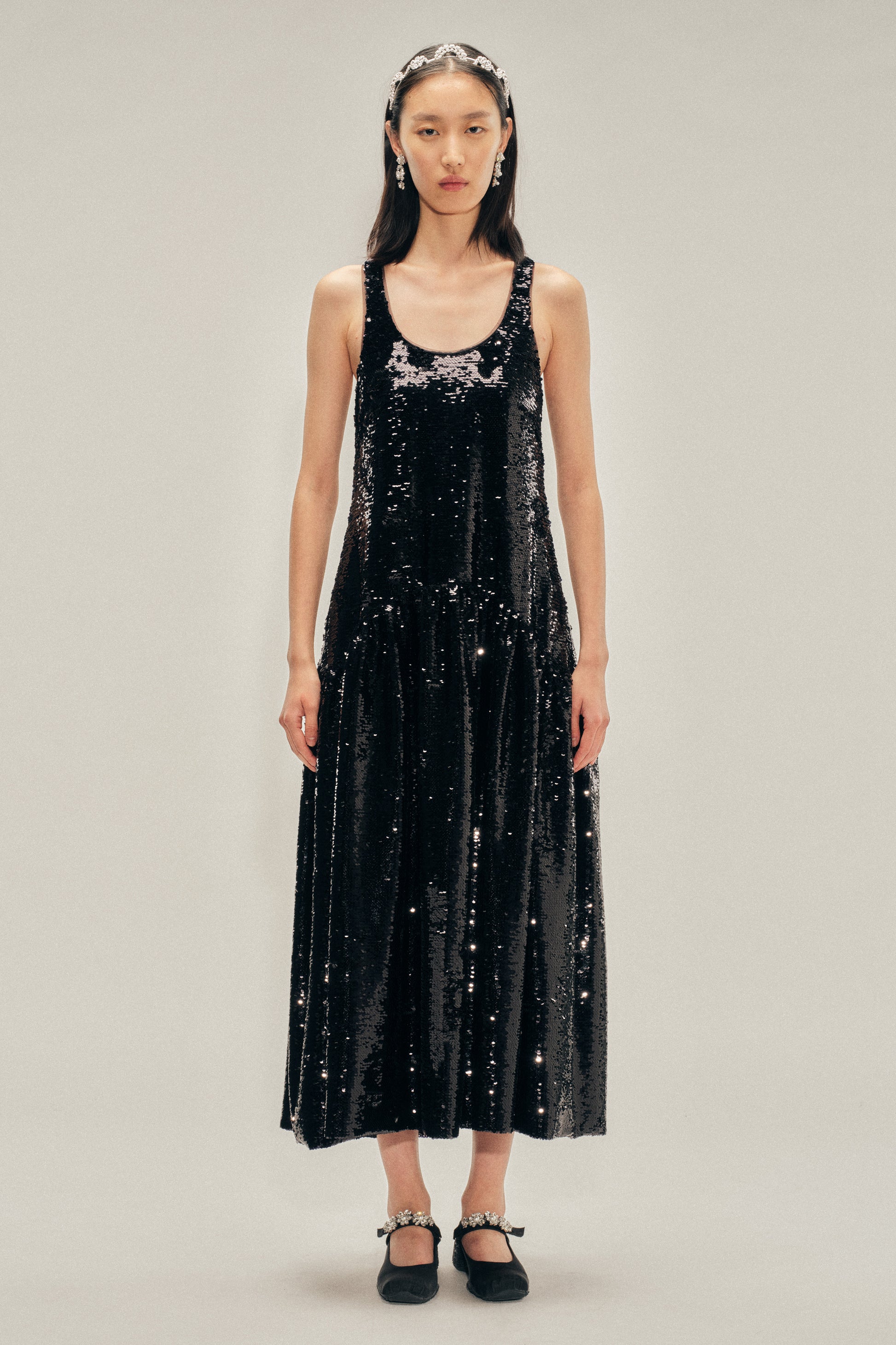 The flounce dress is adorned with gleaming black sequins cascading across the surface. A gathered waist seam and generous skirt create volume, while rear darts cinch the silhouette.