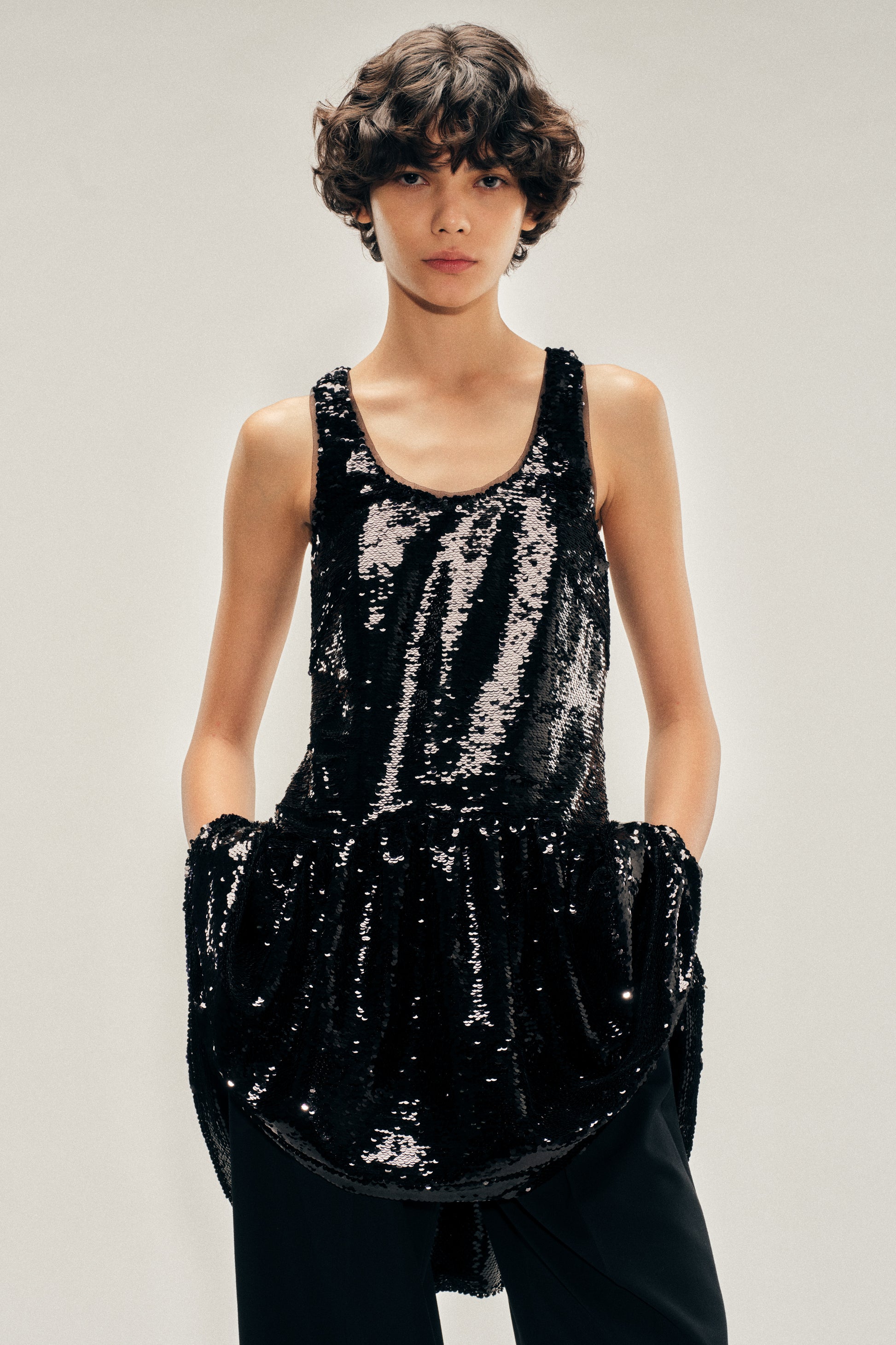 Mini tank dress encrusted in black sequins, featuring a gathered peplum hem at the waist. Rear darts taper the silhouette, capturing the collection's youthful spirit with a sculpted finish.