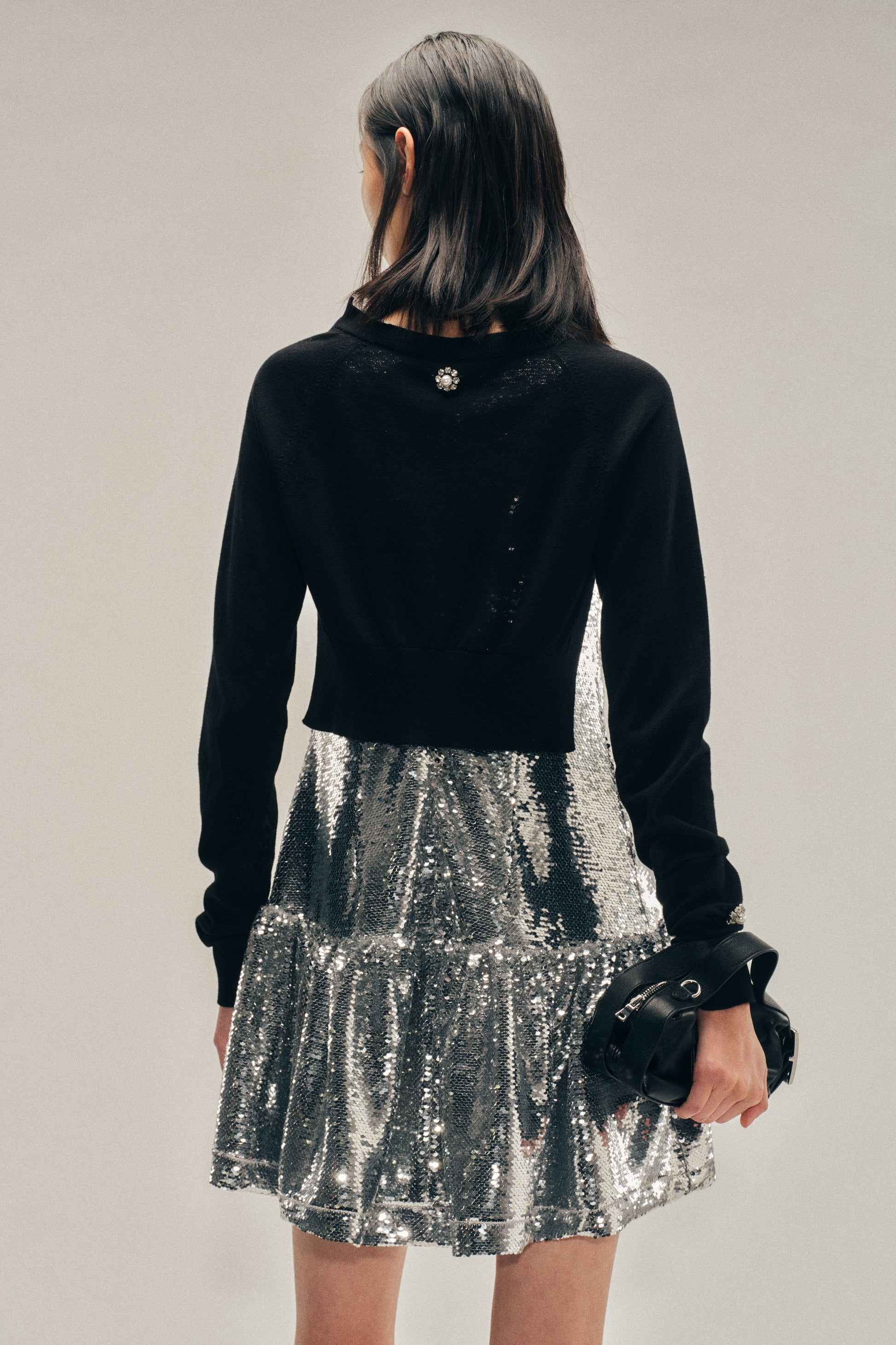 Mini tank dress encrusted in silver sequins, featuring a gathered peplum hem at the waist. Rear darts taper the silhouette, capturing the collection's youthful spirit with a sculpted finish.