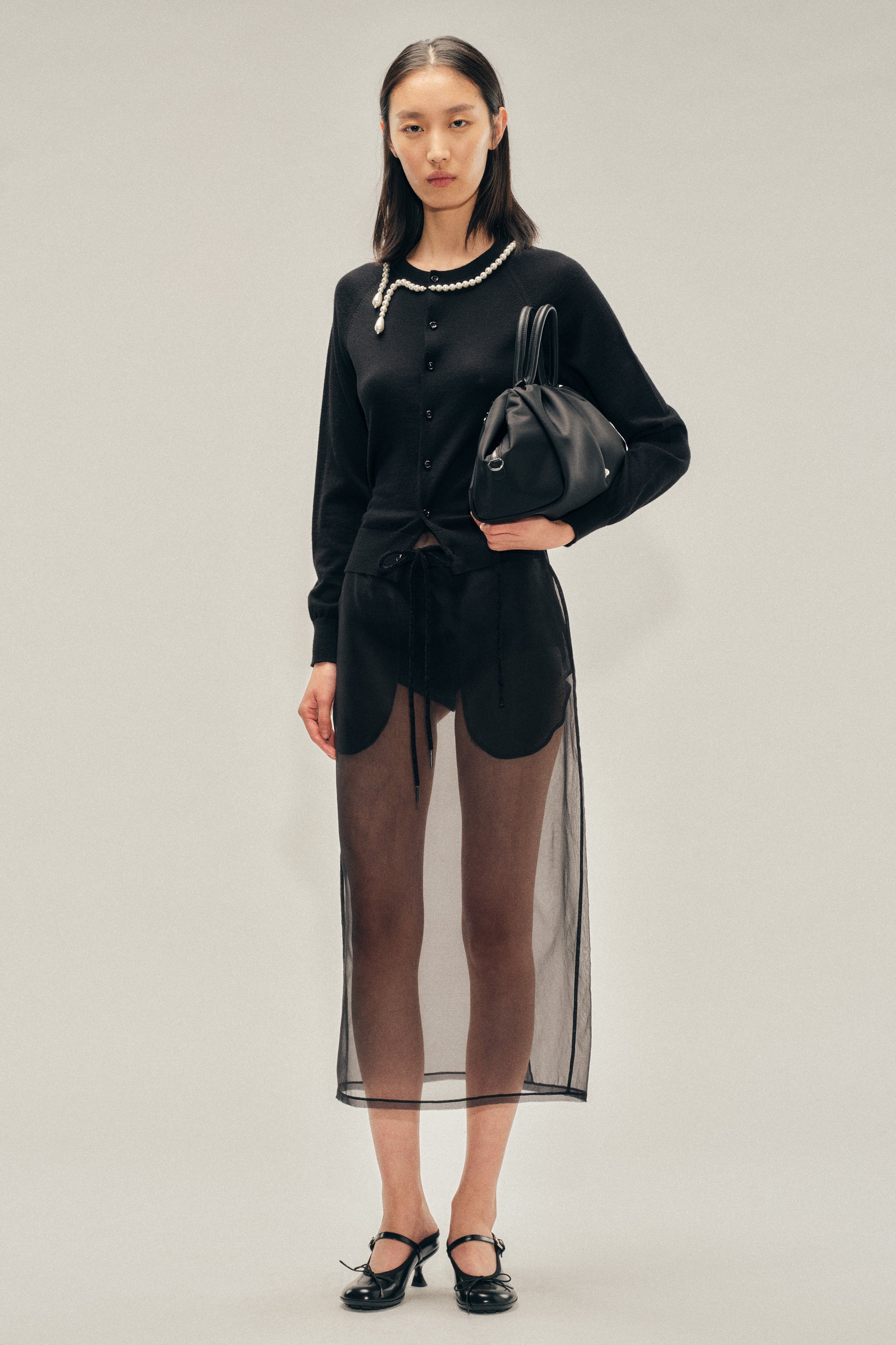 The signature cardigan is adorned with strands of pearls along the neckline. It can be easily paired with a slip dress or tutu skirt.
