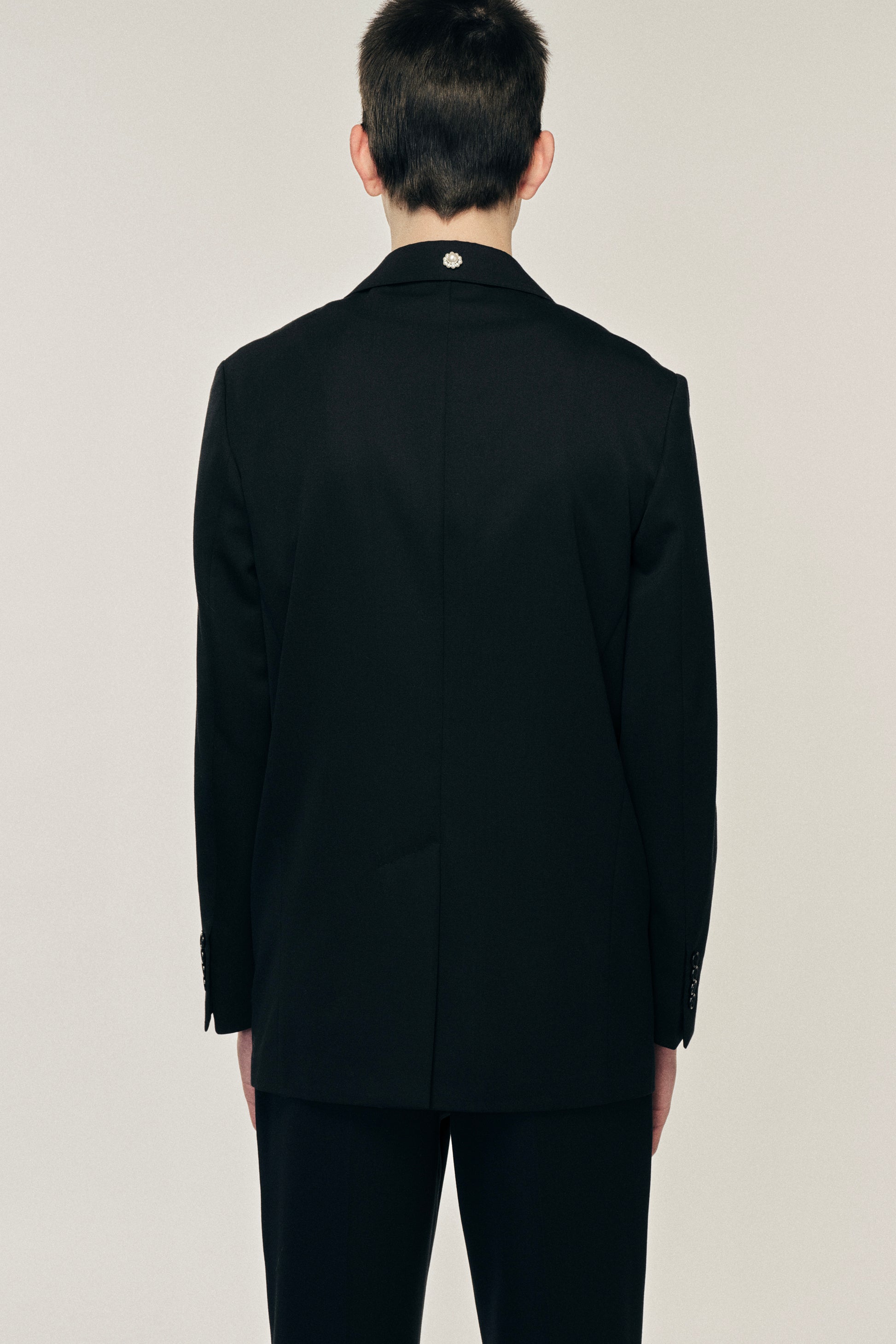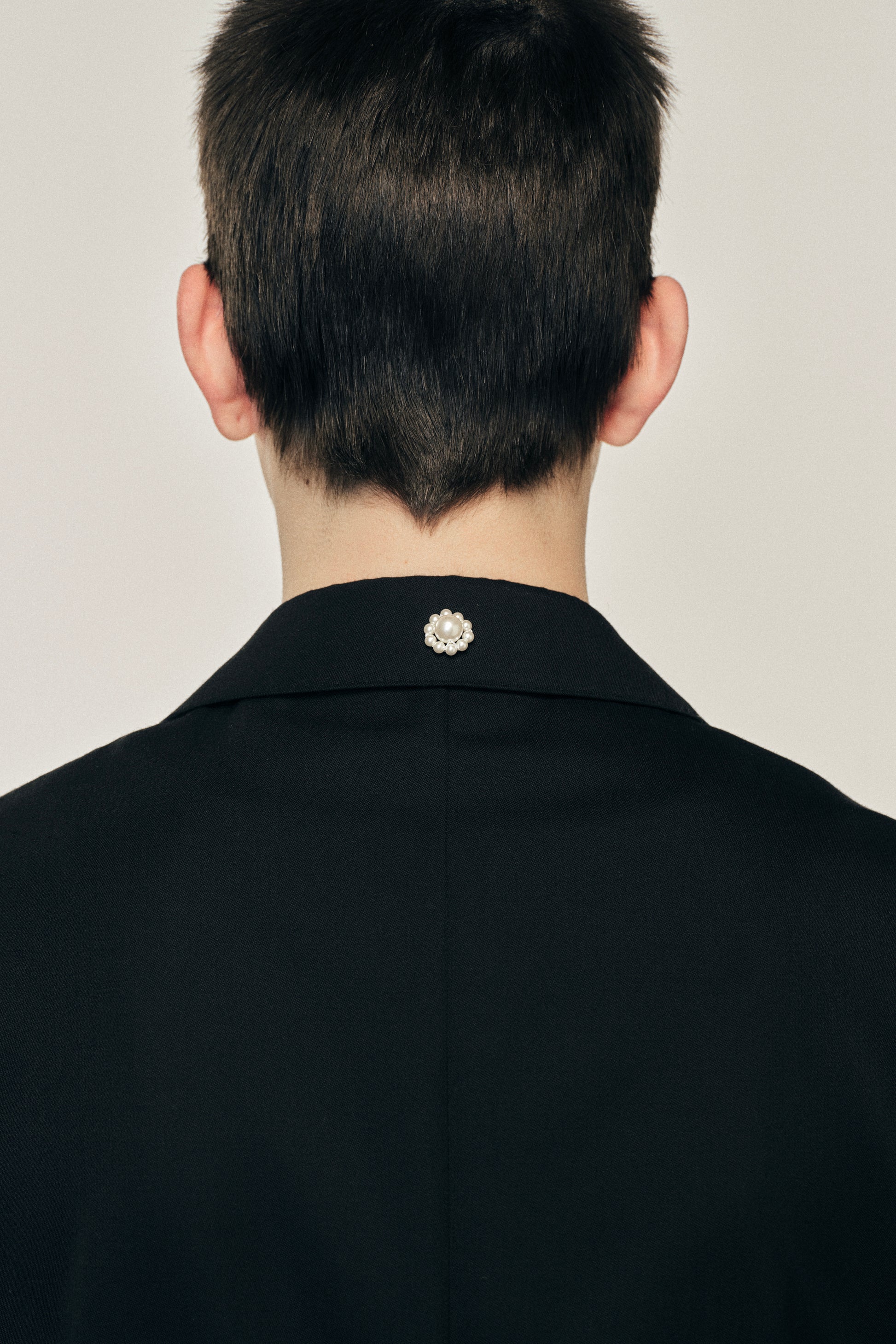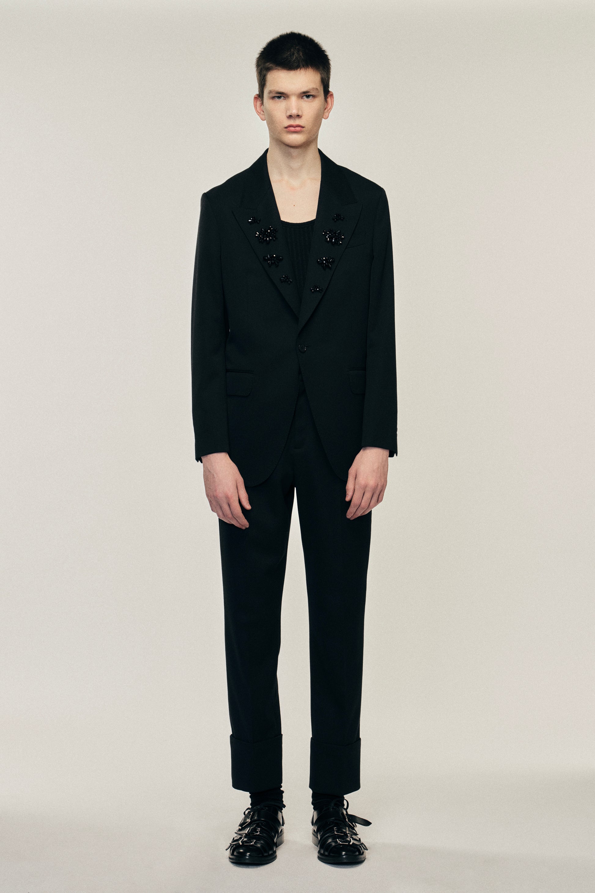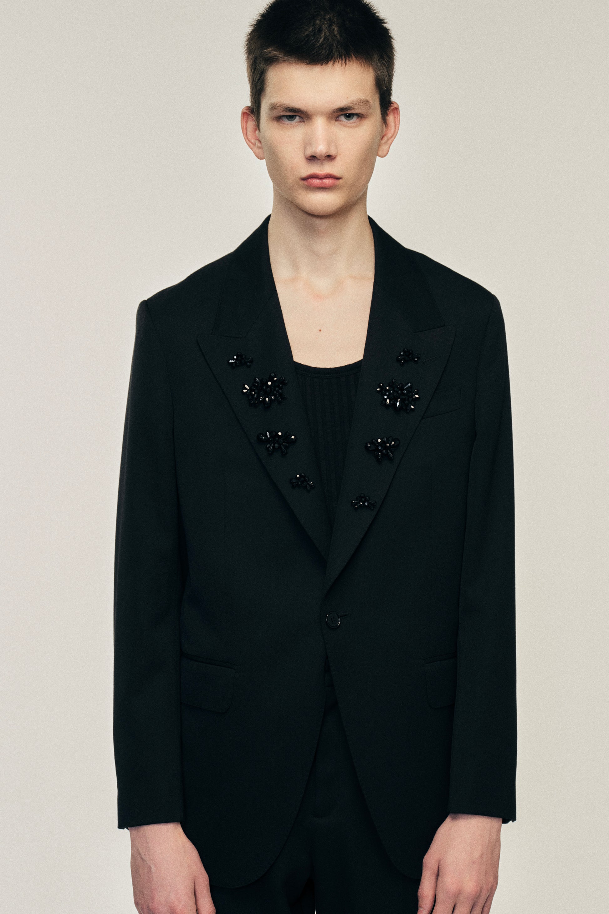 A single-breasted jacket designed with a wider peak for a relaxed fit. This wool blend jacket features signature jet beading at the front for an elevated look. The model is wearing this style with the Cuffed Straight Leg Trousers.