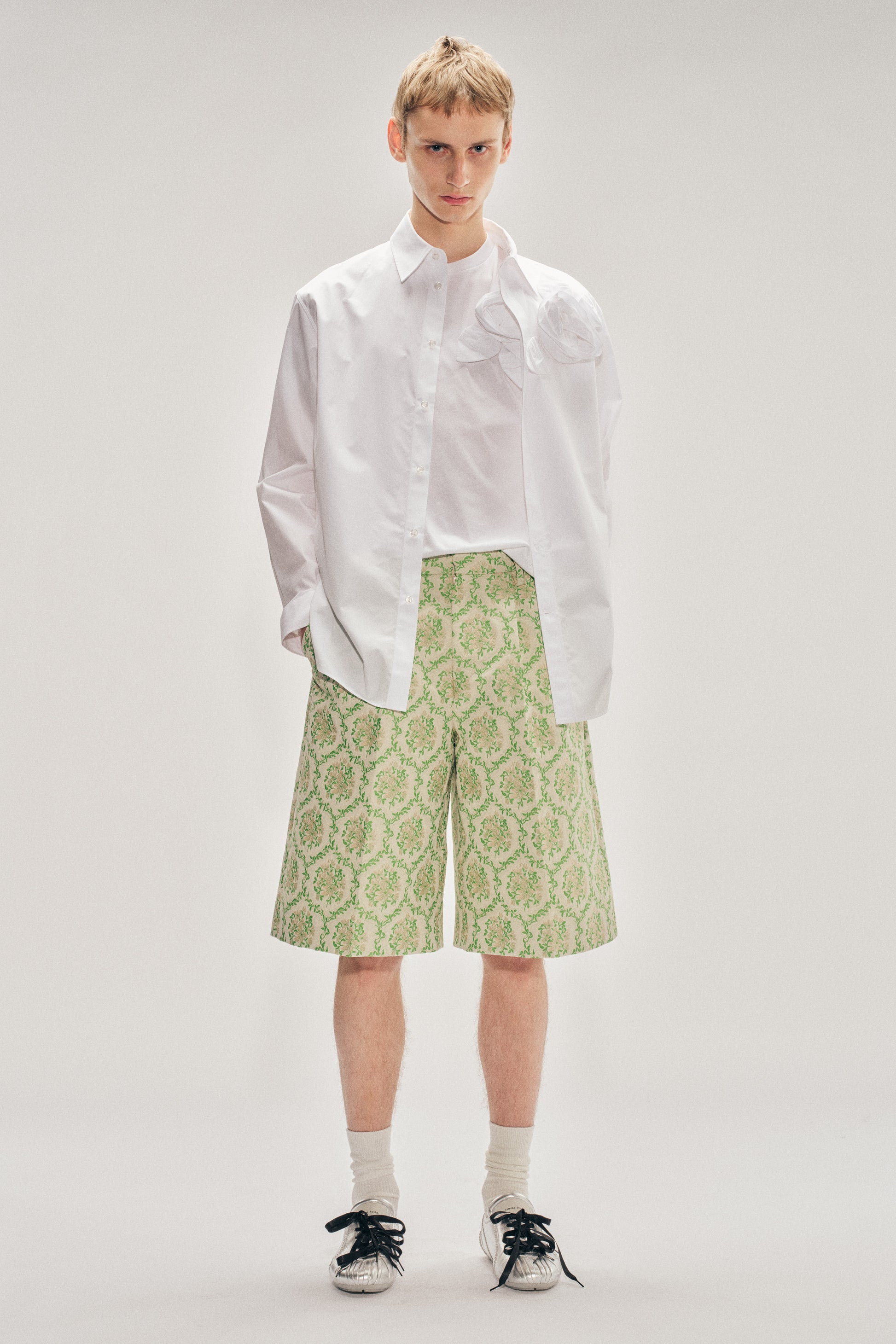 Easy button shirt accented with a small sculpted rosette at the chest.