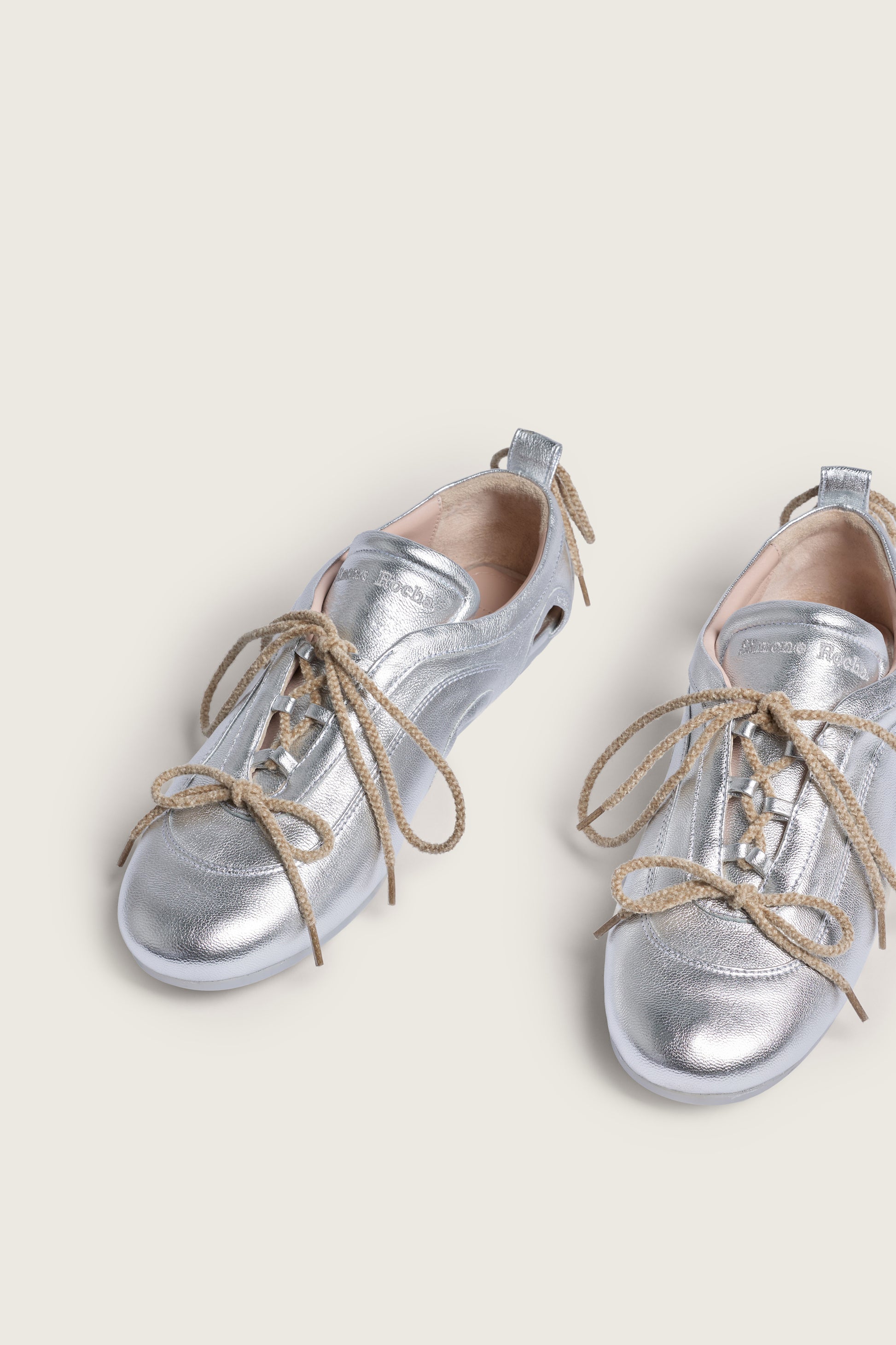 The brand's classic ballerina trainer, reimagined with window cut-outs along the sides and crafted in silver laminato leather for a dazzling finish.