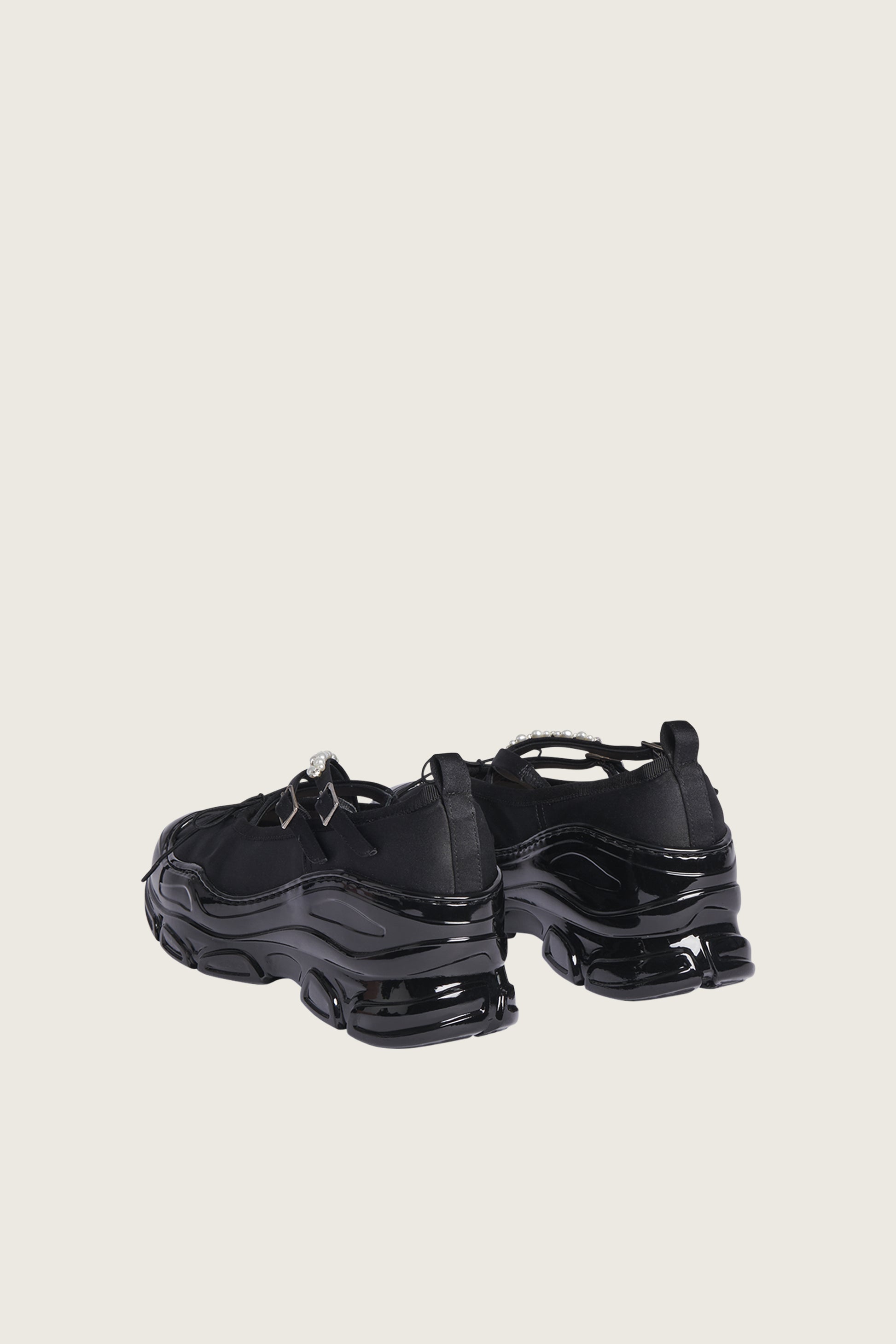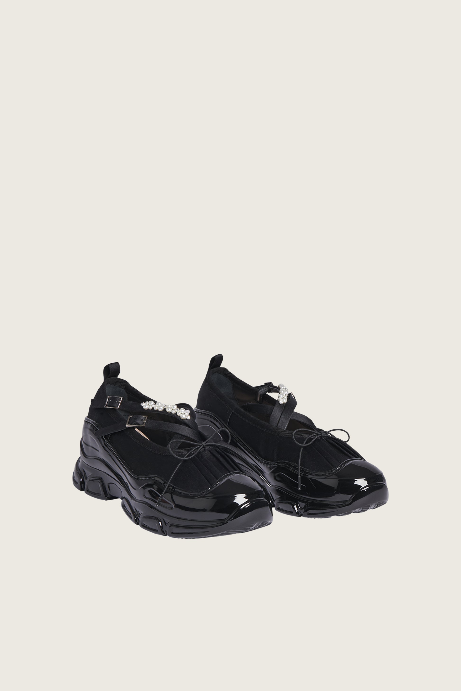 The classic Simone Rocha shoe featuring an athletic sole with a ballerina inspired upper. It has a double criss-cross strap that is embellished with signature pearls and crystals.