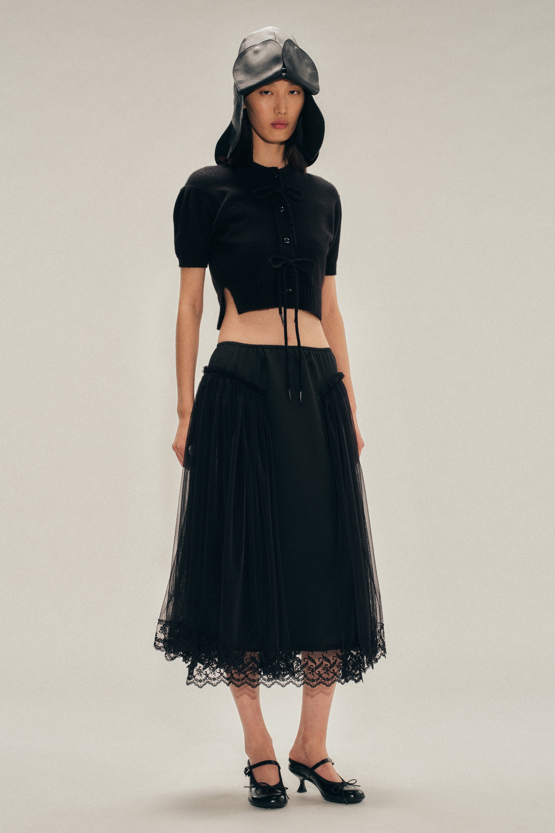 A crepe de chine skirt with an elasticated waistband and a delicate lace-trimmed hem. Tulle frills falling from the hips add texture and volume.
