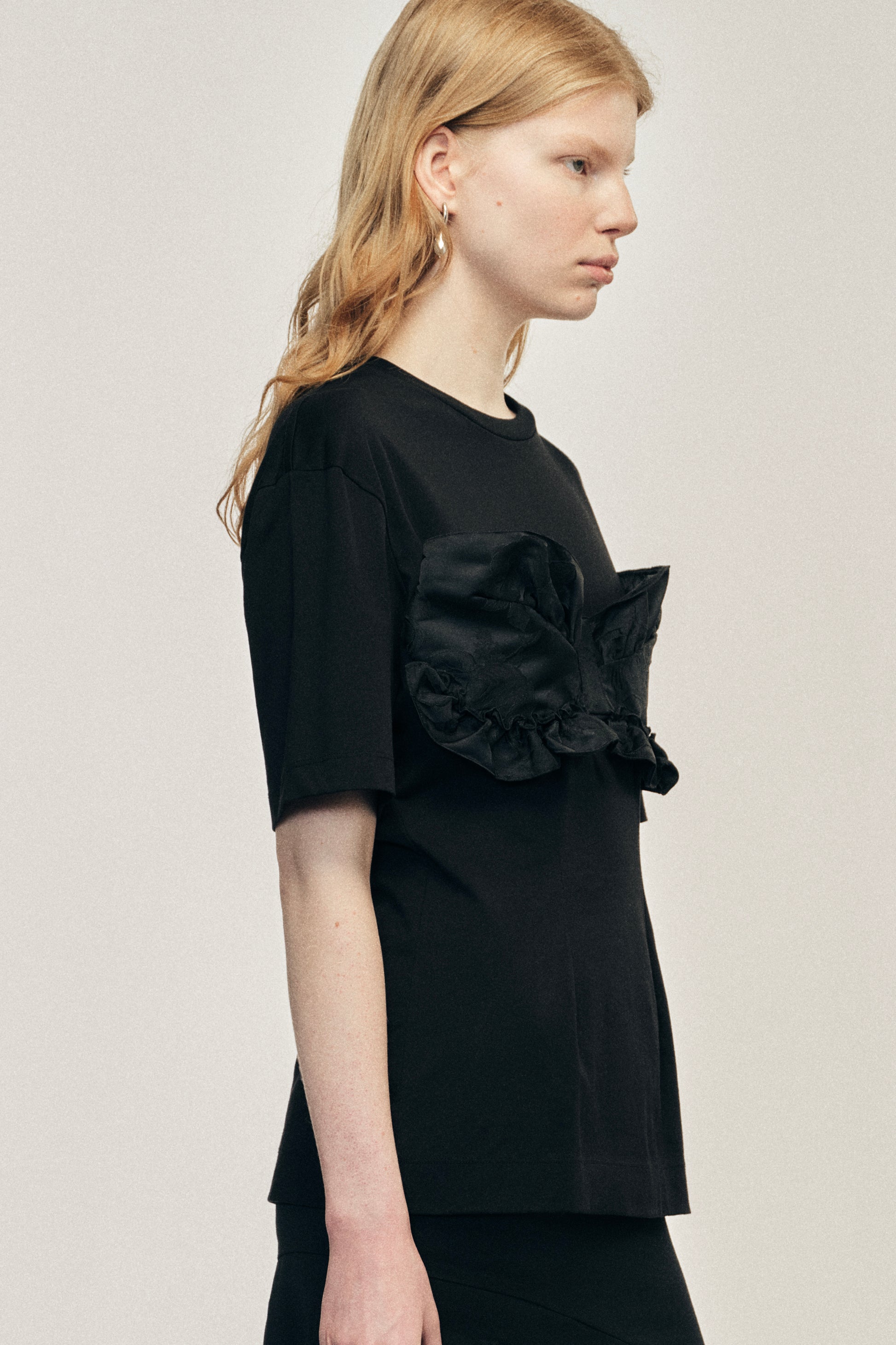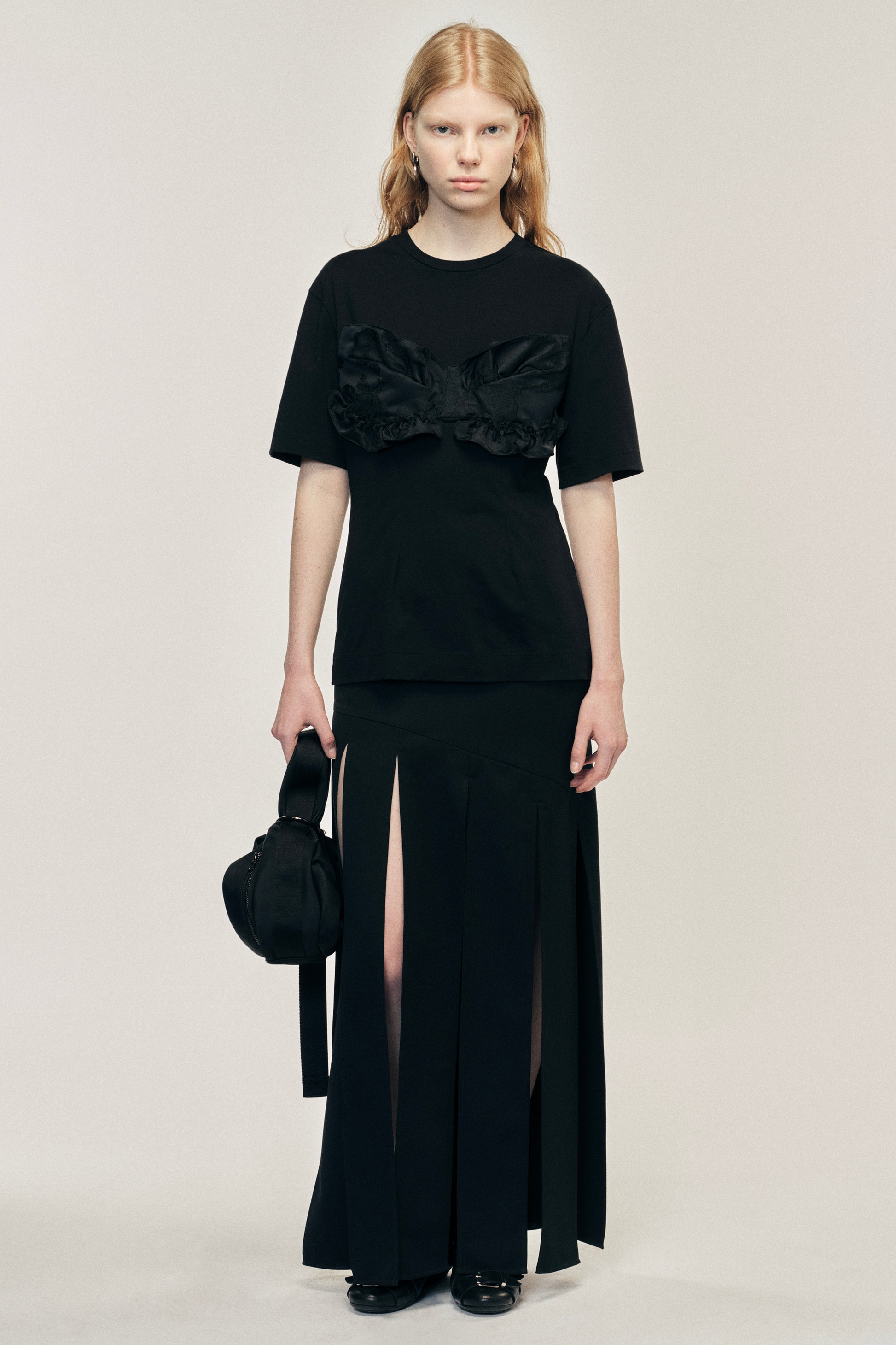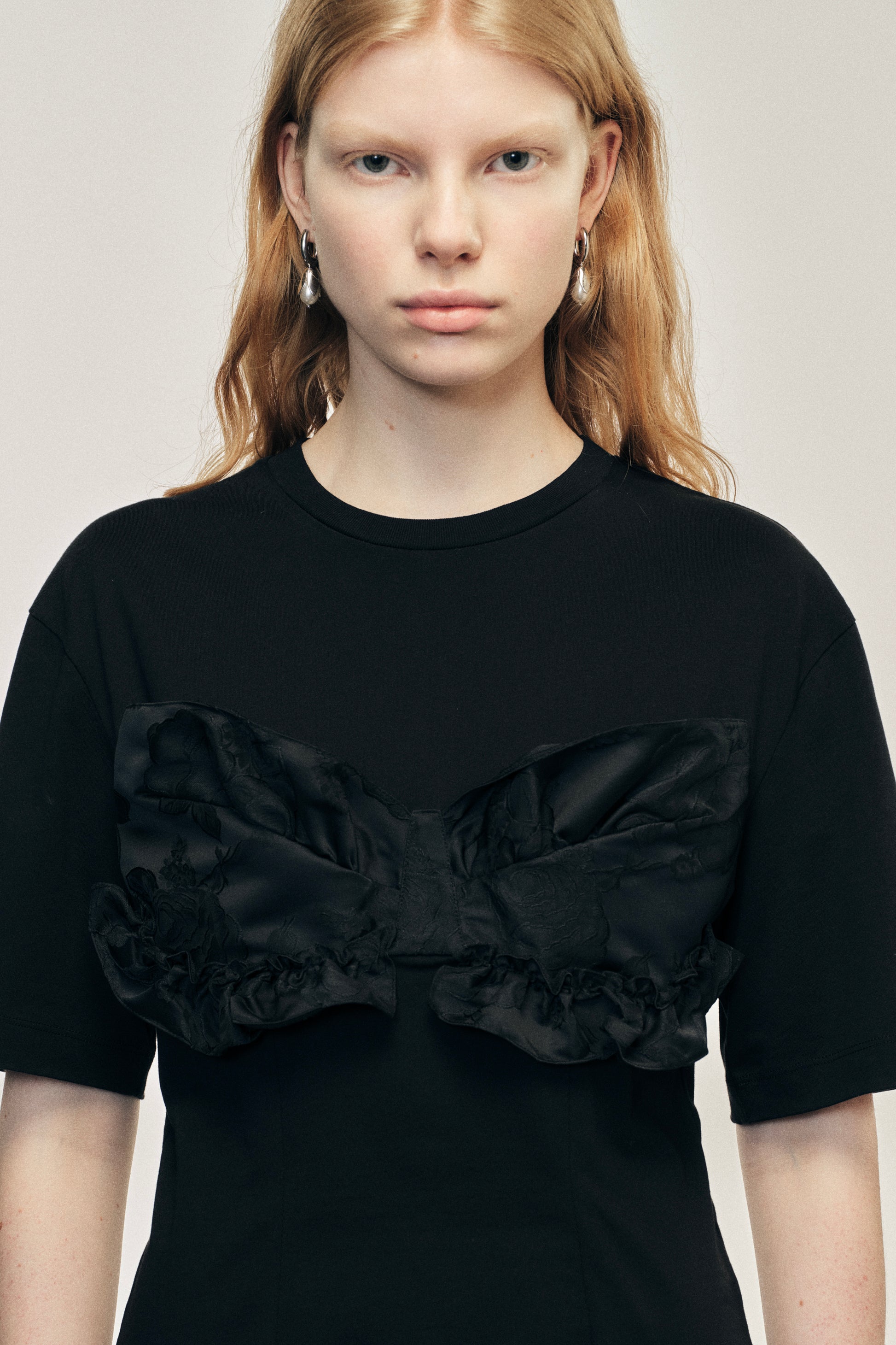 A relaxed t-shirt with a tonal floral brocade patchwork detail at the bust. The contrast of the ornate fabric elevates this easy style. The model is wearing this style with the Bias Cut Multi Slit Skirt.