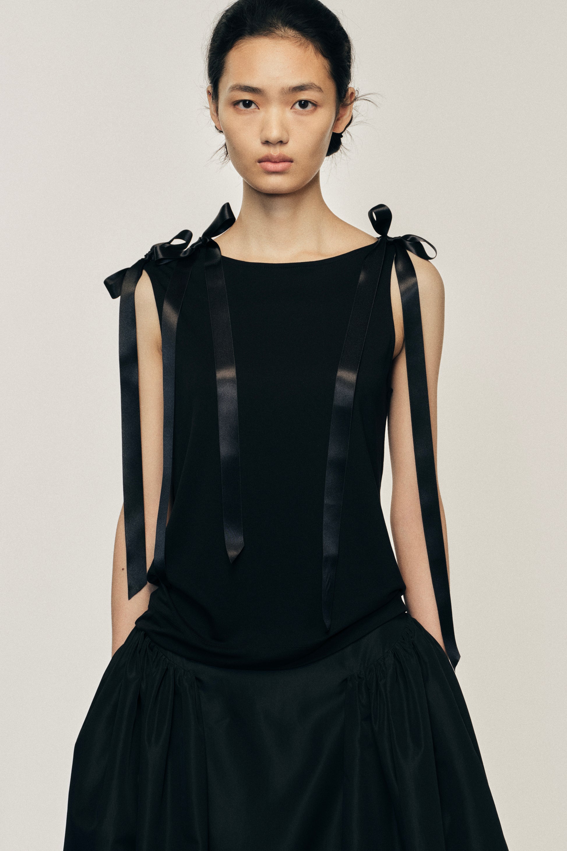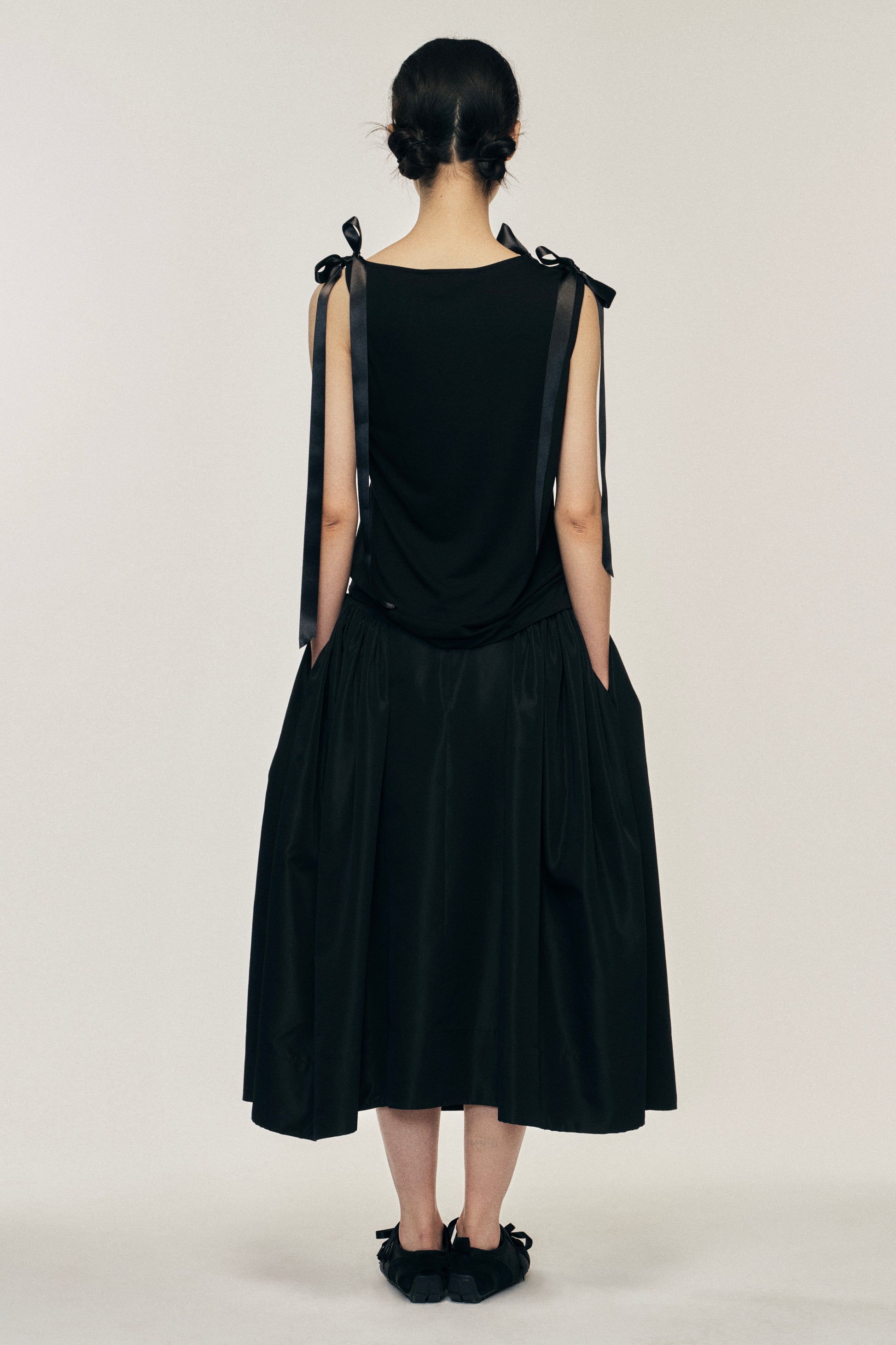The Bow Ribbon Tail Tank features bow ribbons at the shoulder for a feminine touch, it is designed with a draped loose fit. The model is wearing this style with the Hip Detail Bind Skirt.