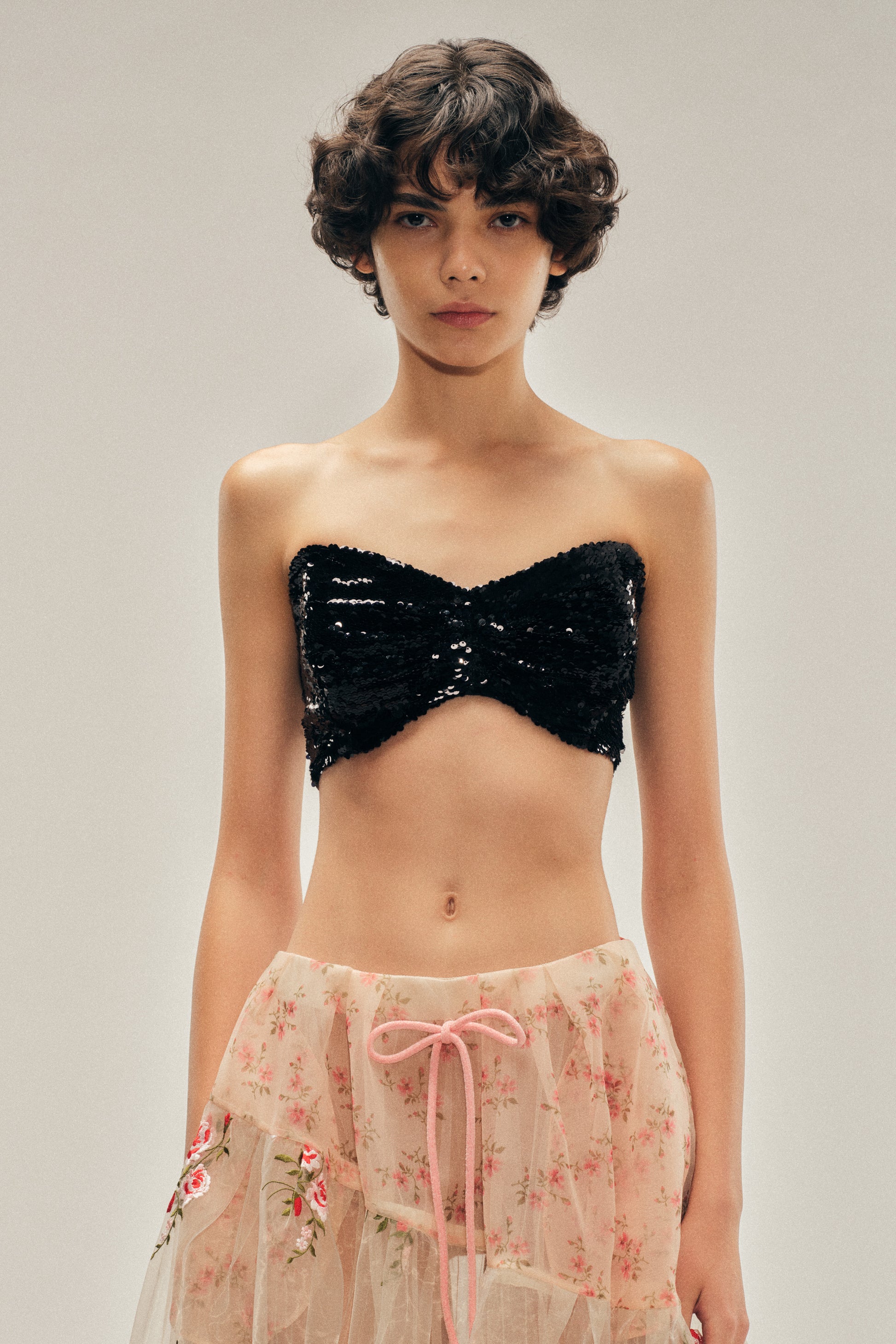 The sequin bandeau top features a structural design, this strapless style definitely makes for an eye-catching statement piece.