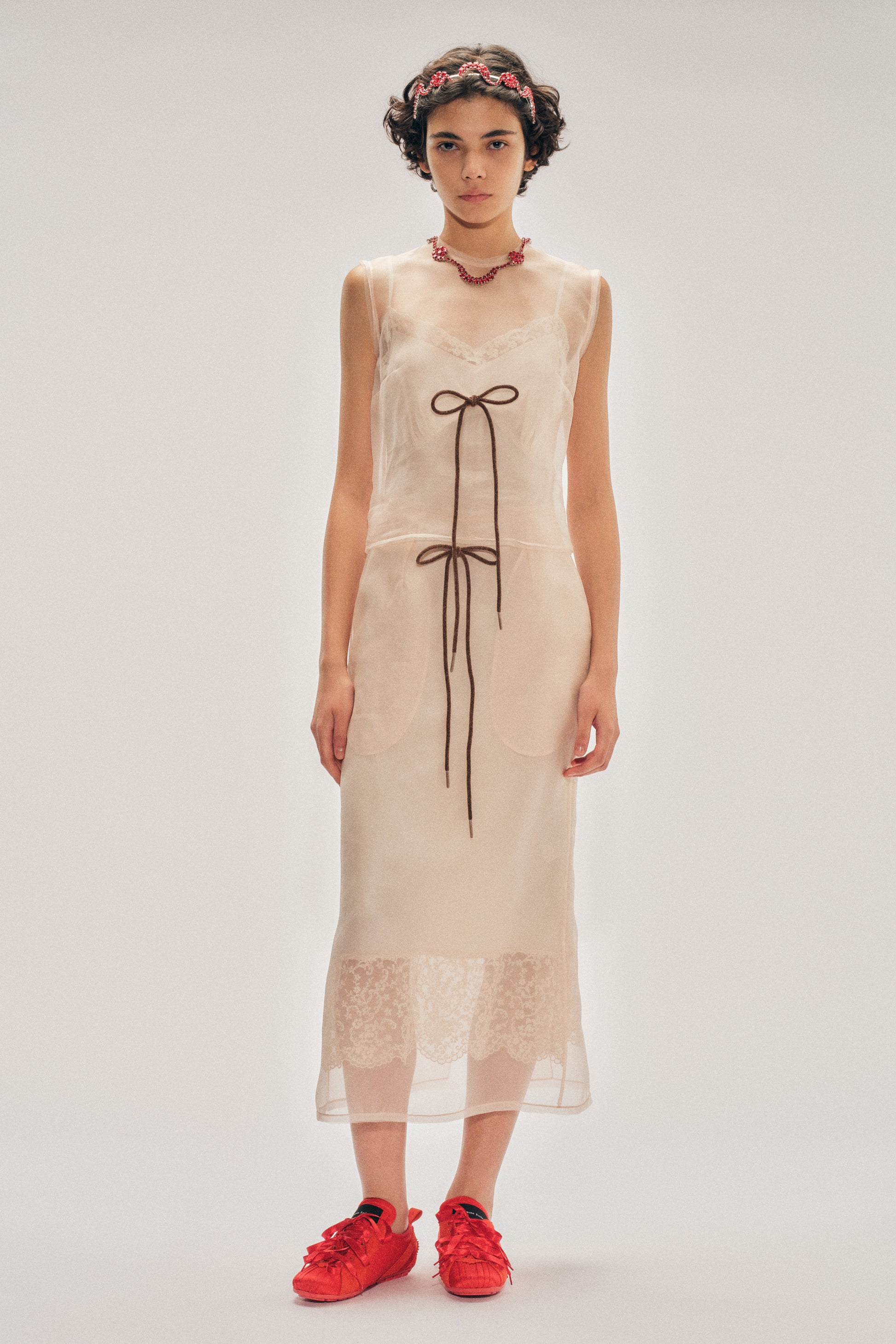 Sheer sleeveless top in fine silk organza, detailed with the season's fuzzy chenille bow cord. Raw finished hems complete the airy, ethereal style.