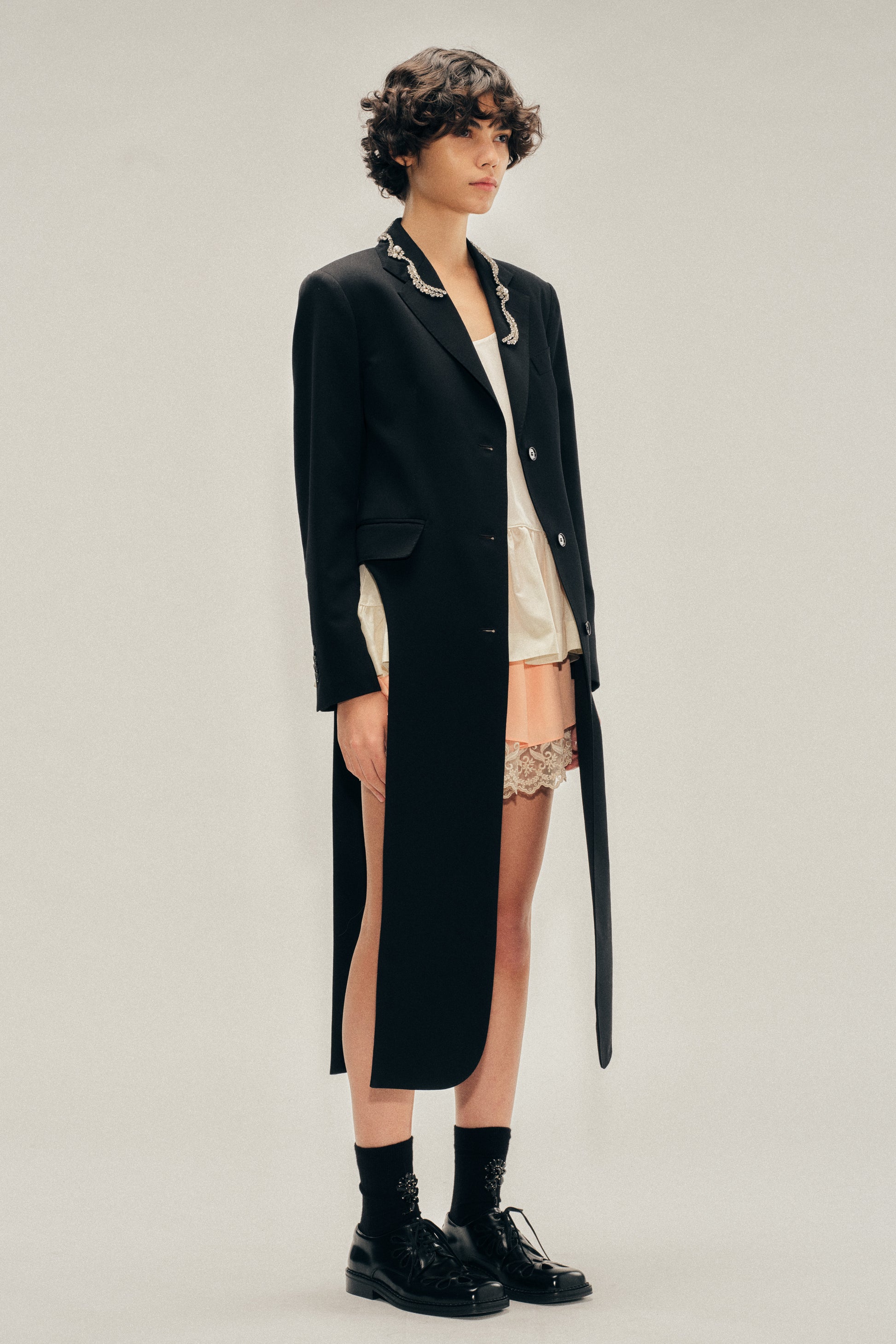 This long wool coat has an eye catching design with the sides cut-out for a dramatic tailcoat shape. It features signature pearl and crystal embellishments at the label.