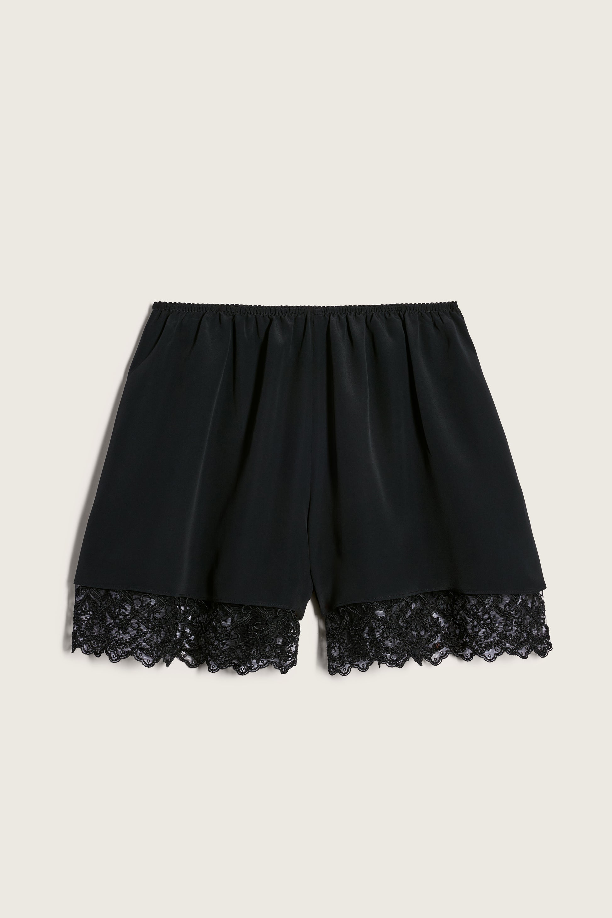 Building on the brand’s signature slip dress, these negligee shorts are crafted in crepe de chine with delicate lace-trimmed hems and a softly scalloped elastic waistband.