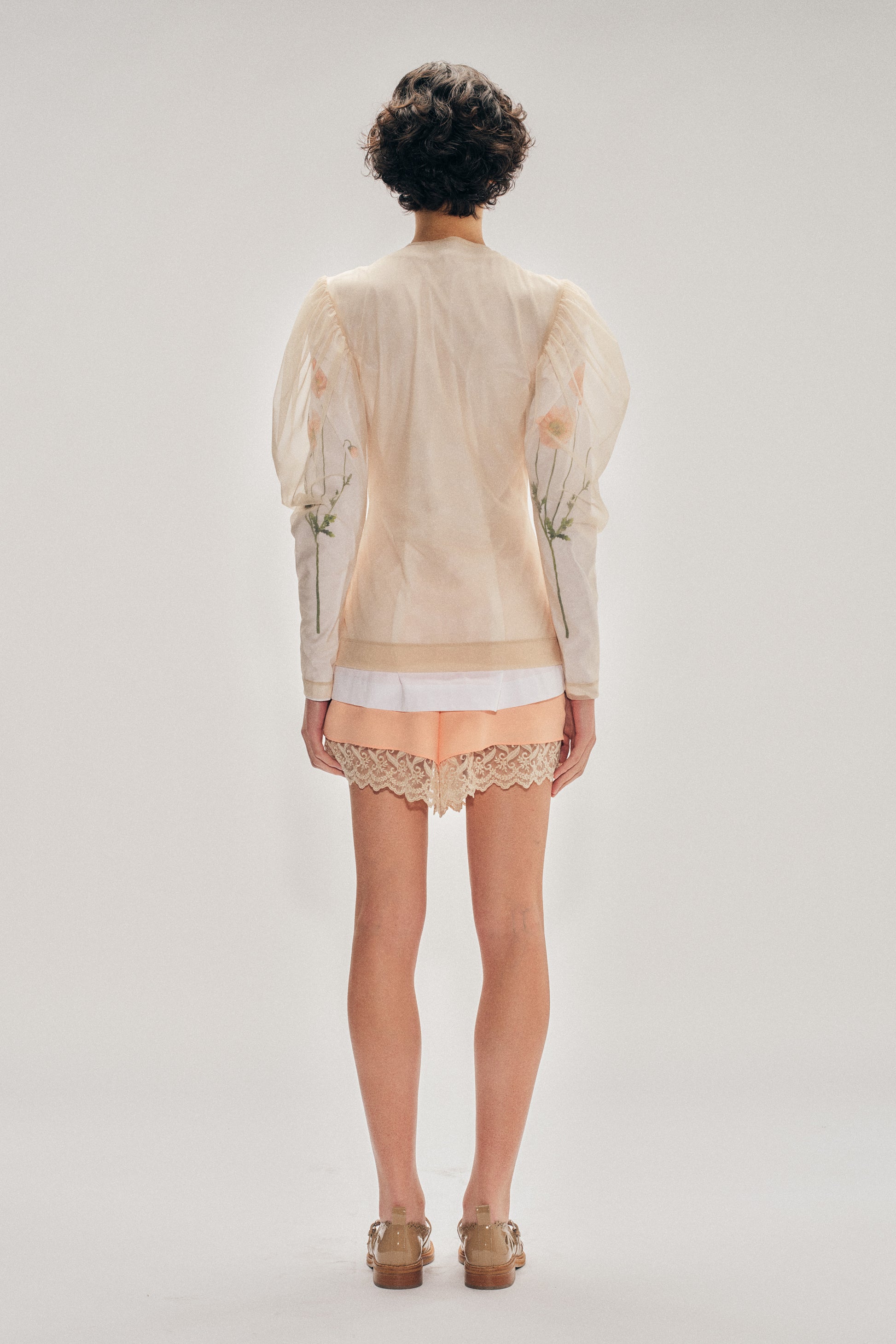Building on the brand’s signature slip dress, these negligee shorts are crafted in crepe de chine with delicate lace-trimmed hems and a softly scalloped elastic waistband.