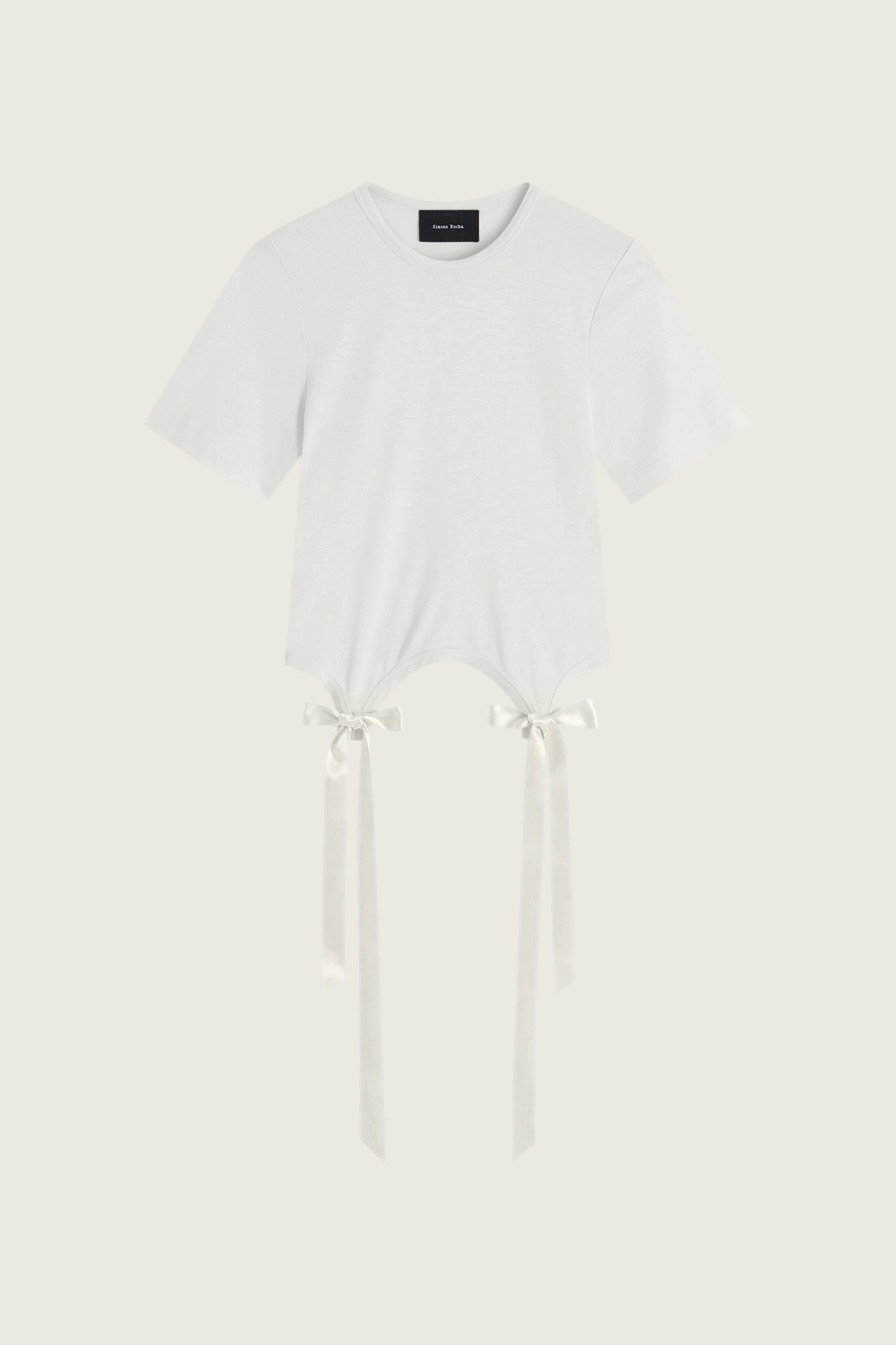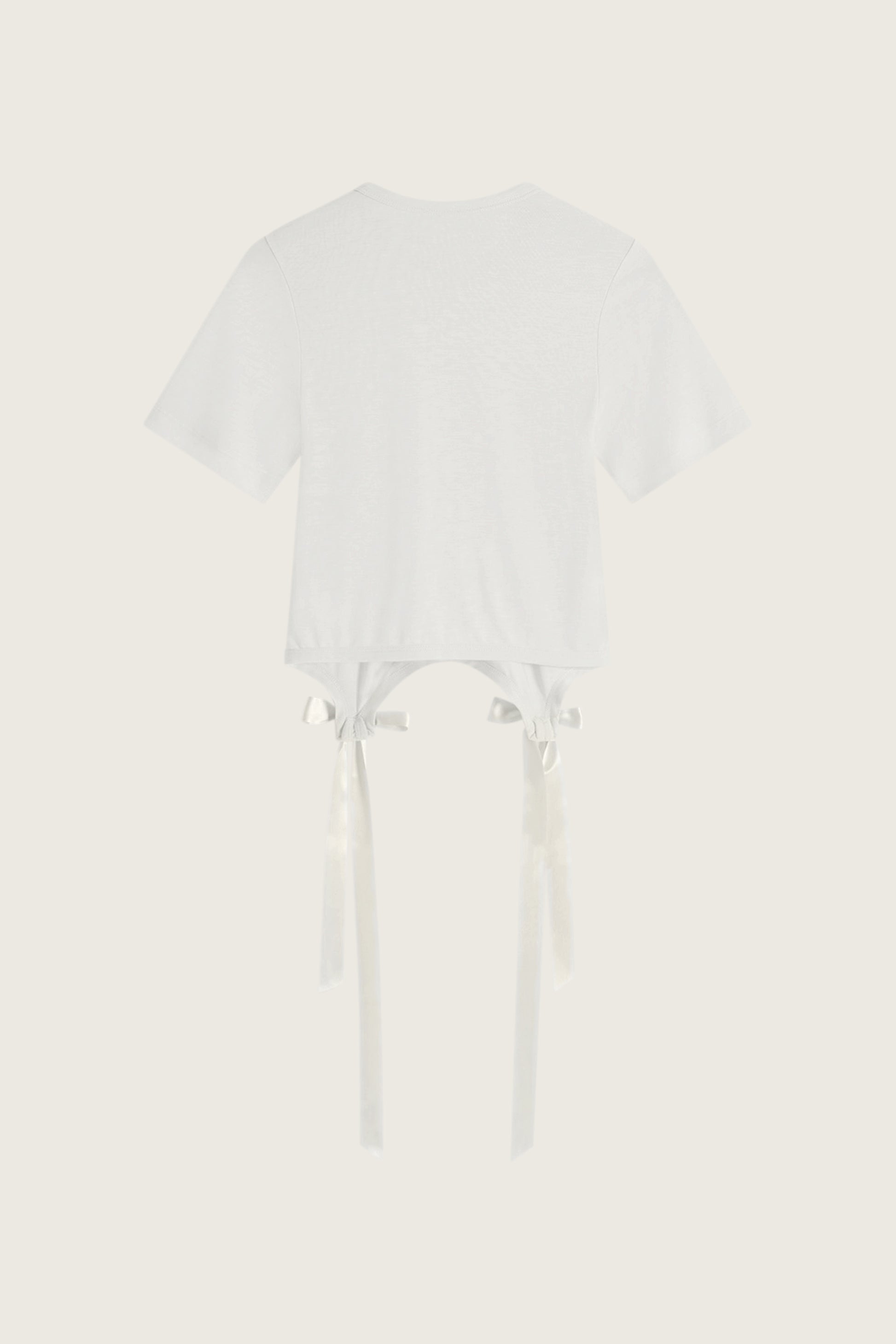 A cropped t-shirt in a soft fine jersey fabrication, it features long satin bow tails at the front for a delicate touch on this everyday style.