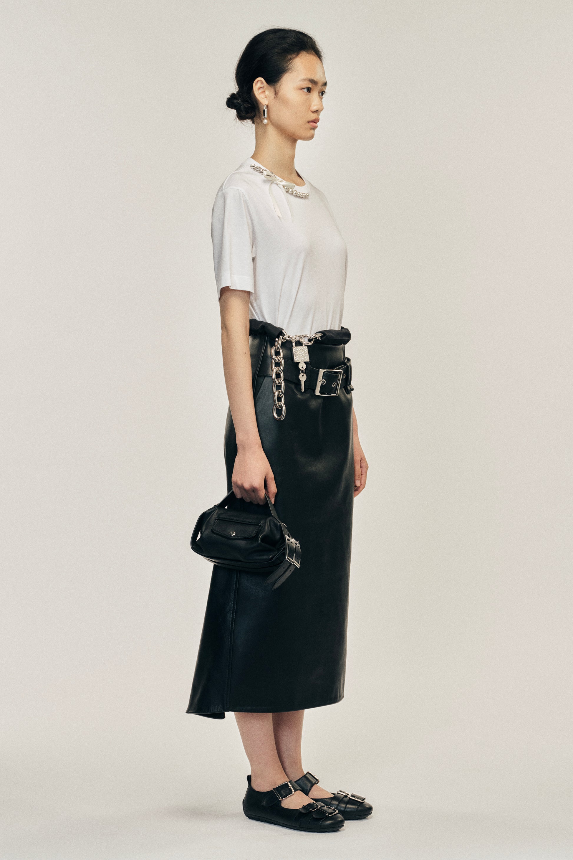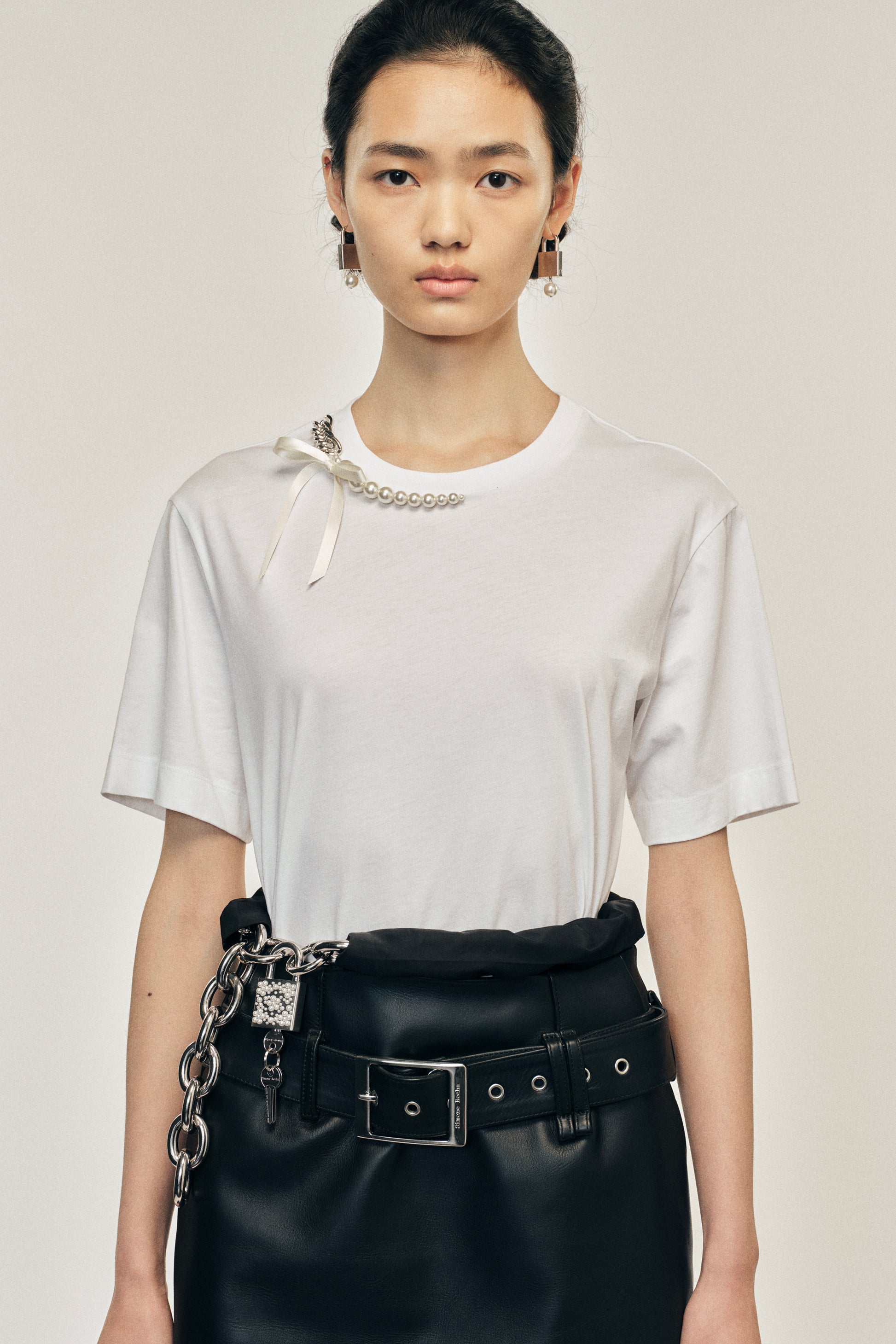 A relaxed fit t-shirt featuring a seasonal pearl and chain embellishment along the neckline with a signature bow. The model is wearing this style with the Multi Belt Loop Kick Back Skirt.