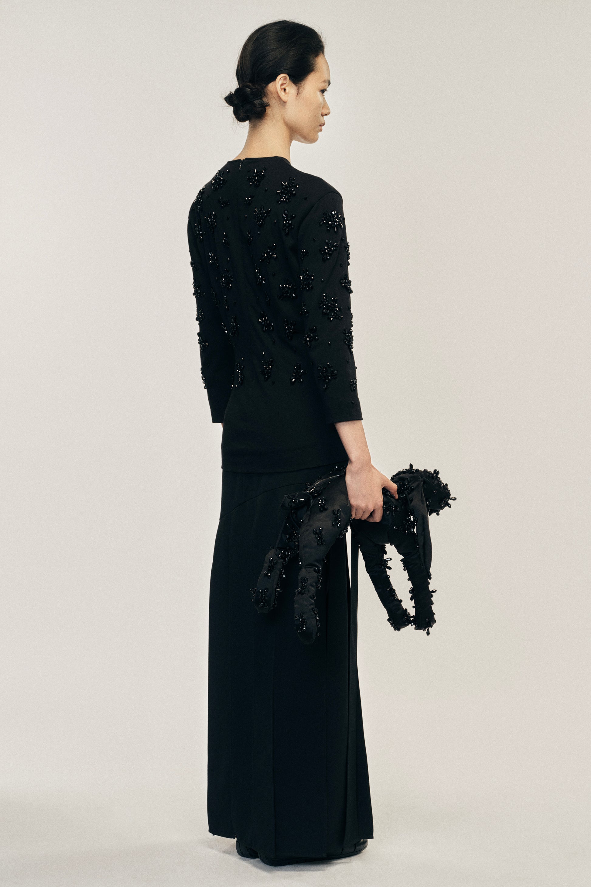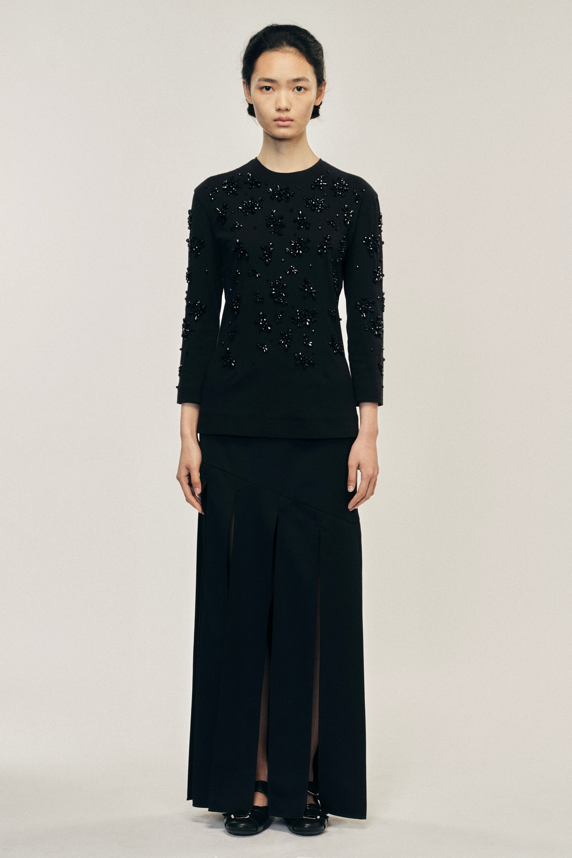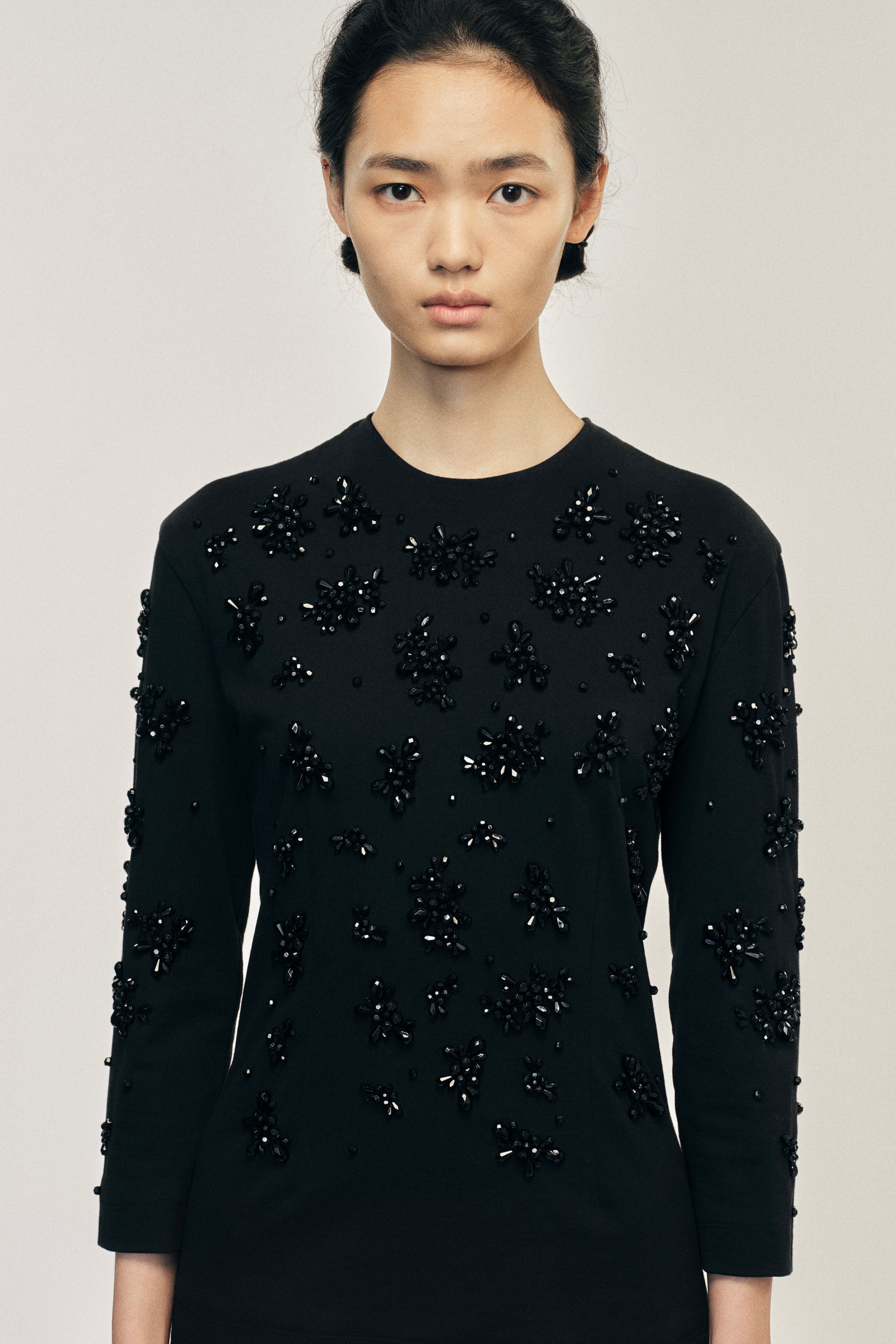 A long sleeve cotton top with distinctive jet black embellishments throughout, it has a subtle sculpted fit that is perfect to be tucked in with a pair of trousers. The model is wearing this style with the Bias Cut Multi Slit Skirt.