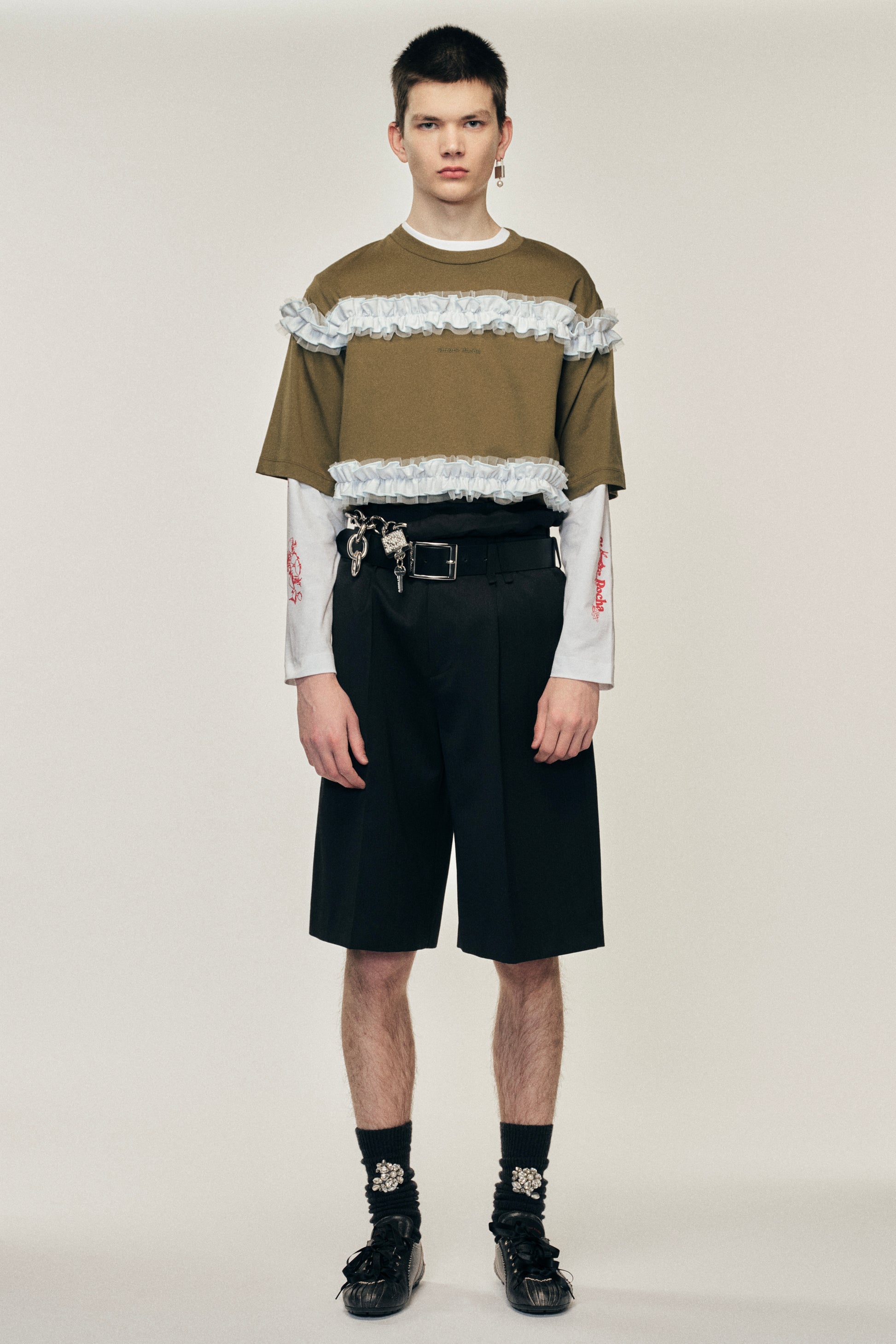 An oversized t-shirt with a boxy fit, it features ruffle frills throughout the front and has a tonal logo embroidery at the chest. The model is wearing this style with the Tortoise & Hare Long Sleeve T-Shirt & Wide Leg Multi Belt Loop Shorts.
