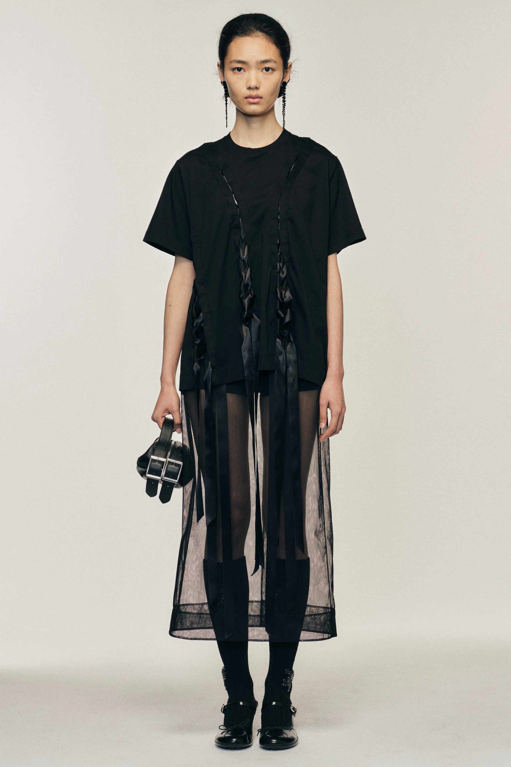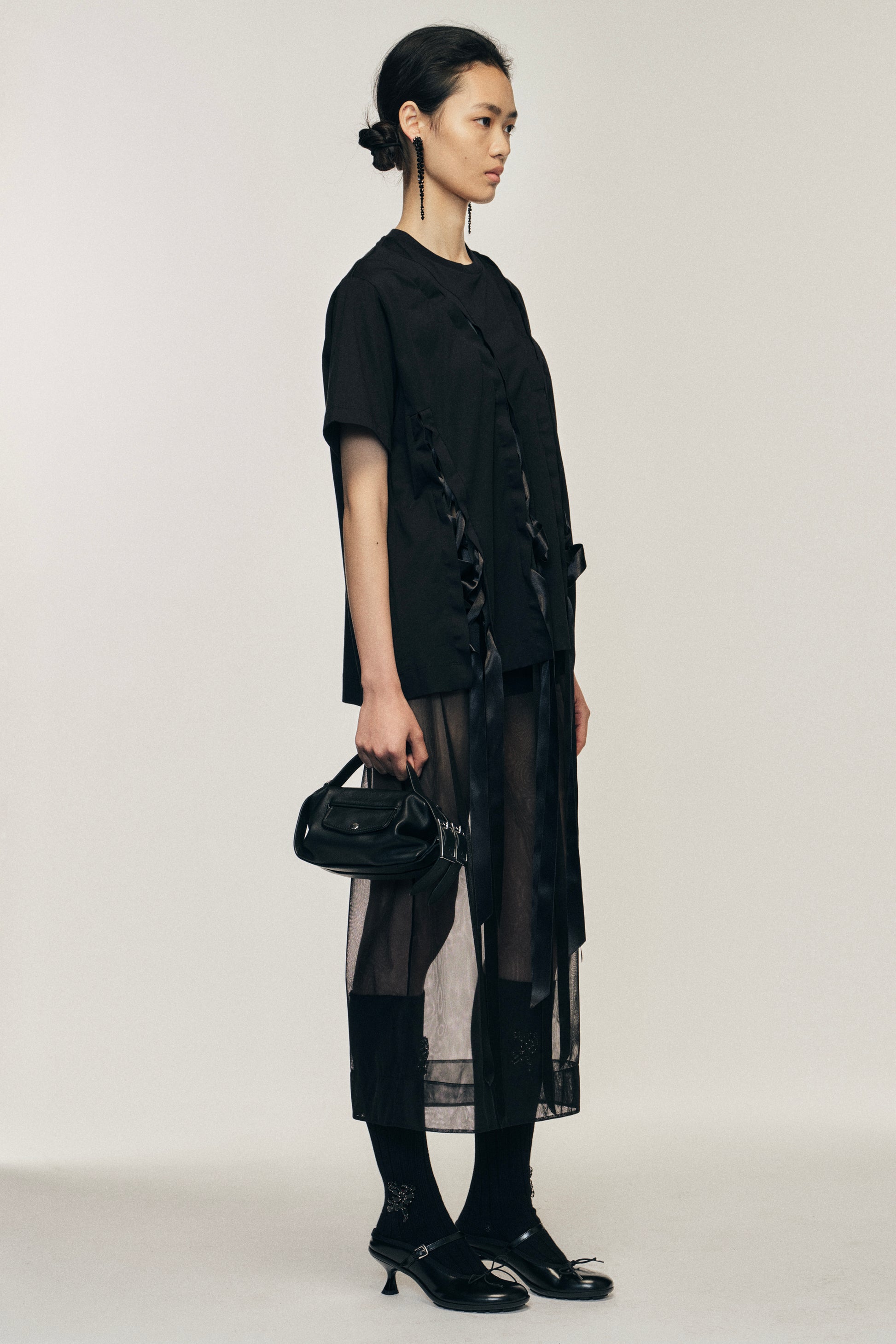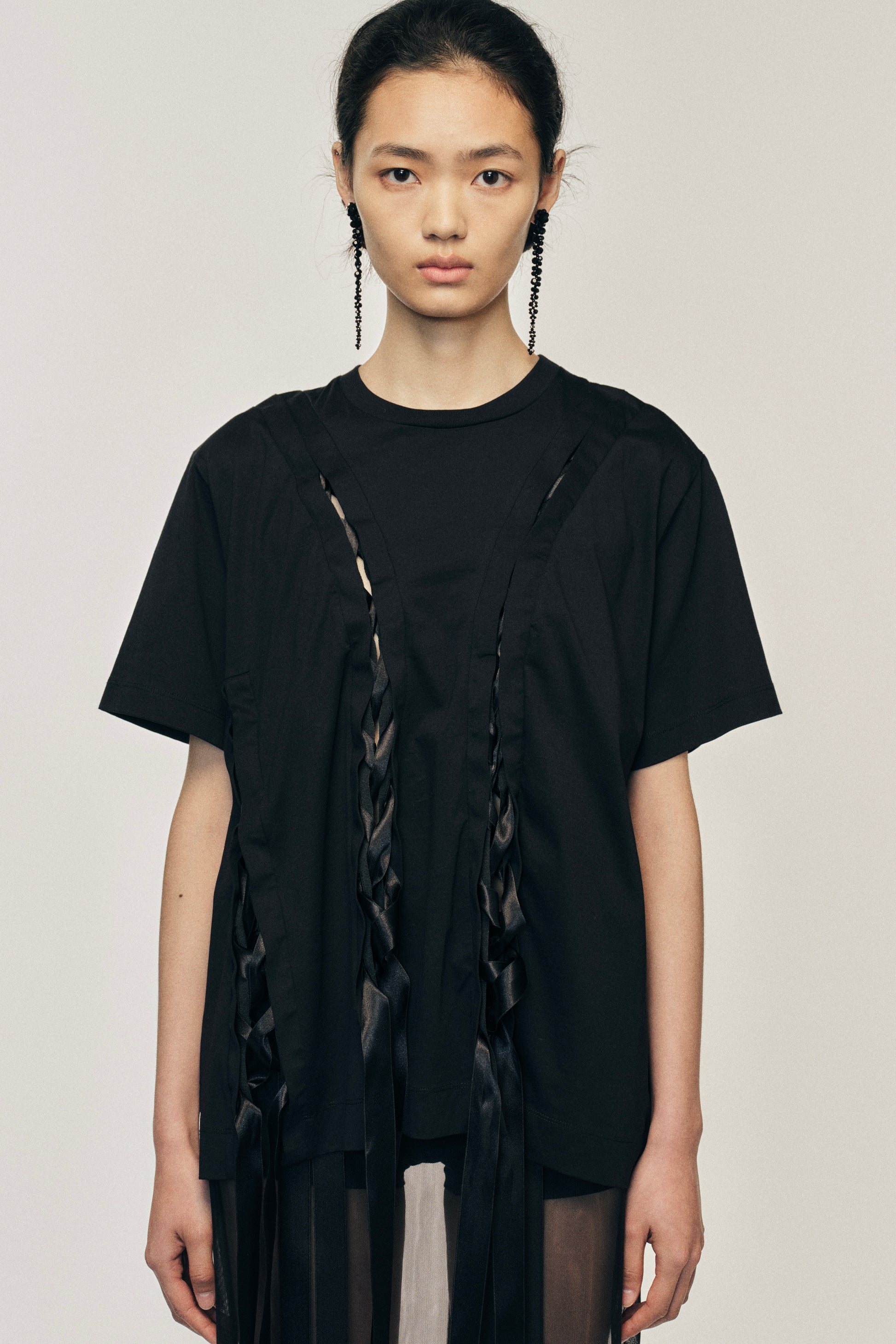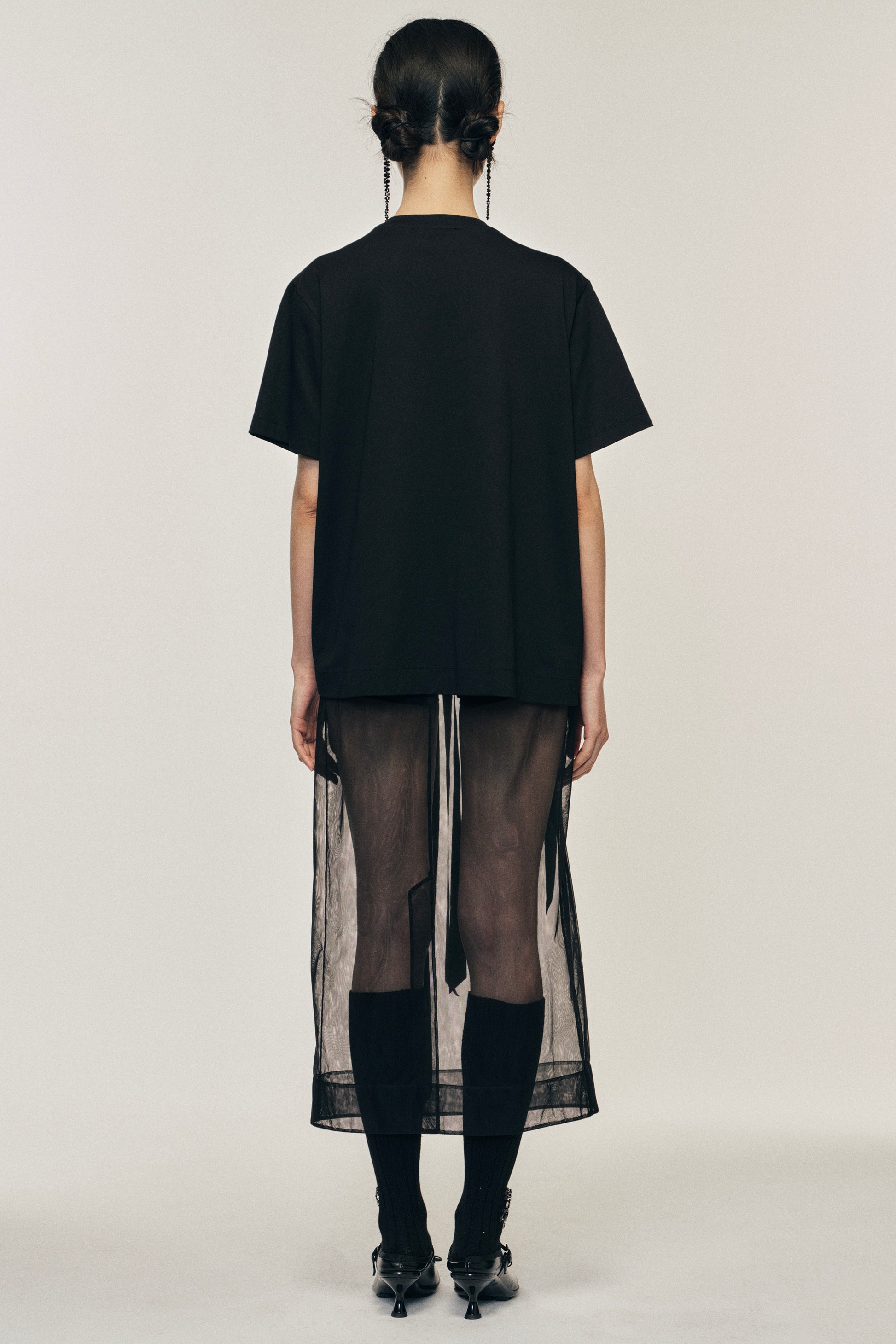 This t-shirt has an oversized fit and features a distinctive ribbon at the front, they hang down giving this style a deconstructed look. The model is wearing this style with the Sheer Bow Ribbon Pencil Skirt.