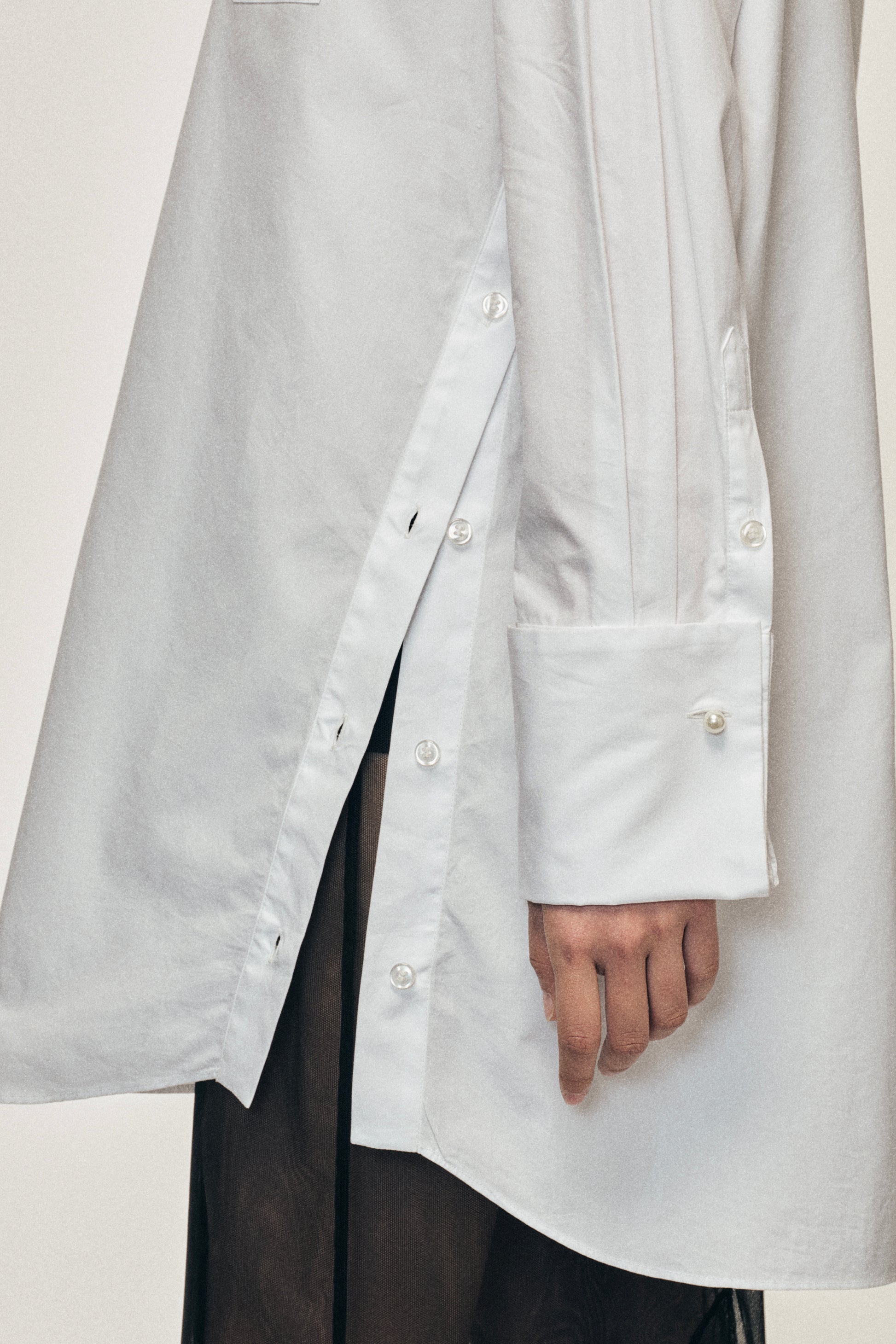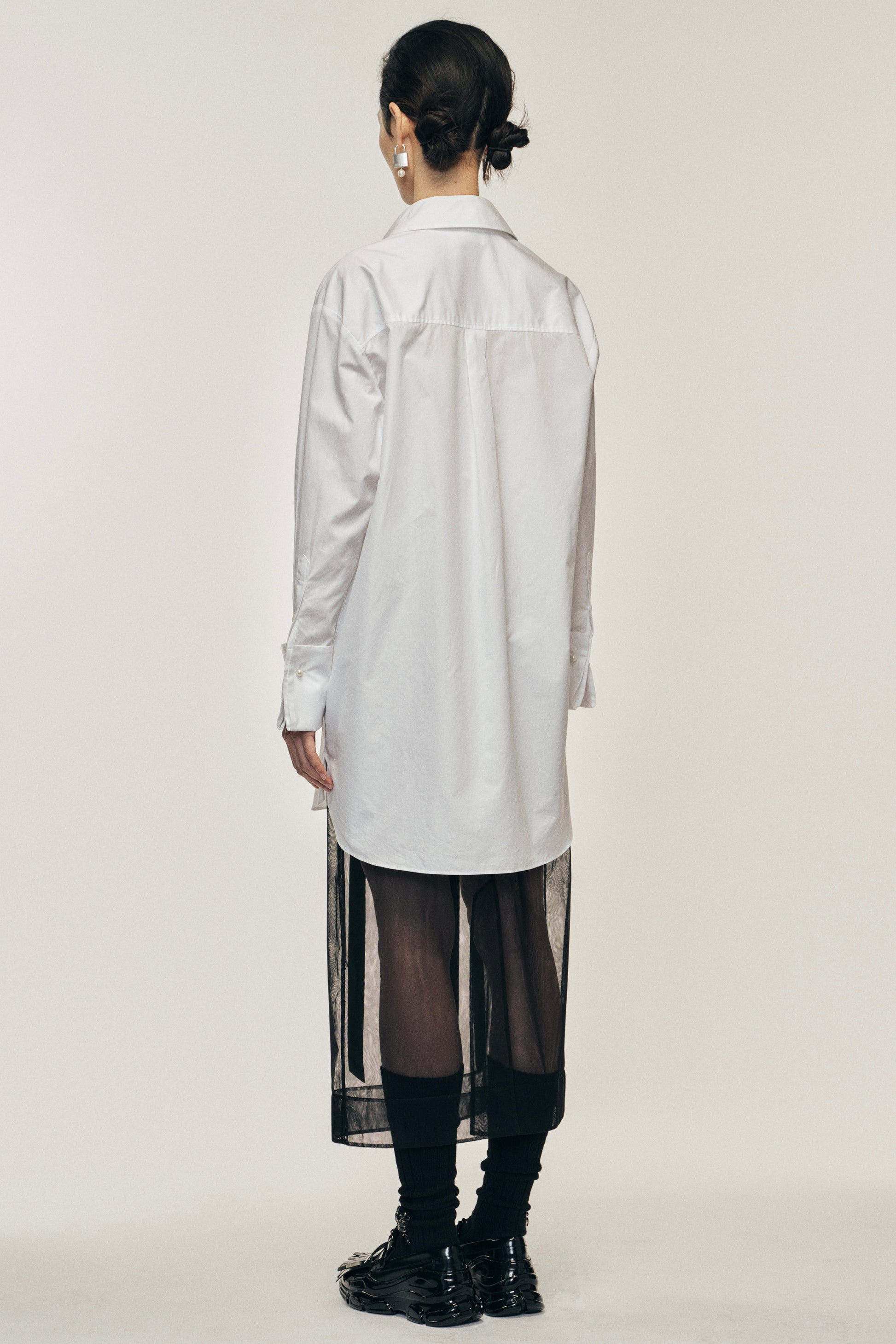 An oversized masculine cotton poplin shirt, it becomes a versatile staple that can be styled in various ways. It features a french cuff with a pearl button. The model is wearing this style with the Sheer Bow Ribbon Pencil Skirt.