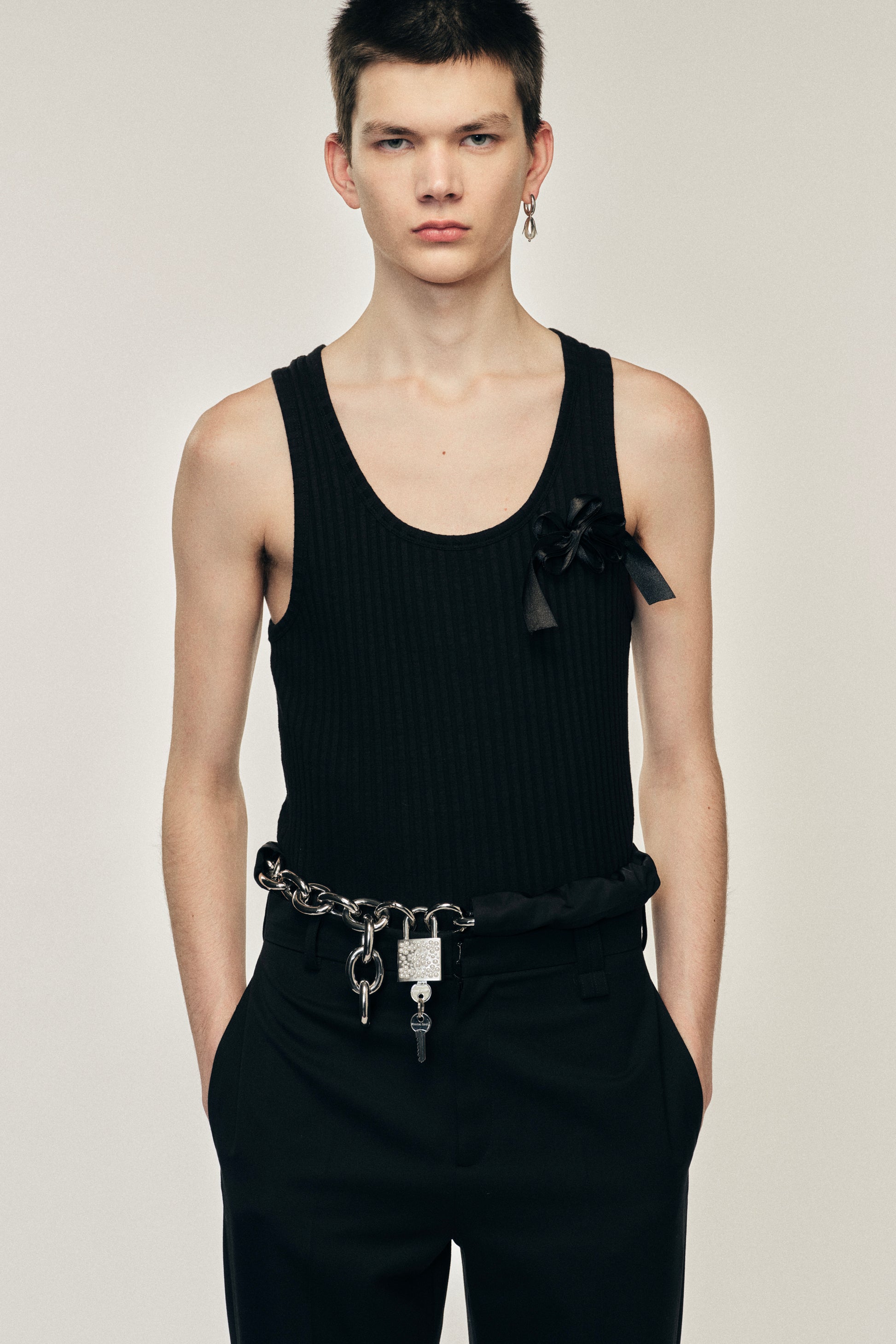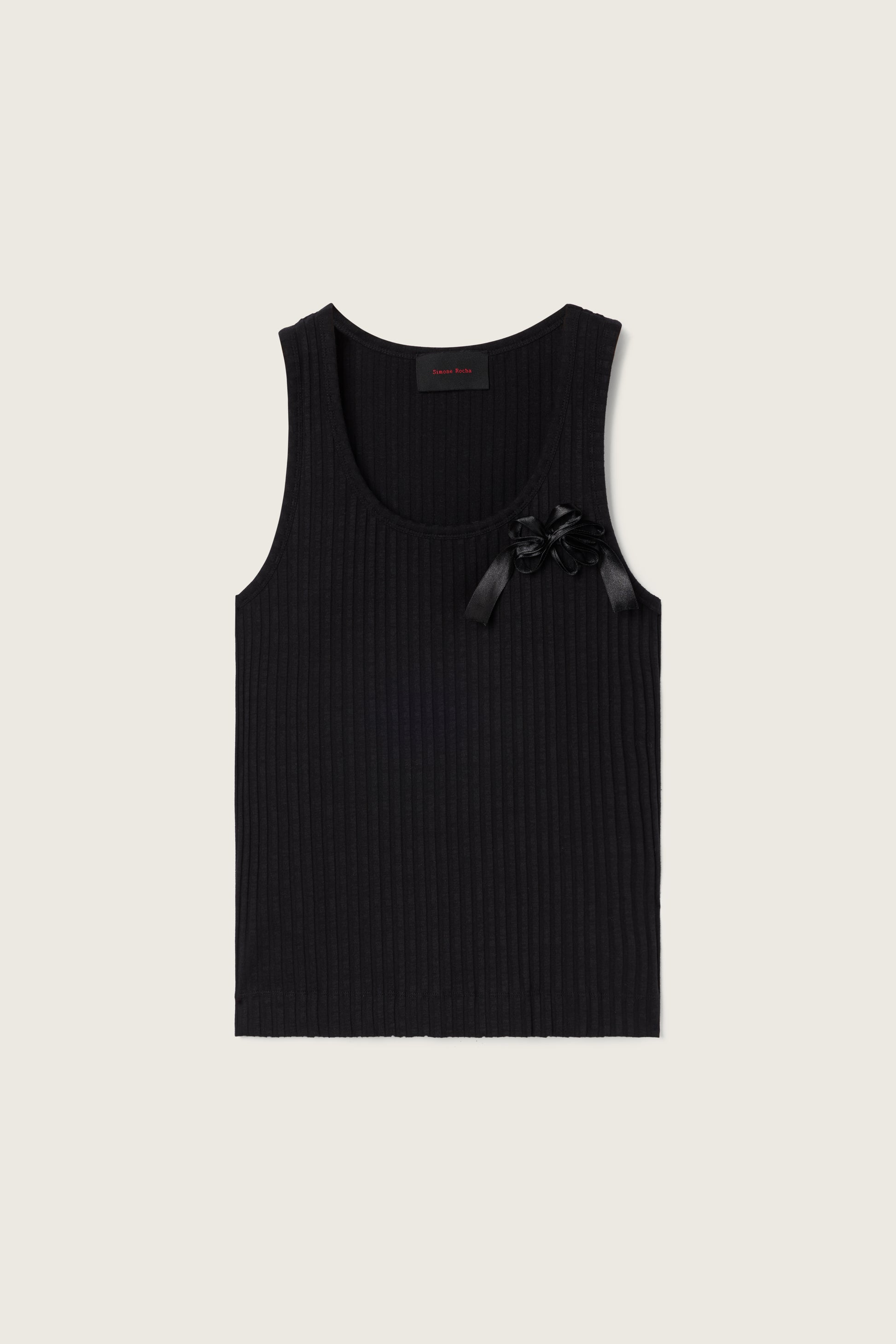 This vest is comprised of a ribbed jersey and features a tonal ribbon appliqué at the chest folded into the shape of a daisy. It can be styled under classic jackets like the runway looks.