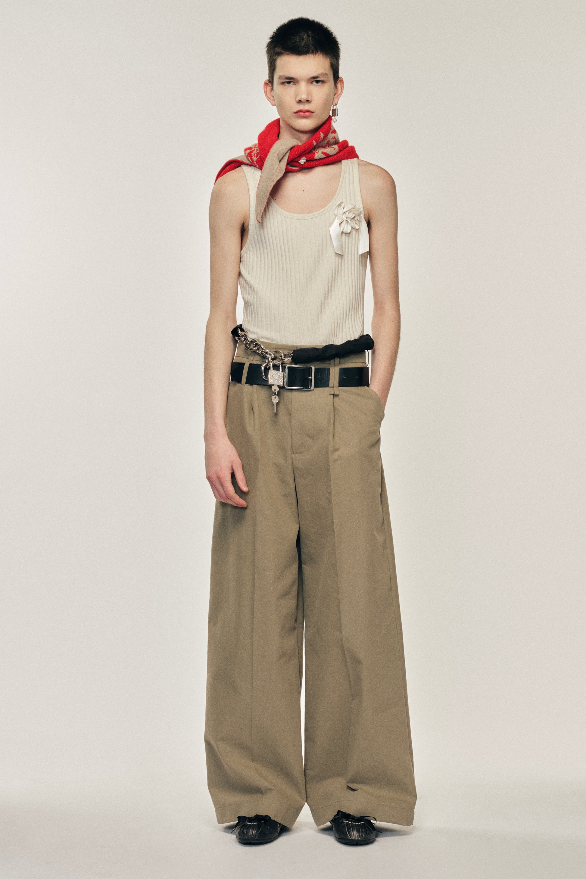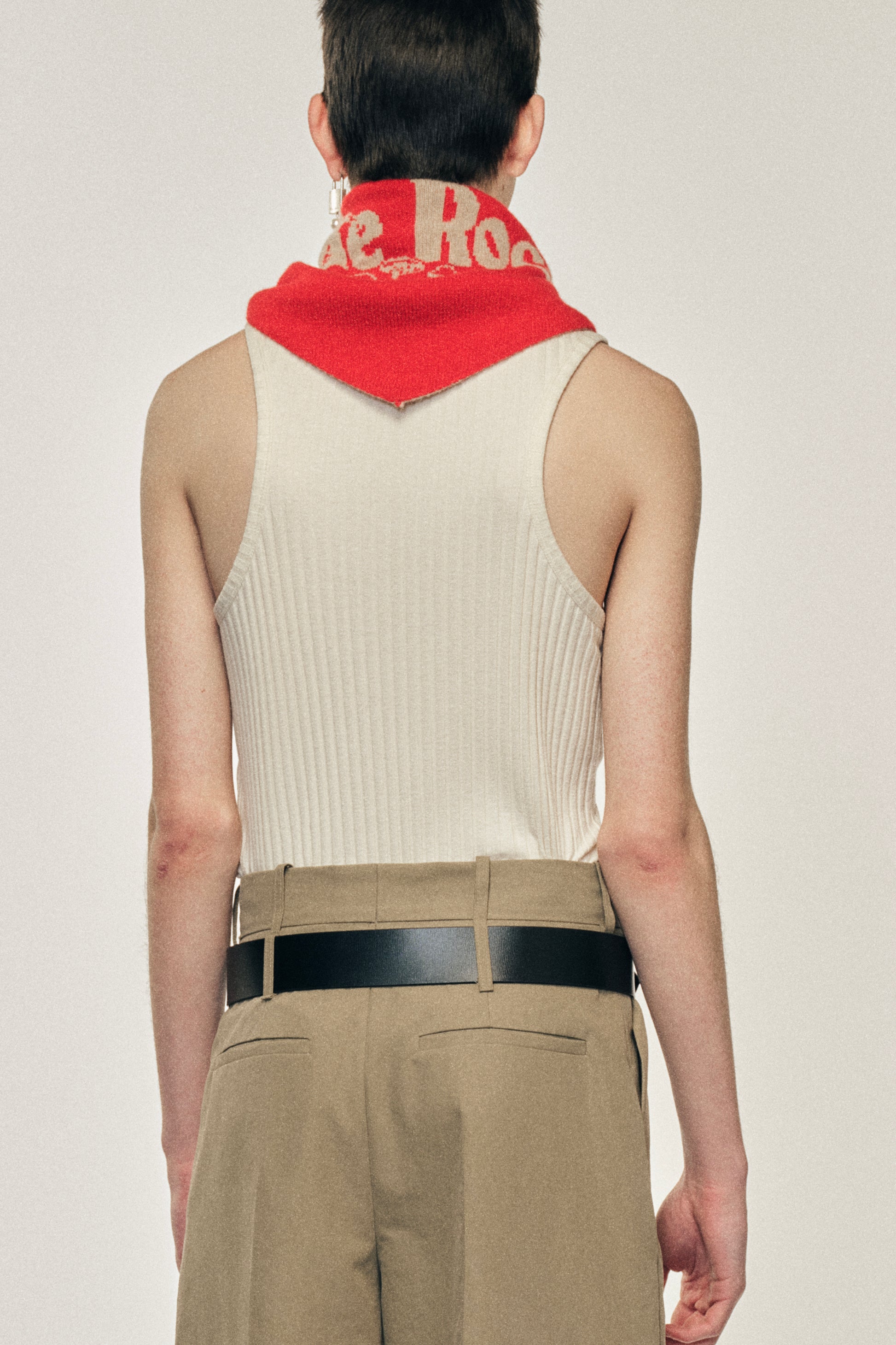 This vest is comprised of a ribbed jersey and features a tonal ribbon appliqué at the chest folded into the shape of a daisy. It can be styled under classic jackets like the runway looks.