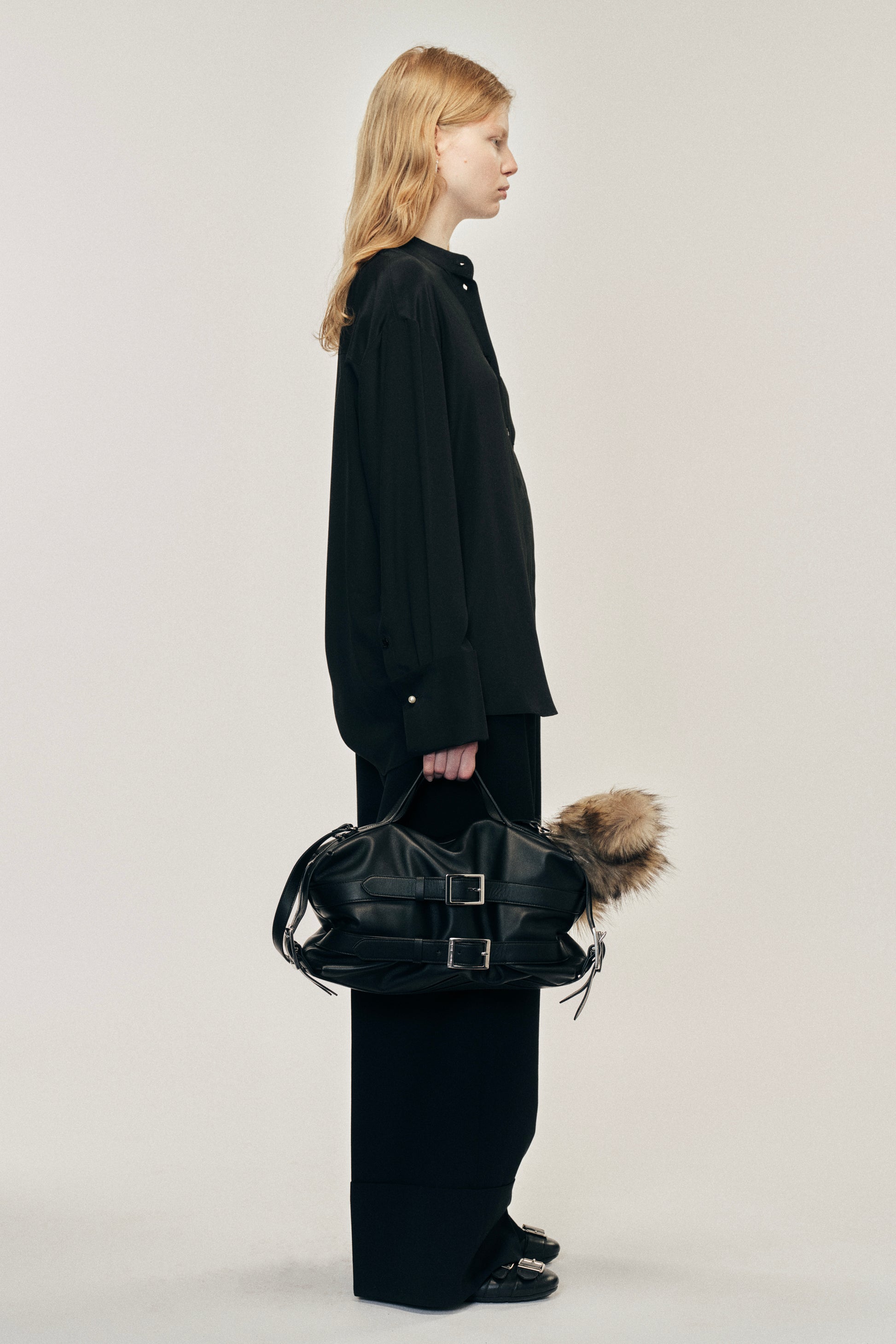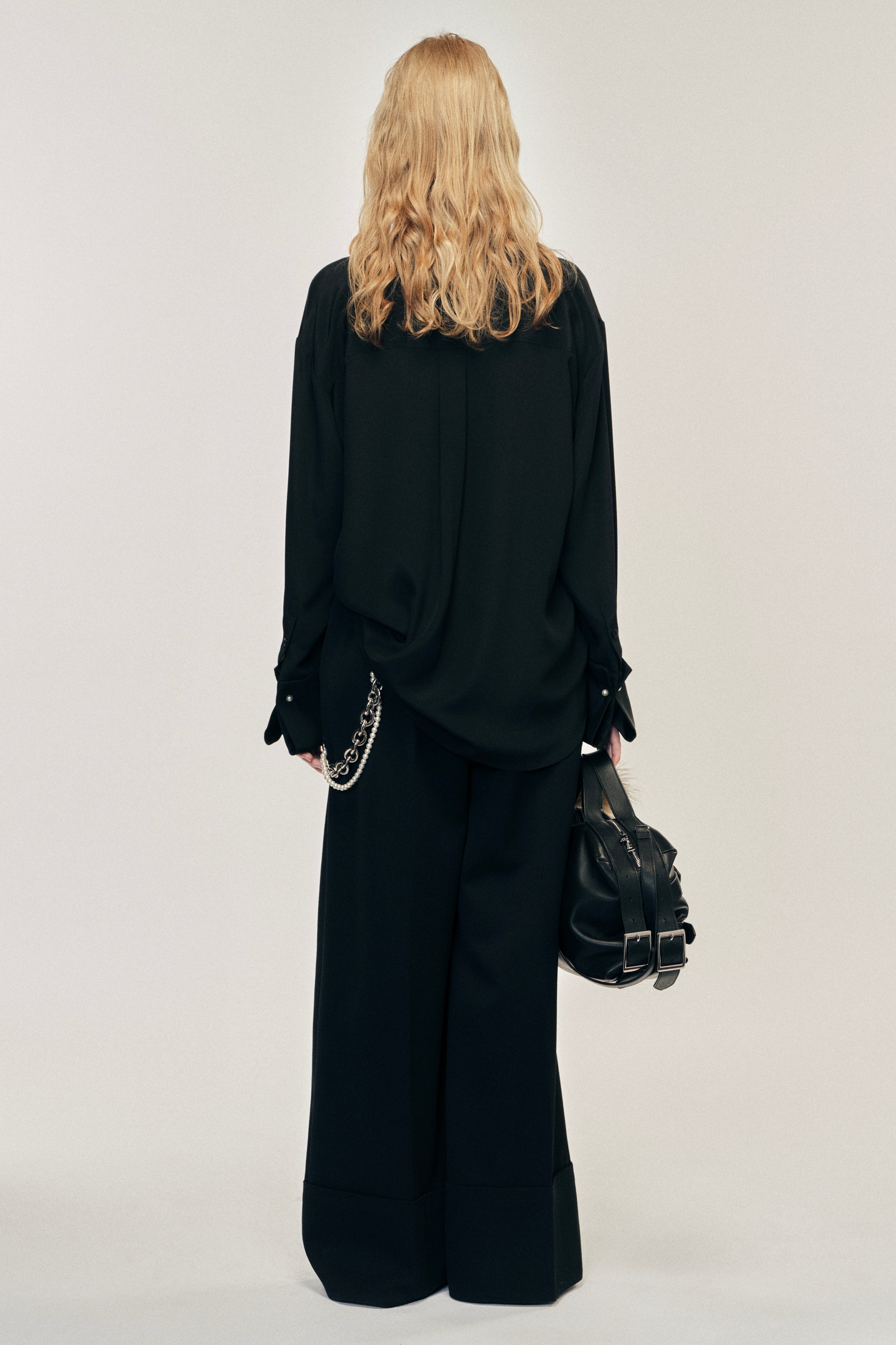A new take on a classic shirt, this minimalist band collar design features elongated cuffs with a pearl button detail. The model is wearing this style with the Multi Belt Loop Wide Leg Trousers.