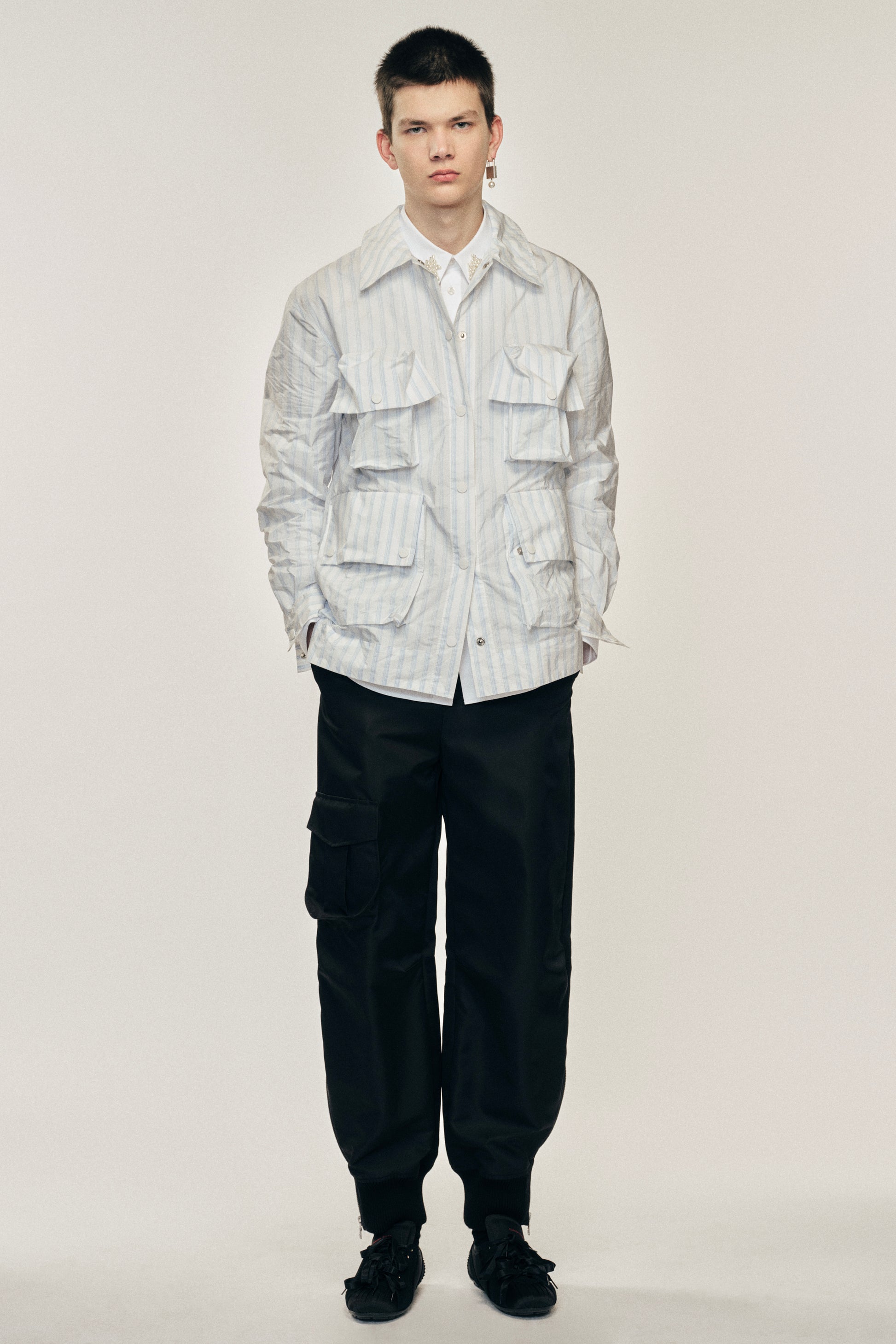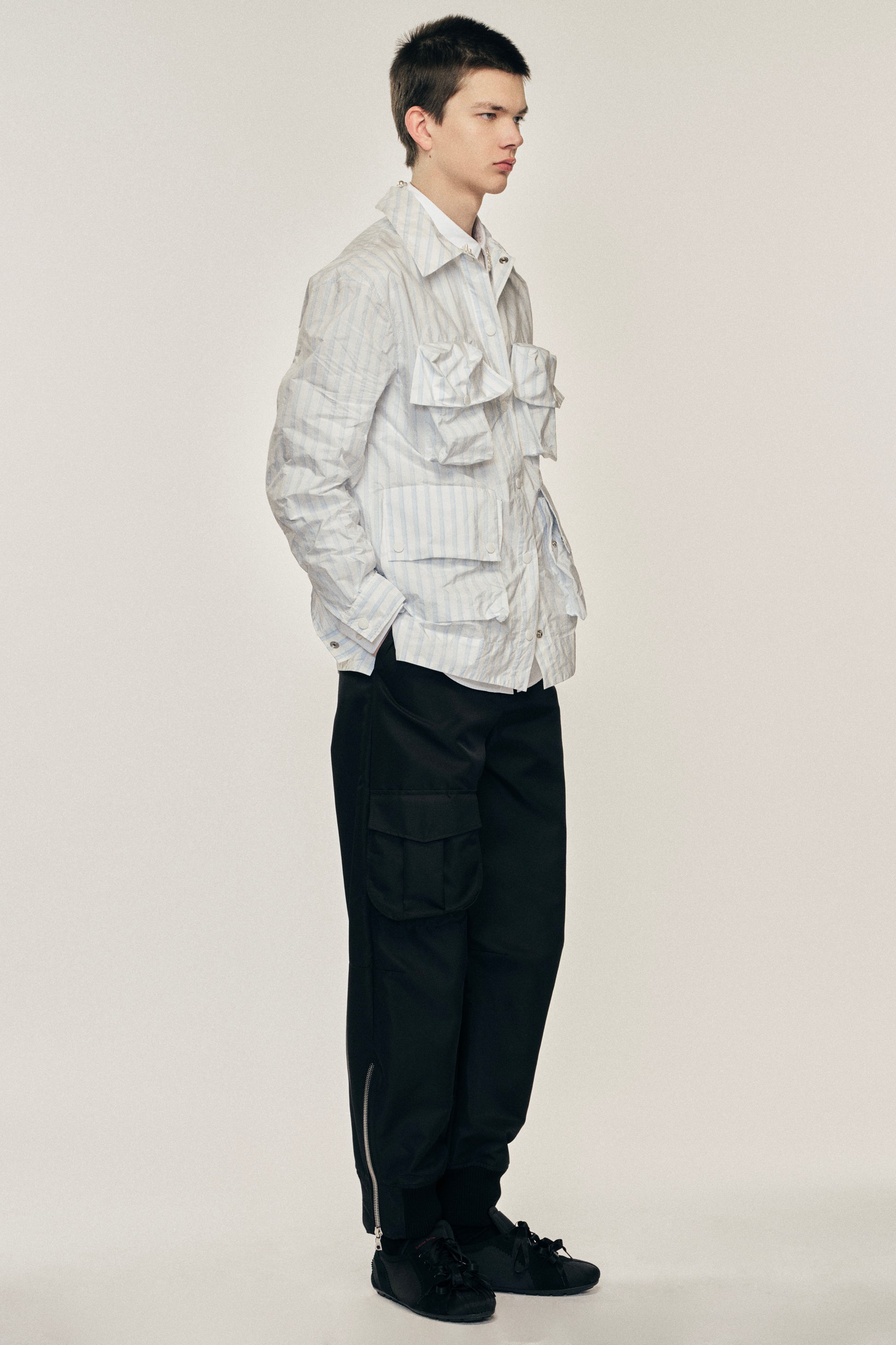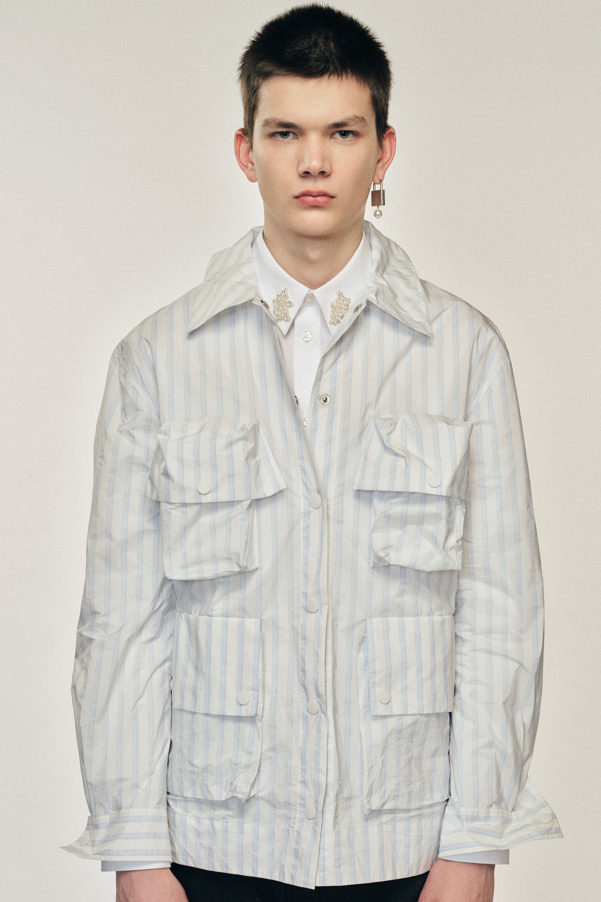 A lightweight utility overshirt featuring flap pockets at the front. It is made of a crinkle fabric that utilises wear to give it more texture. The model is wearing this style with the Beaded Flower Cluster Classic Shirt & Ankle Zip Pocket Trousers.