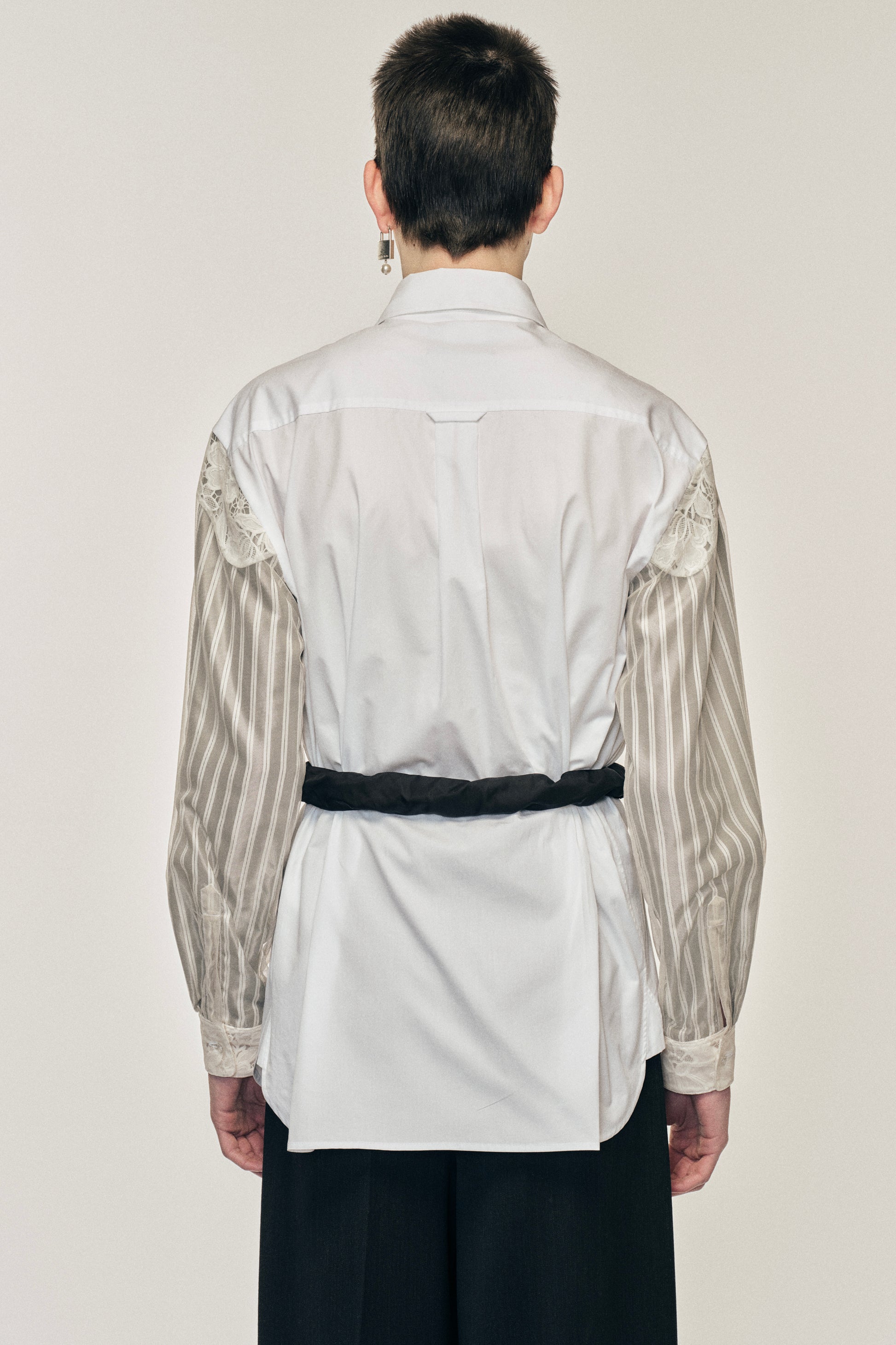 This shirt features a unique design with a distinctive contrasting sleeve with lace and tulle patchwork details. This piece beautifully blends masculine and feminine elements for a modern feel. The model is wearing this style with the Sleeve Chain Padlock Belt.