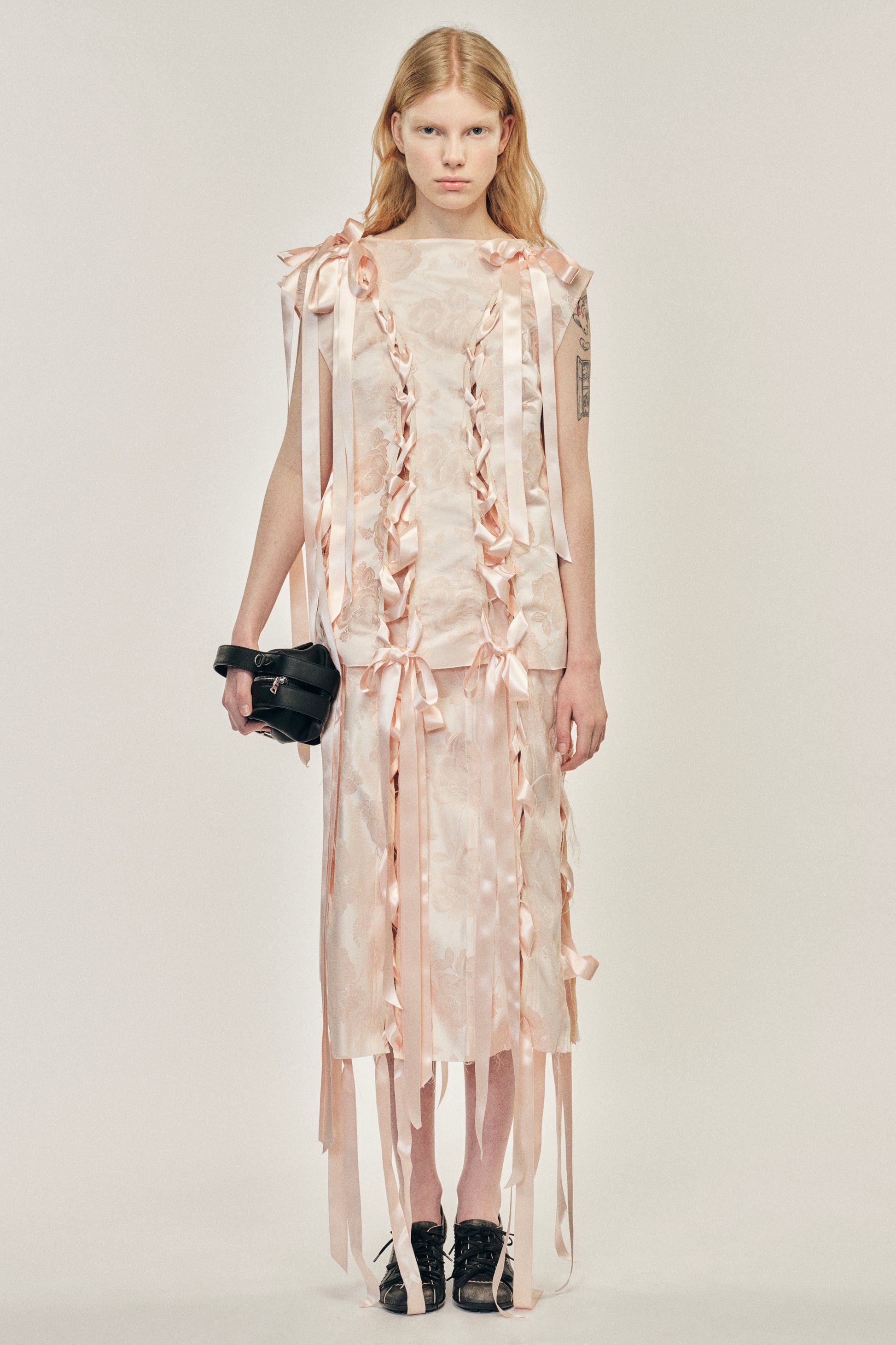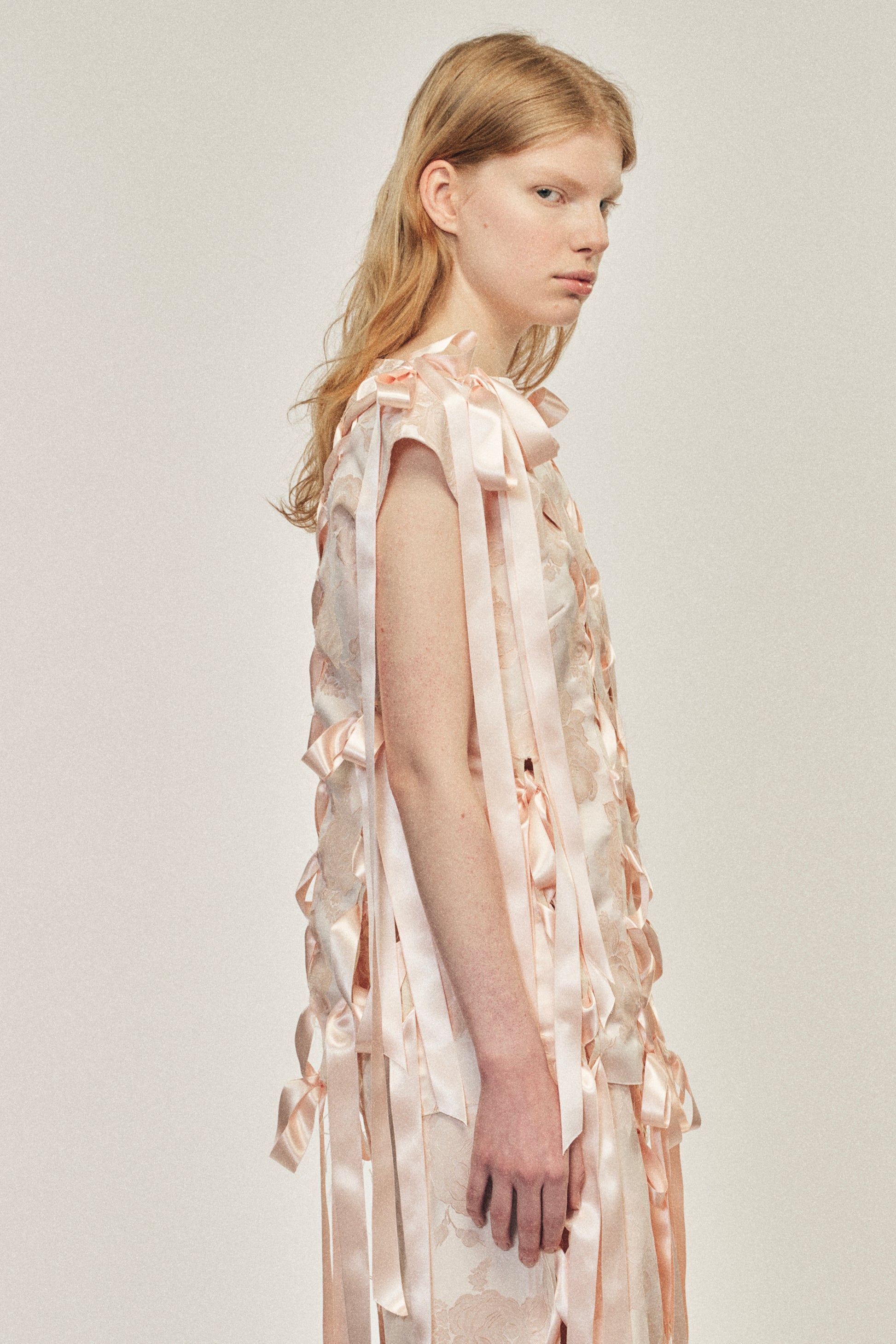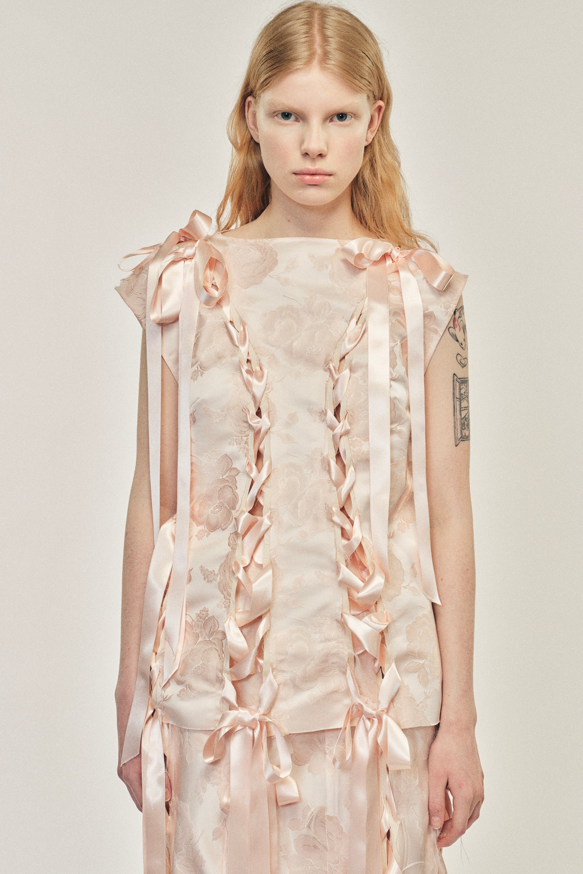 A delicate sleeveless blouse in a soft pink floral brocade. Satin ribbons are interlaced and seemingly braided throughout the garment making for a sophisticated interplay between the structured shape and romantic details. The model is wearing this style with the Unraveling Ribbon Brocade Skirt.