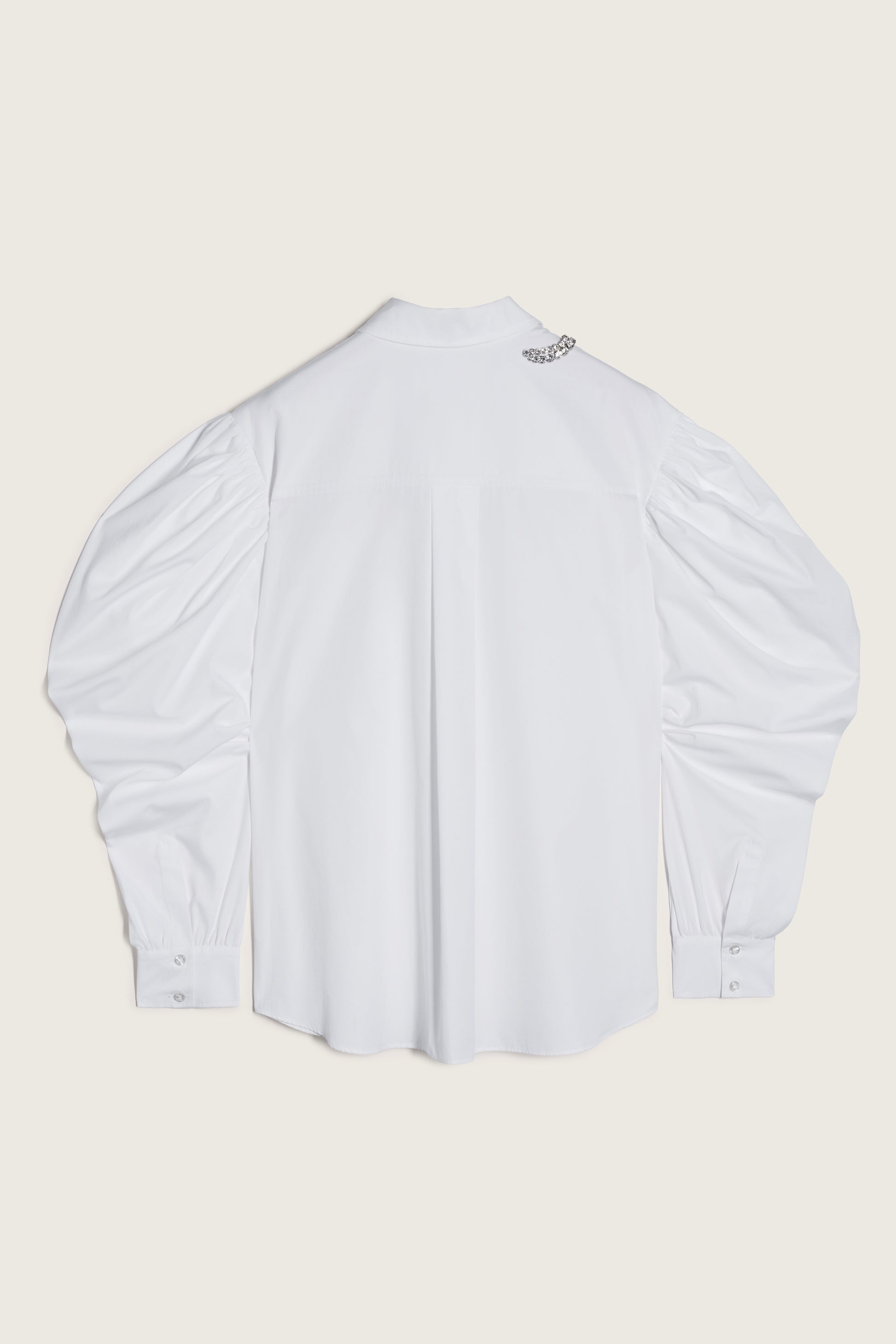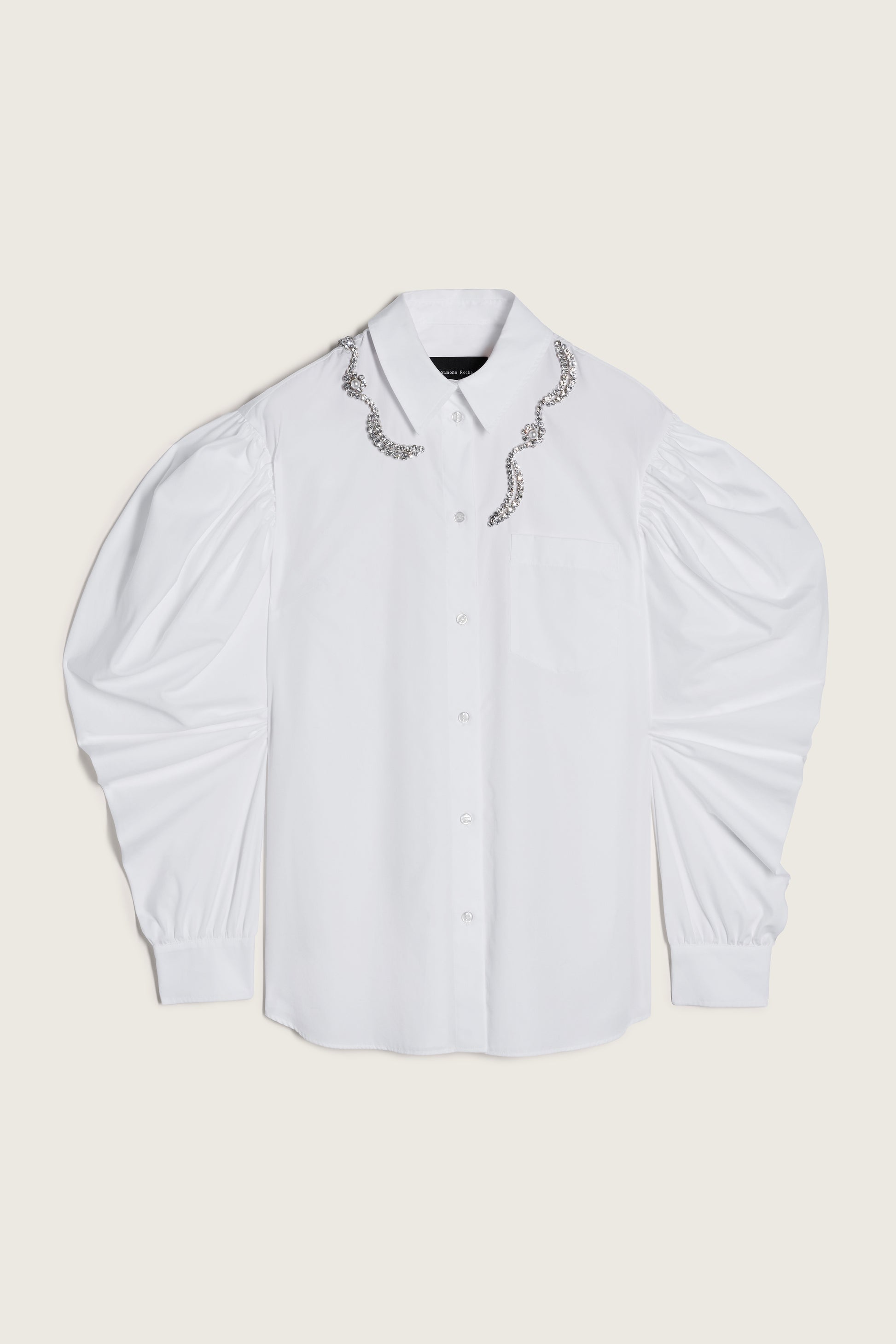 A cotton poplin shirt with pointed collar and gathered, draped sleeves. Crystal and faux pearl embellishments update the neckline for a signature look.