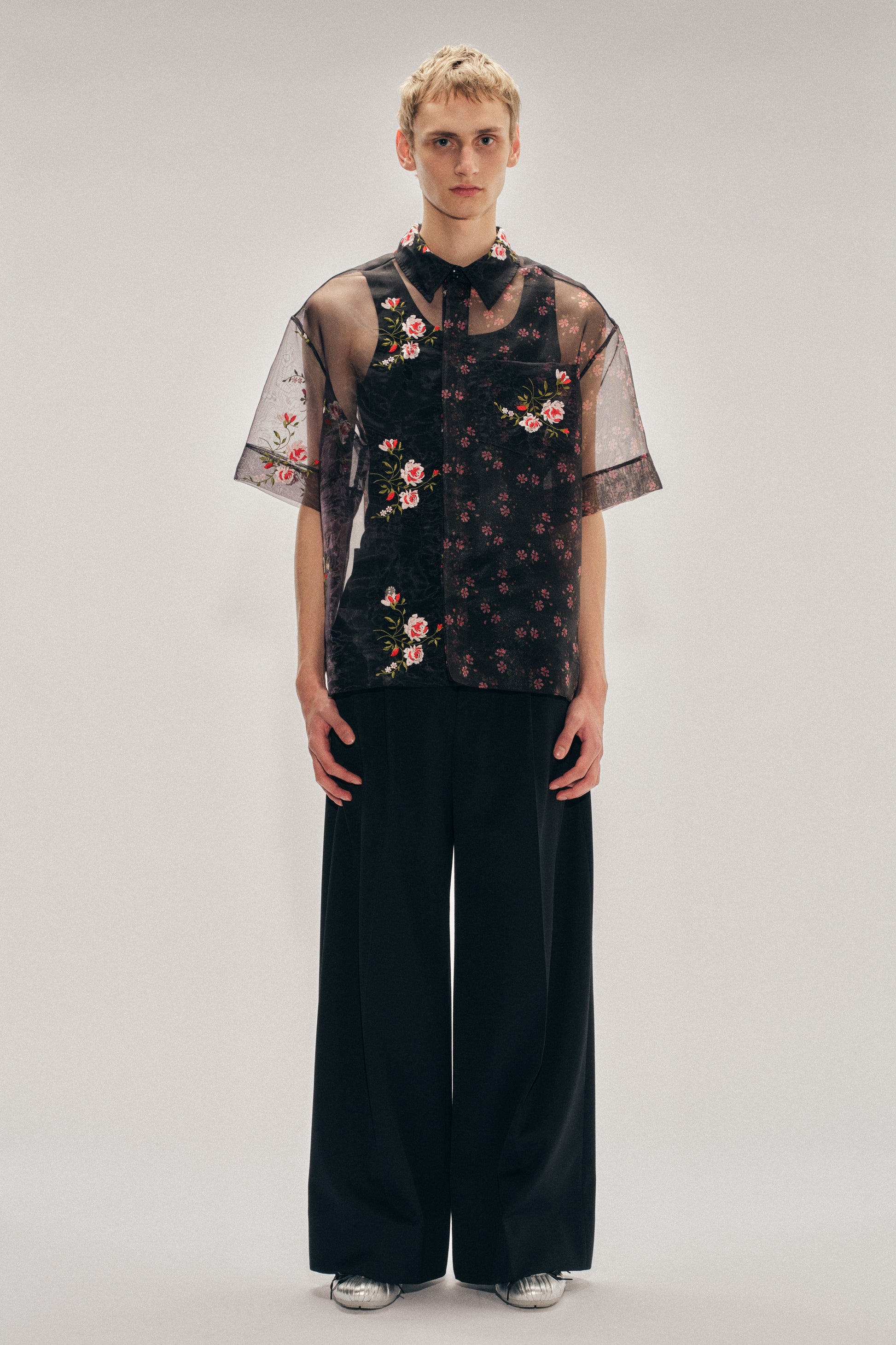Boxy buttoned shirt crafted from a patchwork of this season's floral-printed and embroidered organza. Layer to enhance its multi-textured effect.
