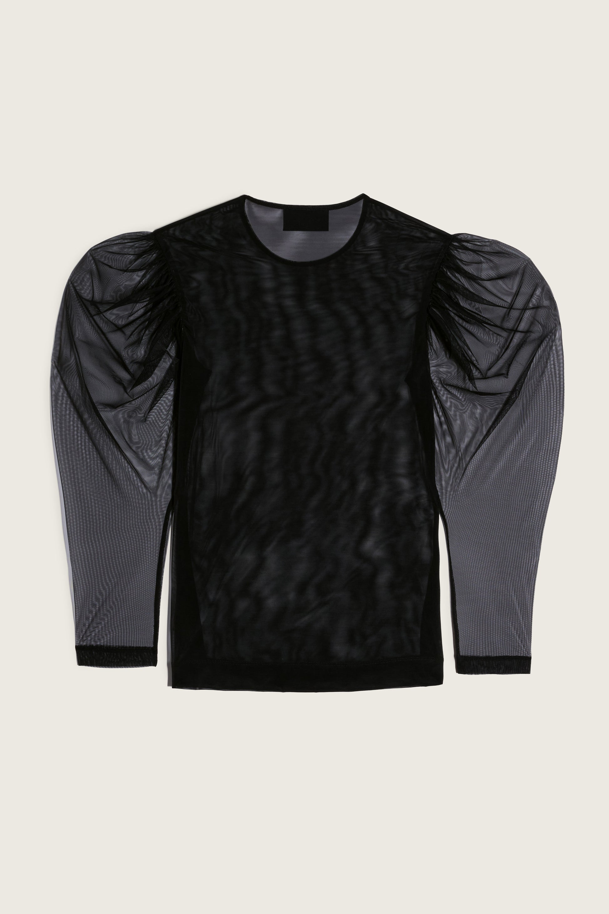 Fitted sheer top in ballet tulle, its silhouette is defined by puffed shoulders and draped sleeves.