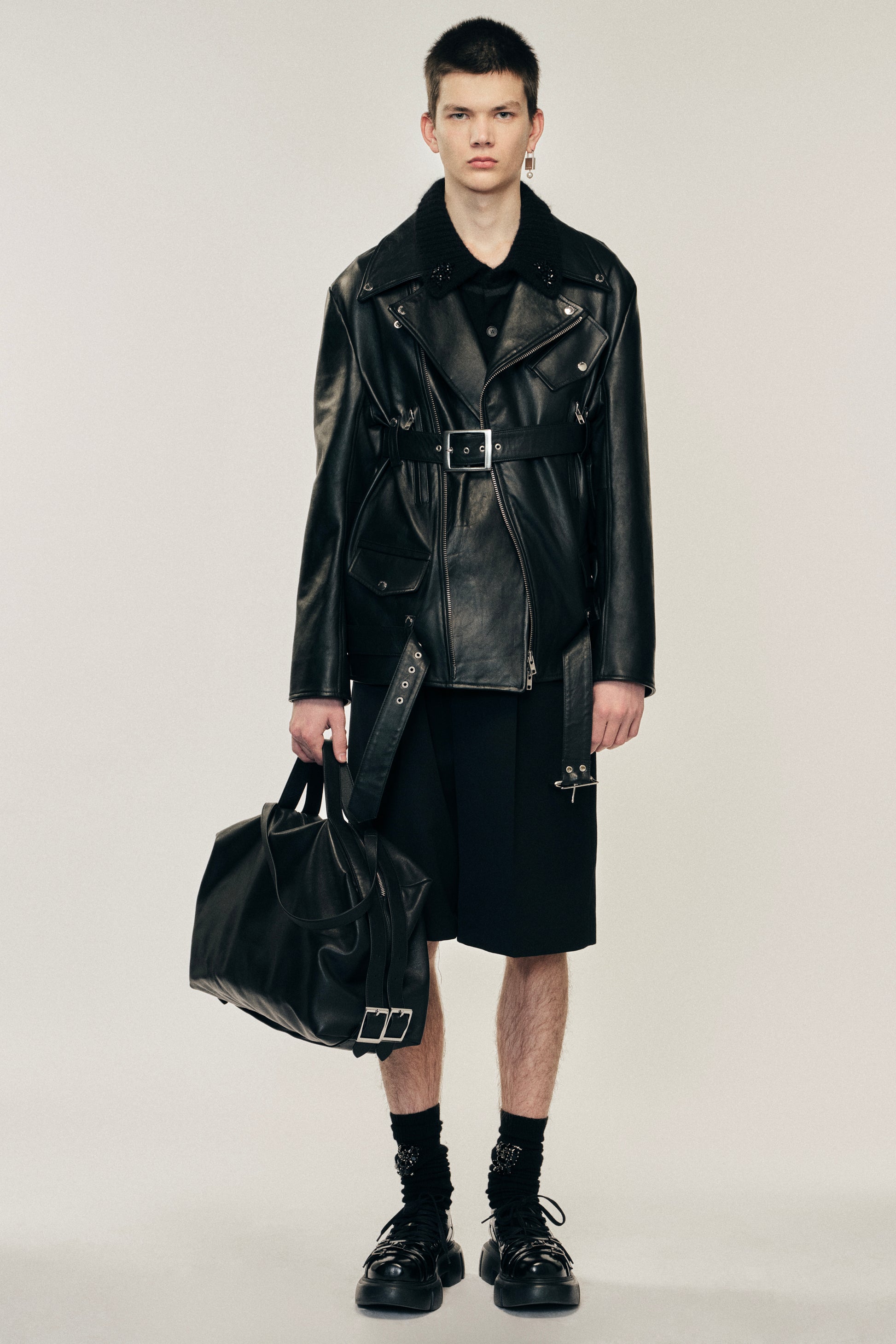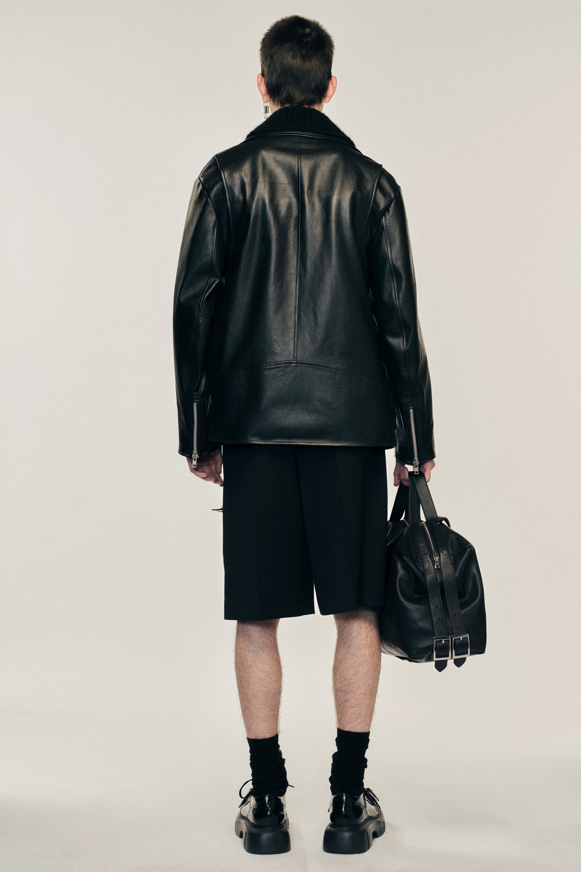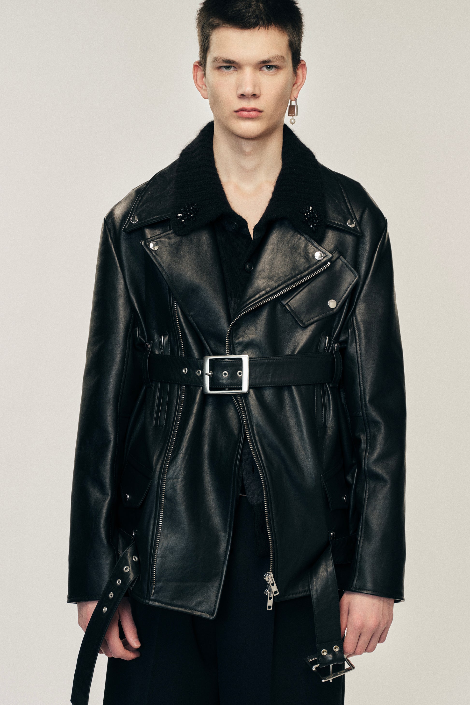 The belted biker style jacket features two distinctive belt details at the front, one at the centre for a more cinched silhouette. The cut is slightly oversized with a structured shape. The model is wearing this style with the Embellished Fuzzy Collar Rugby Jumper & Wide Leg Multi Belt Loop Shorts.
