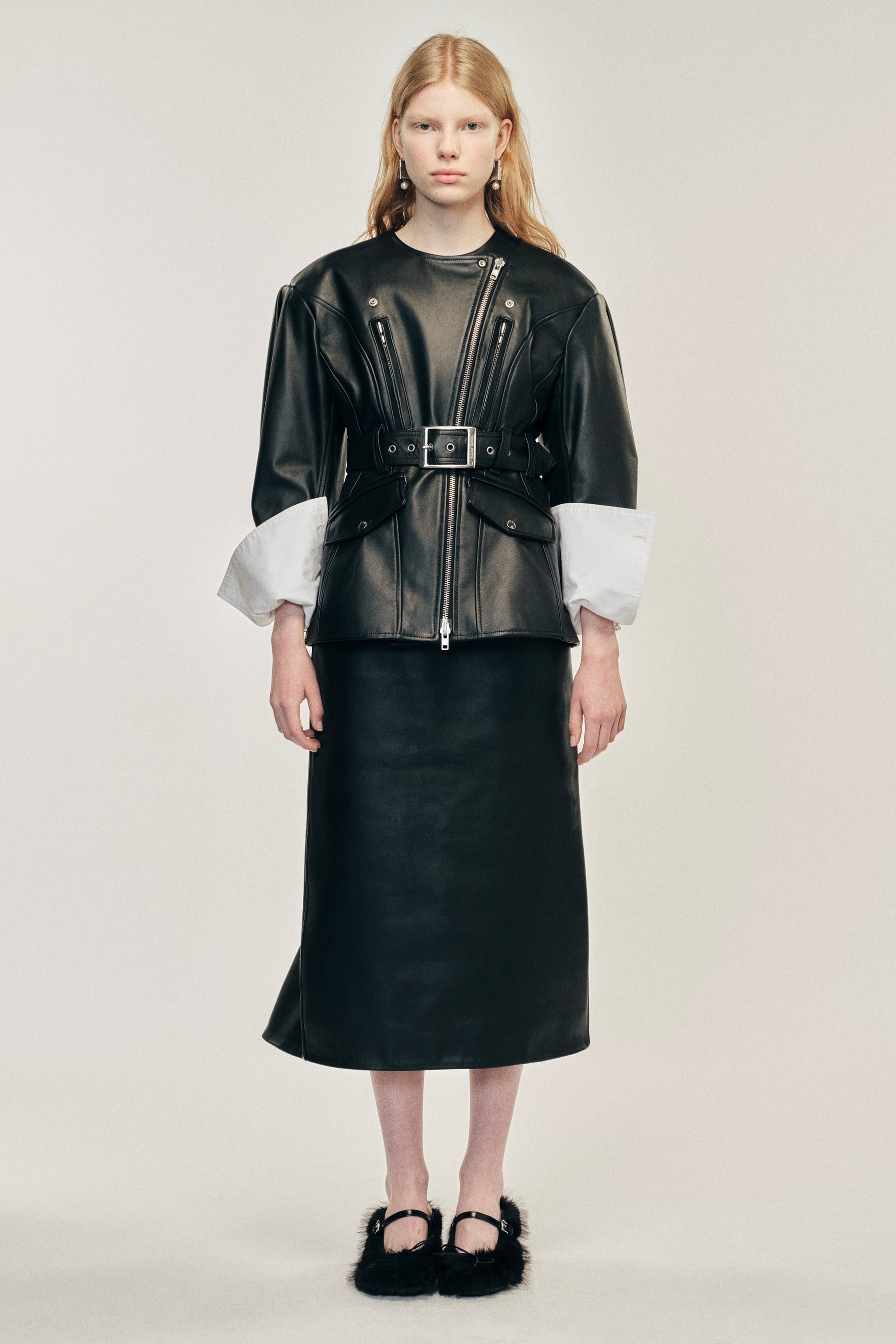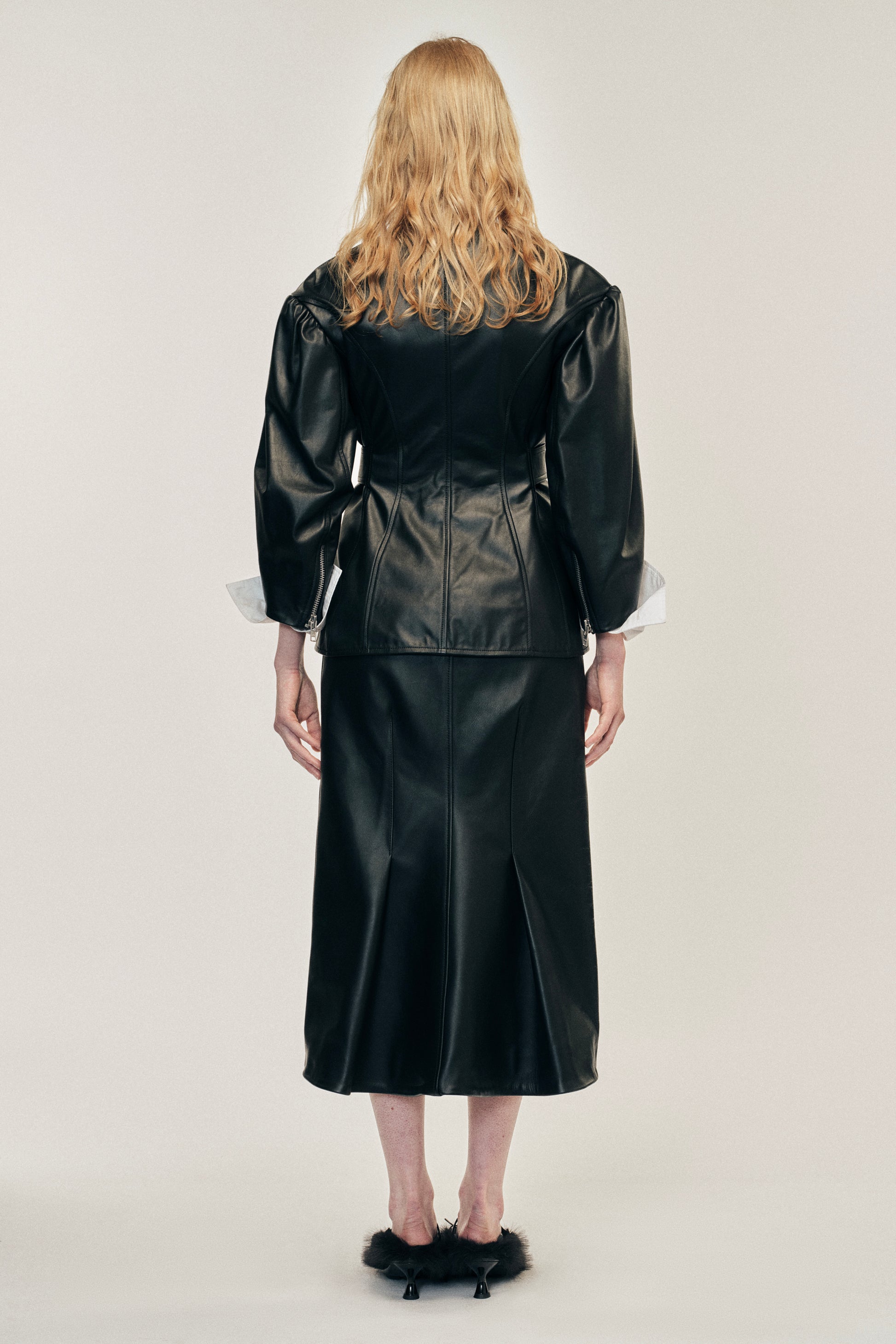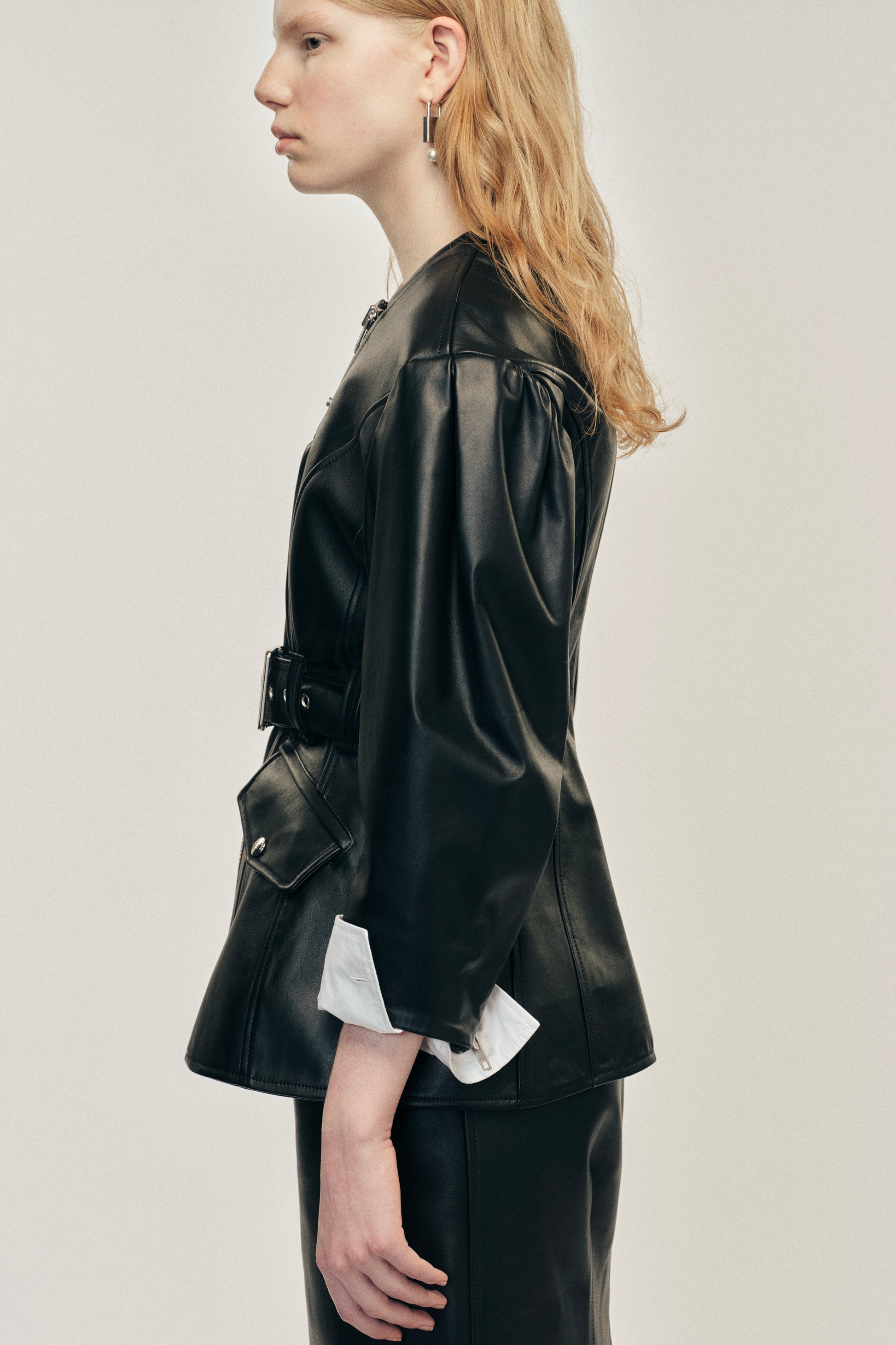 A cropped length jacket made from a structured leather, it features an integrated belt detail at the centre for a more cinched silhouette. The model is wearing this style with the Multi Belt Loop Kick Back Skirt.
