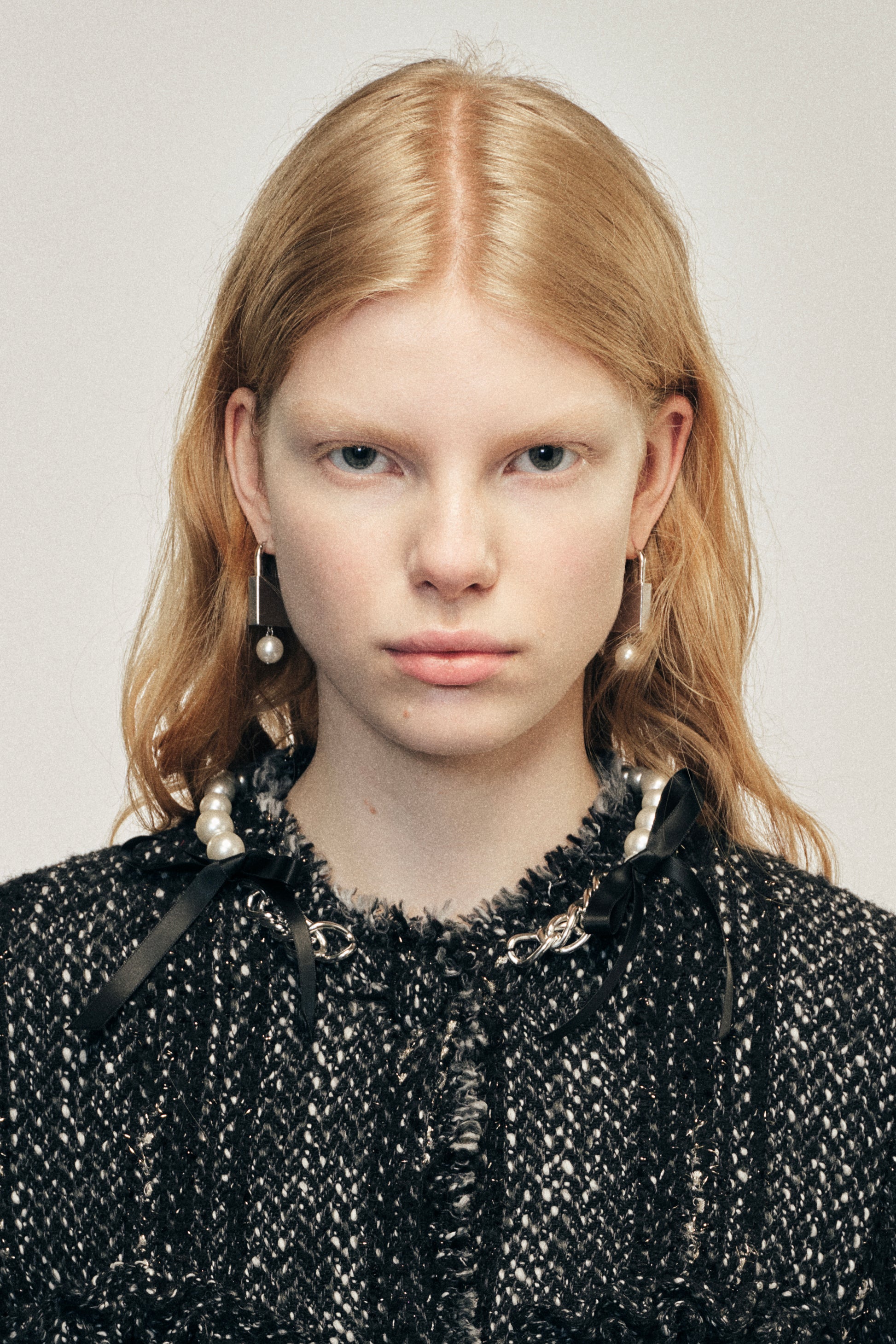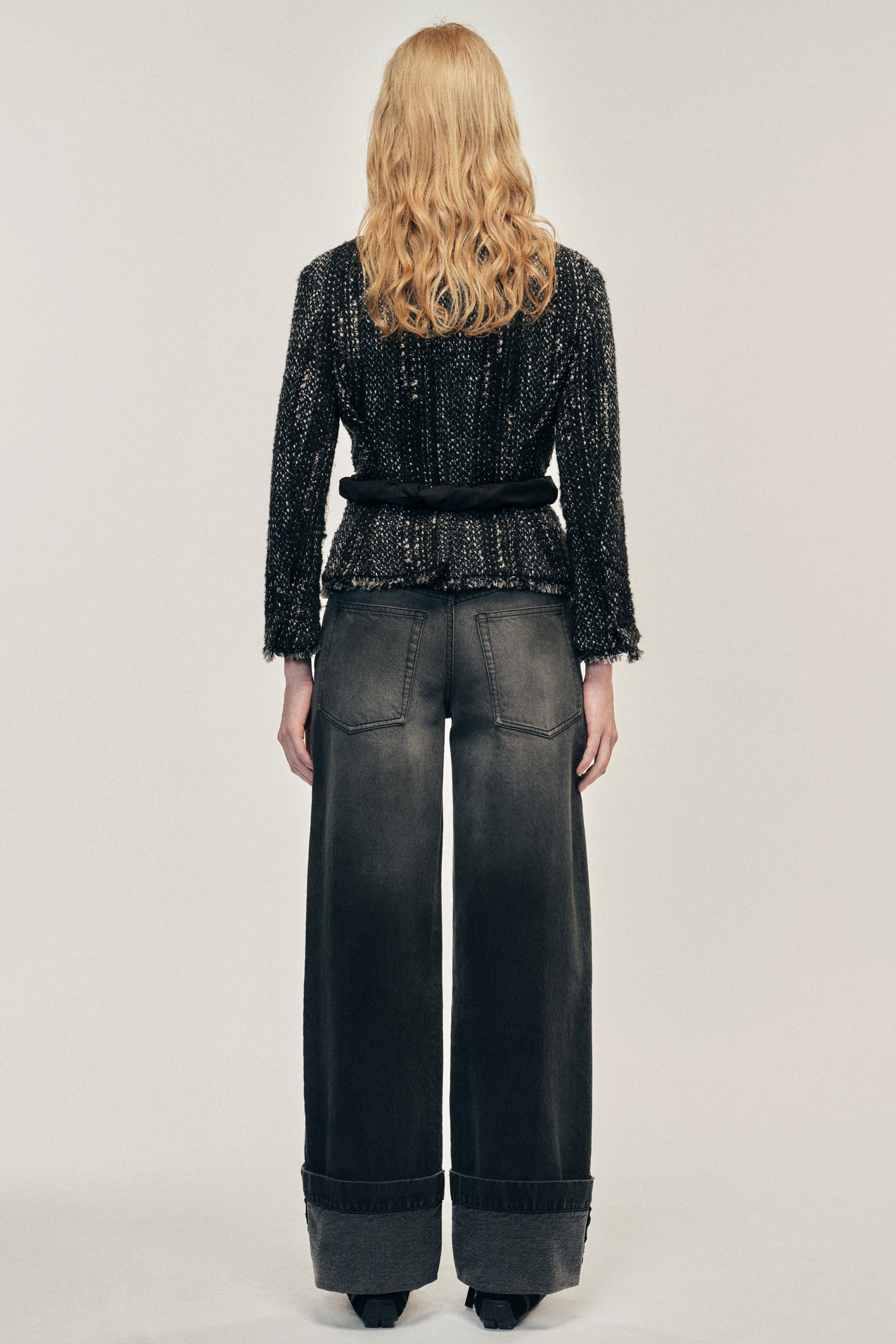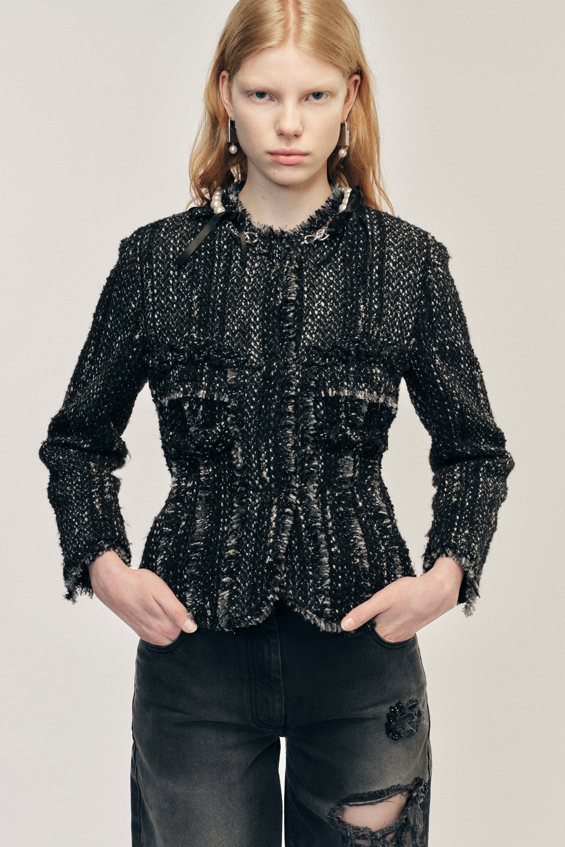 A sophisticated tweed jacket woven with a distinctive bouclé finish, it has a tailored silhouette that cinches at the waist. Frayed, fringe-like edges are found throughout, particularly at the bust. It has the seasonal pearl and chain beading along the neckline for a necklace effect. The model is wearing this style with the Embellished Straight Leg Jeans.