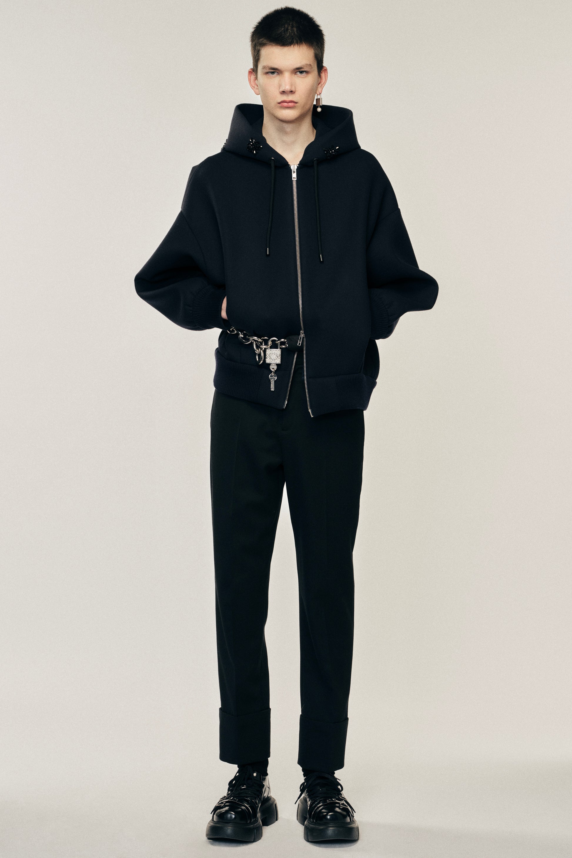 This hooded jacket combines sportswear elements with signature jet black embellishments found on the hood for a sophisticated everyday look. This style has an oversized silhouette for a relaxed fit. The model is wearing this style with the Cuffed Straight Leg Trousers.